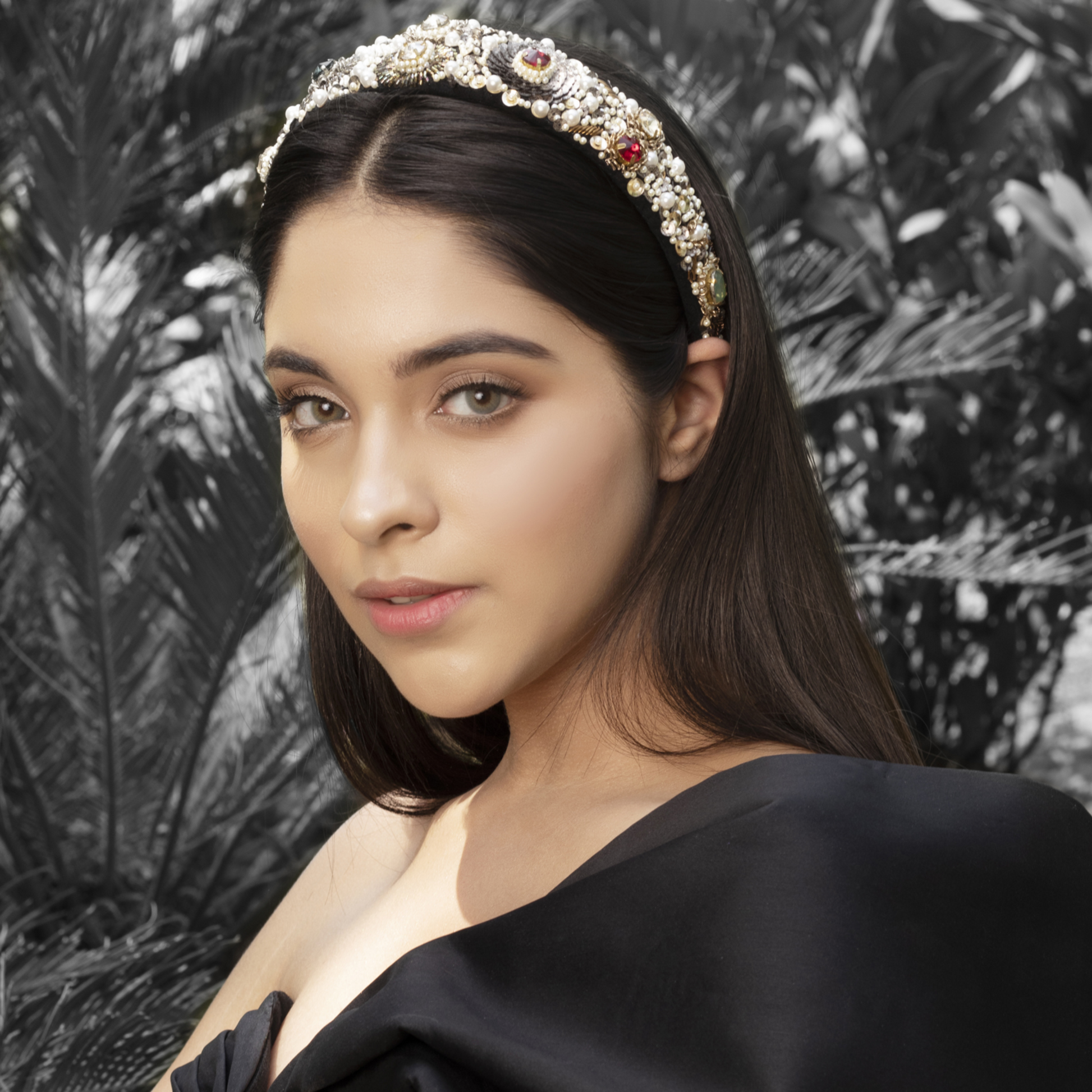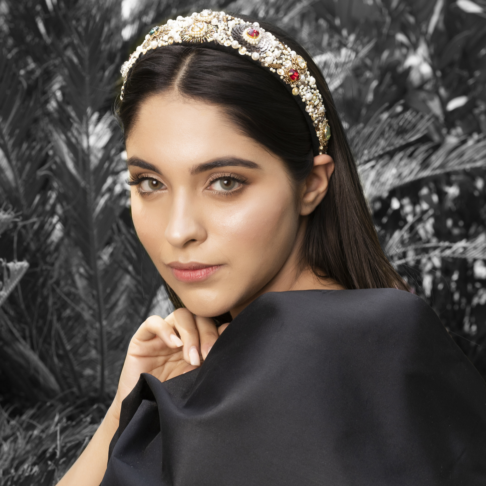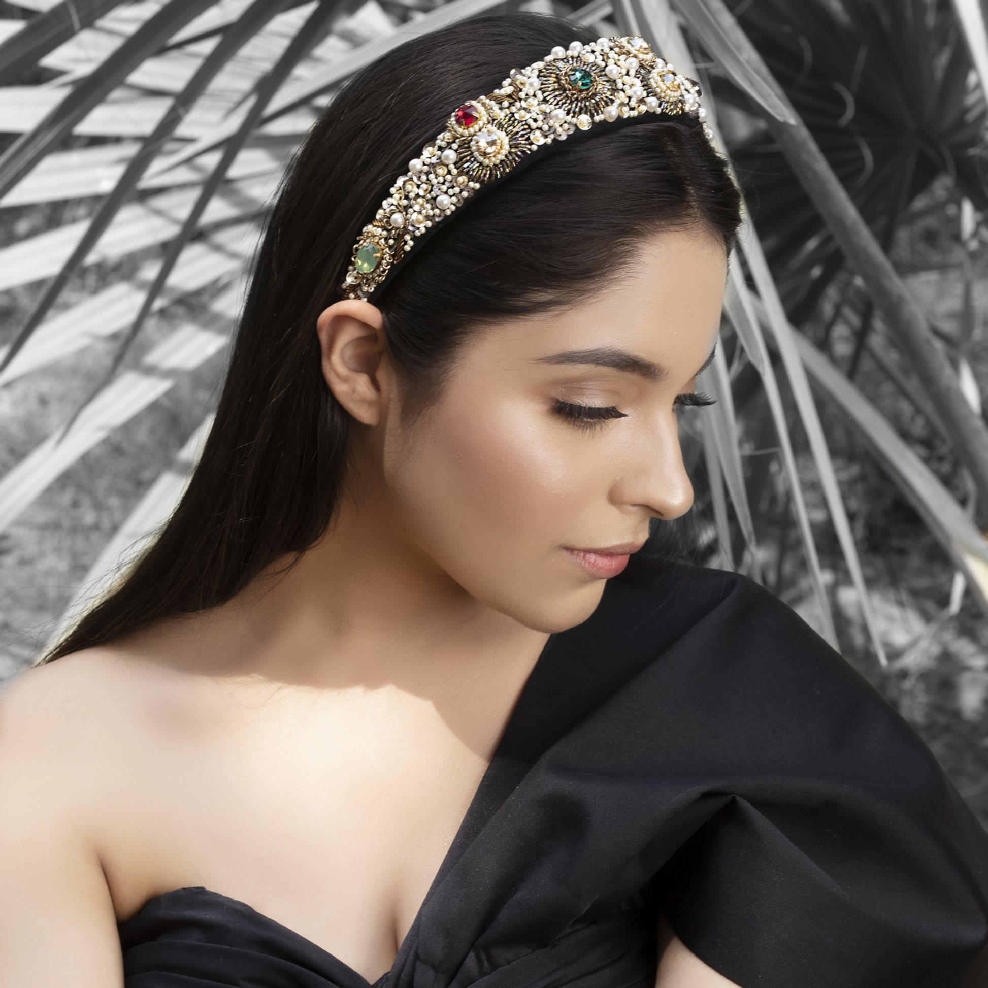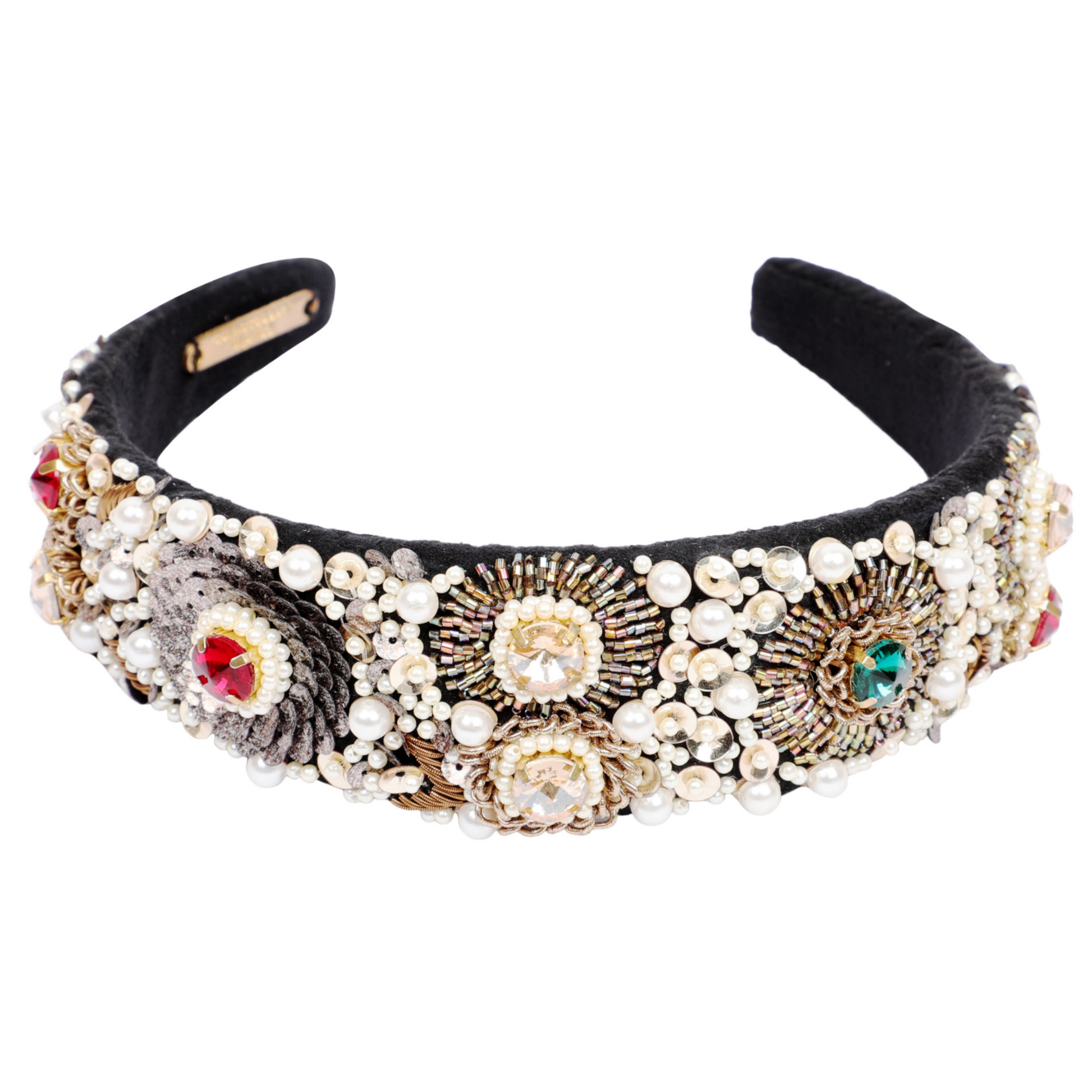 Featuring a broad hairband with crystal beads and pearls embellishment.
