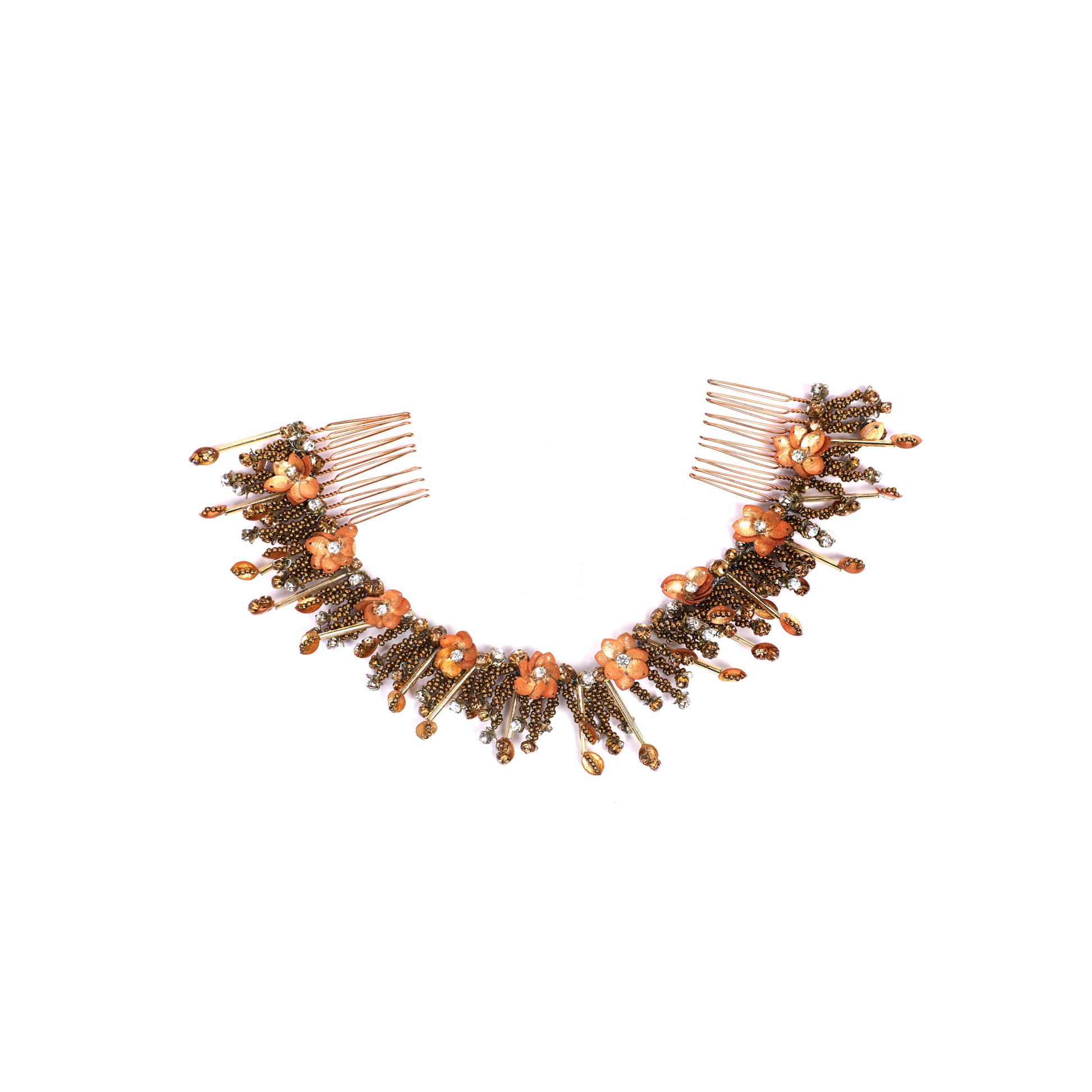Featuring a Gold color wedding party wear wreath Hair Comb with crystals, beads and sequins floral motif embellishment.