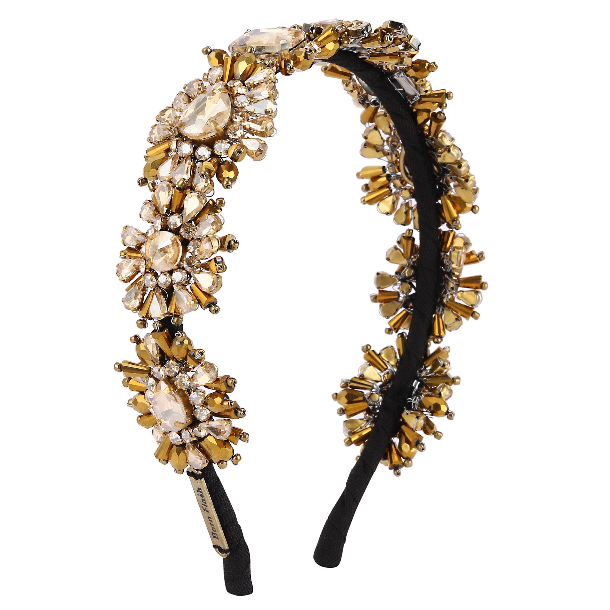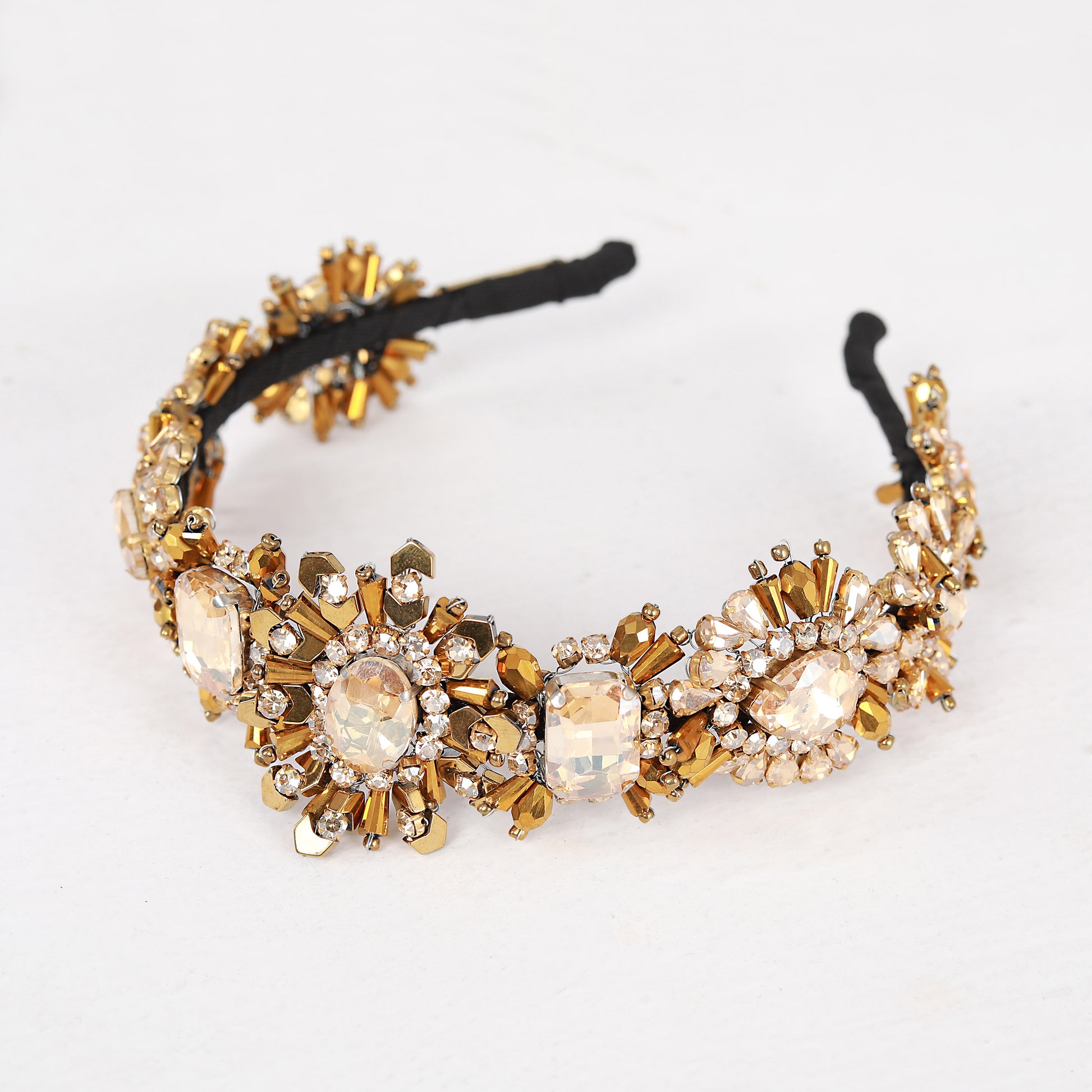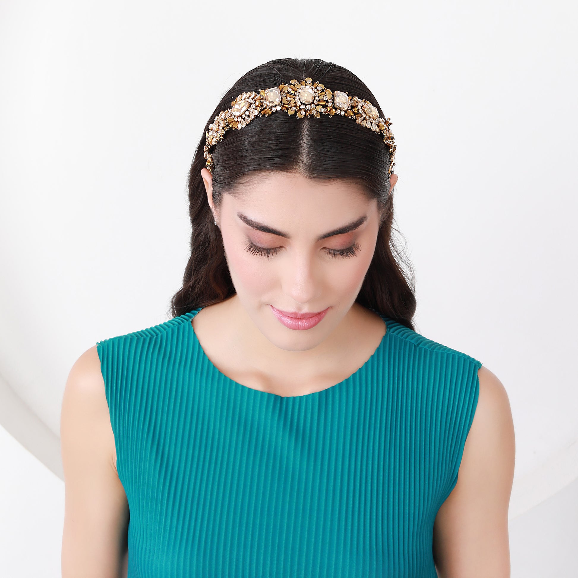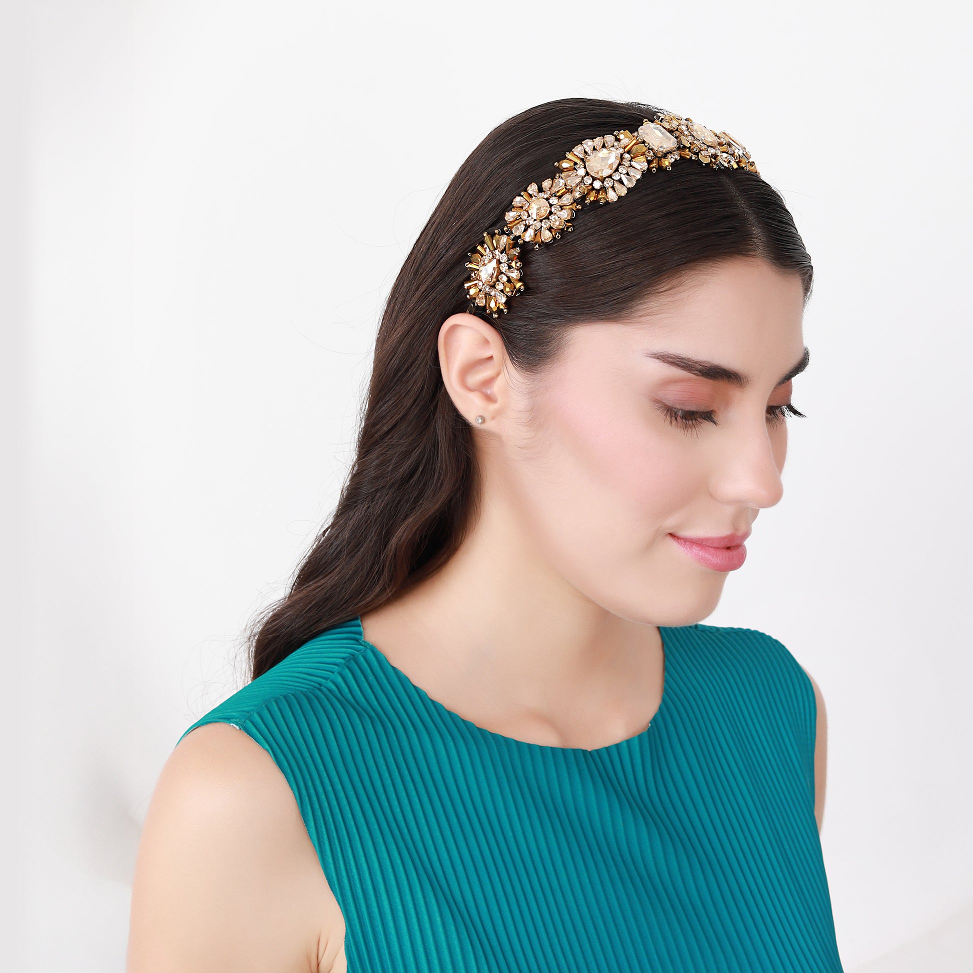 Introducing the Golden Insect-Inspired Crystal Hairband, a striking accessory designed for those who love to make a statement. This luxurious hairband features a rich, golden beaded texture that mimics the intricate beauty of an insect’s form adding a touch of the unexpected. Each bead is meticulously hand-placed, while shimmering crystals embellish the design, catching the light with every movement. Perfect for weddings and upscale parties, this headpiece combines elegance and avant-garde style, making it an exquisite choice for fashion-forward brides or guests who wish to elevate their look..