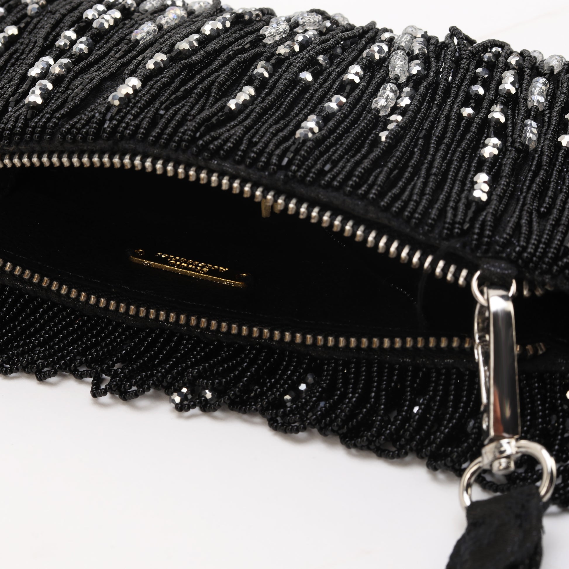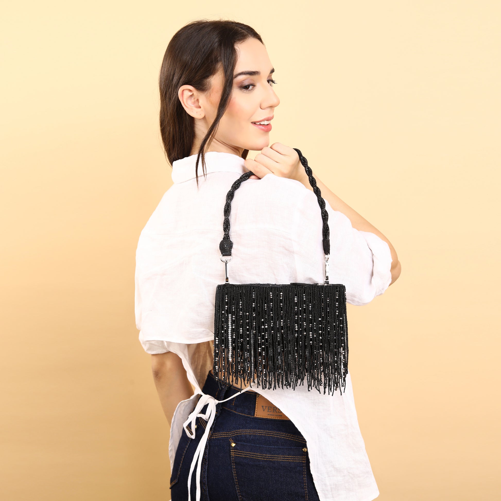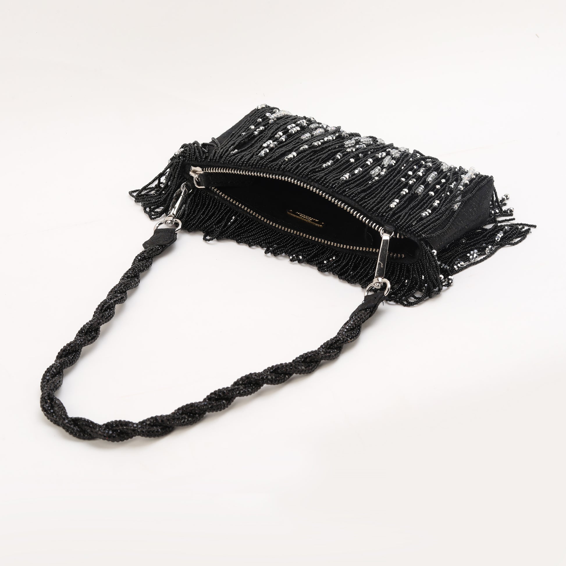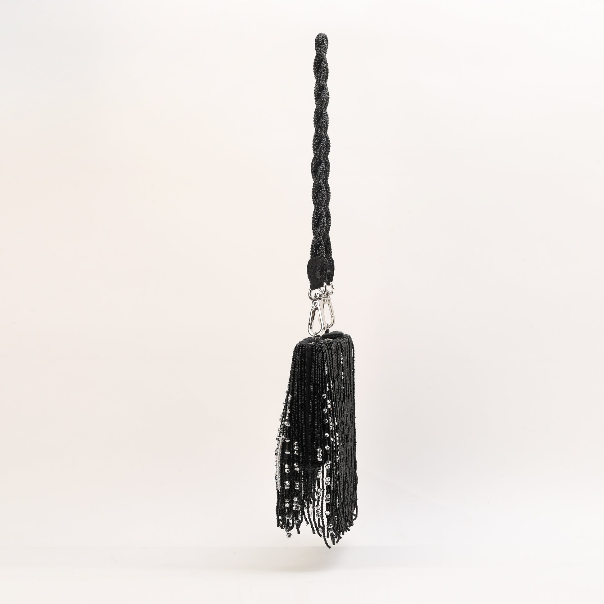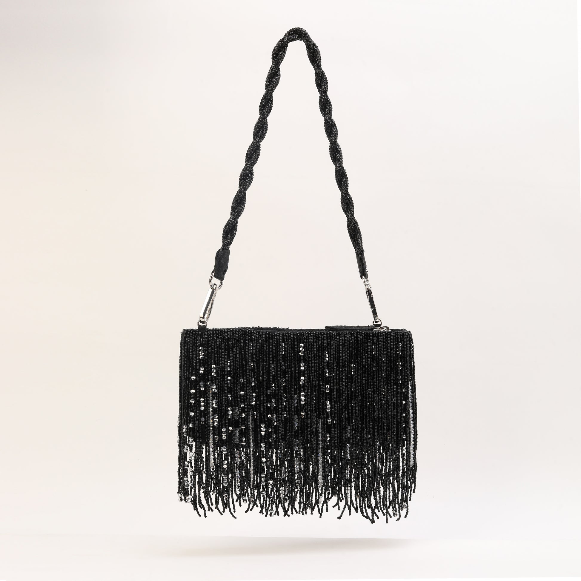 "Introducing our silk Jacquard black beaded tassel Bag , meticulously crafted adorned with intricate hand-beaded details. Its luxurious black and silver beaded tassels and beaded handle add a touch of sophistication, This bag effortlessly combines style and elegance to make a statement wherever you go."
