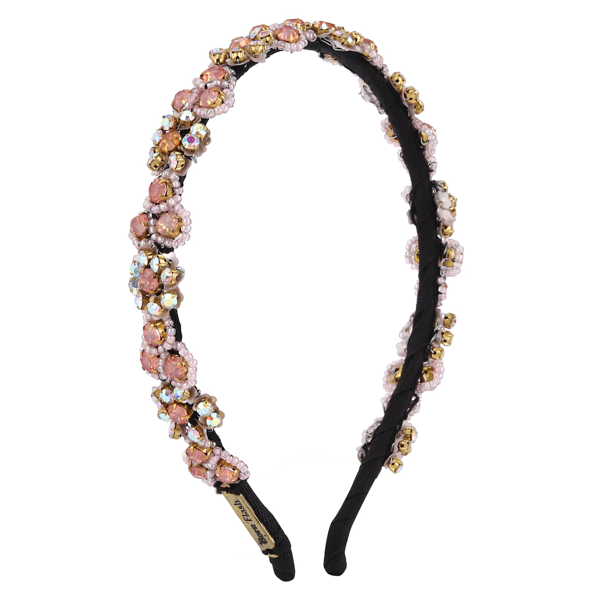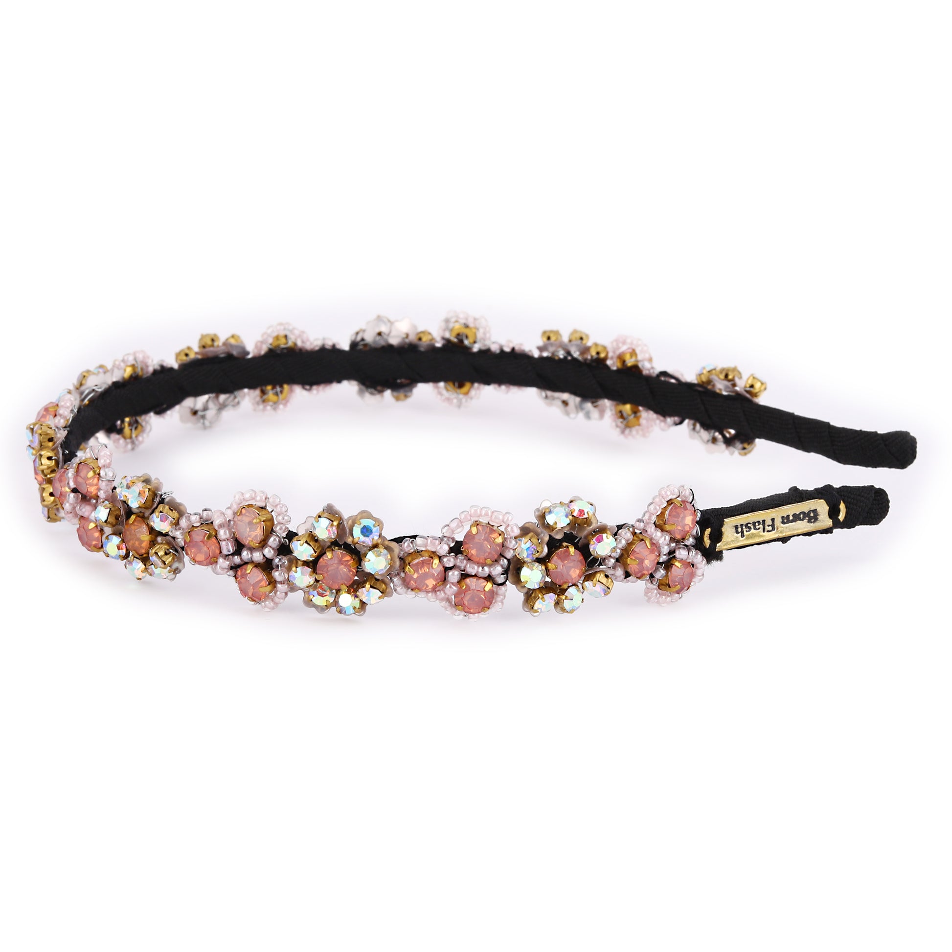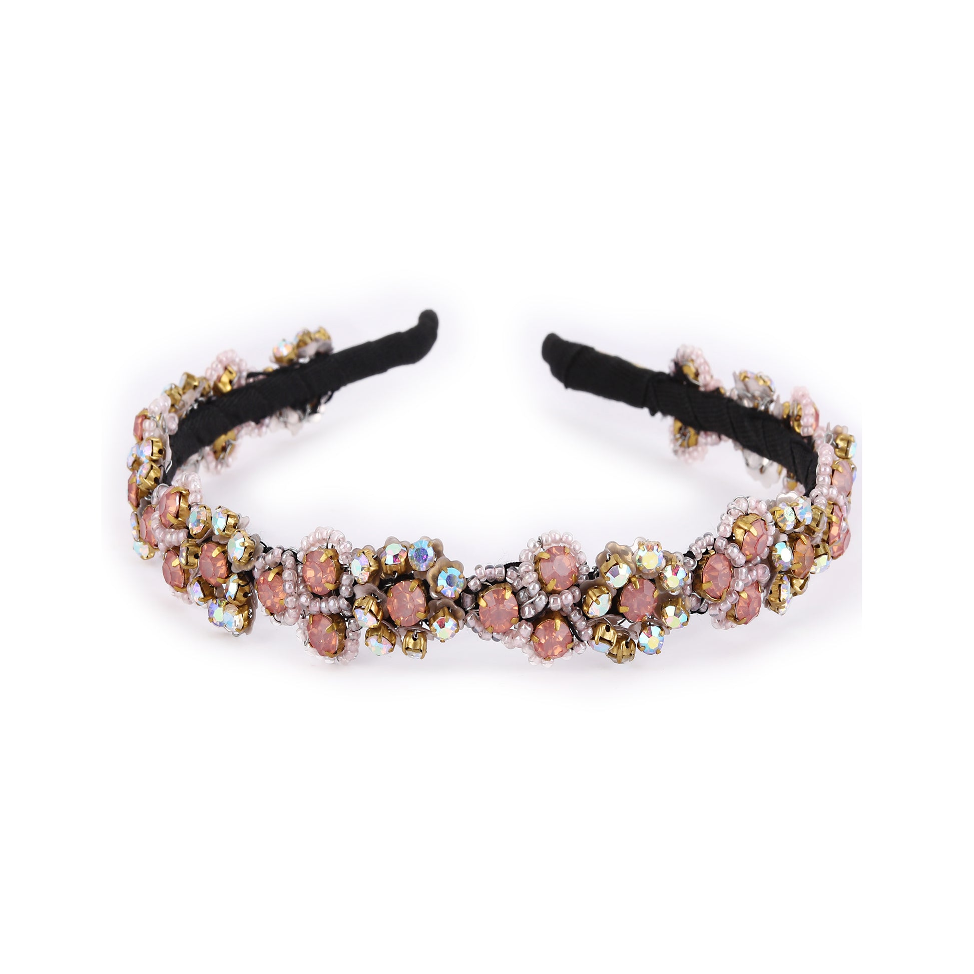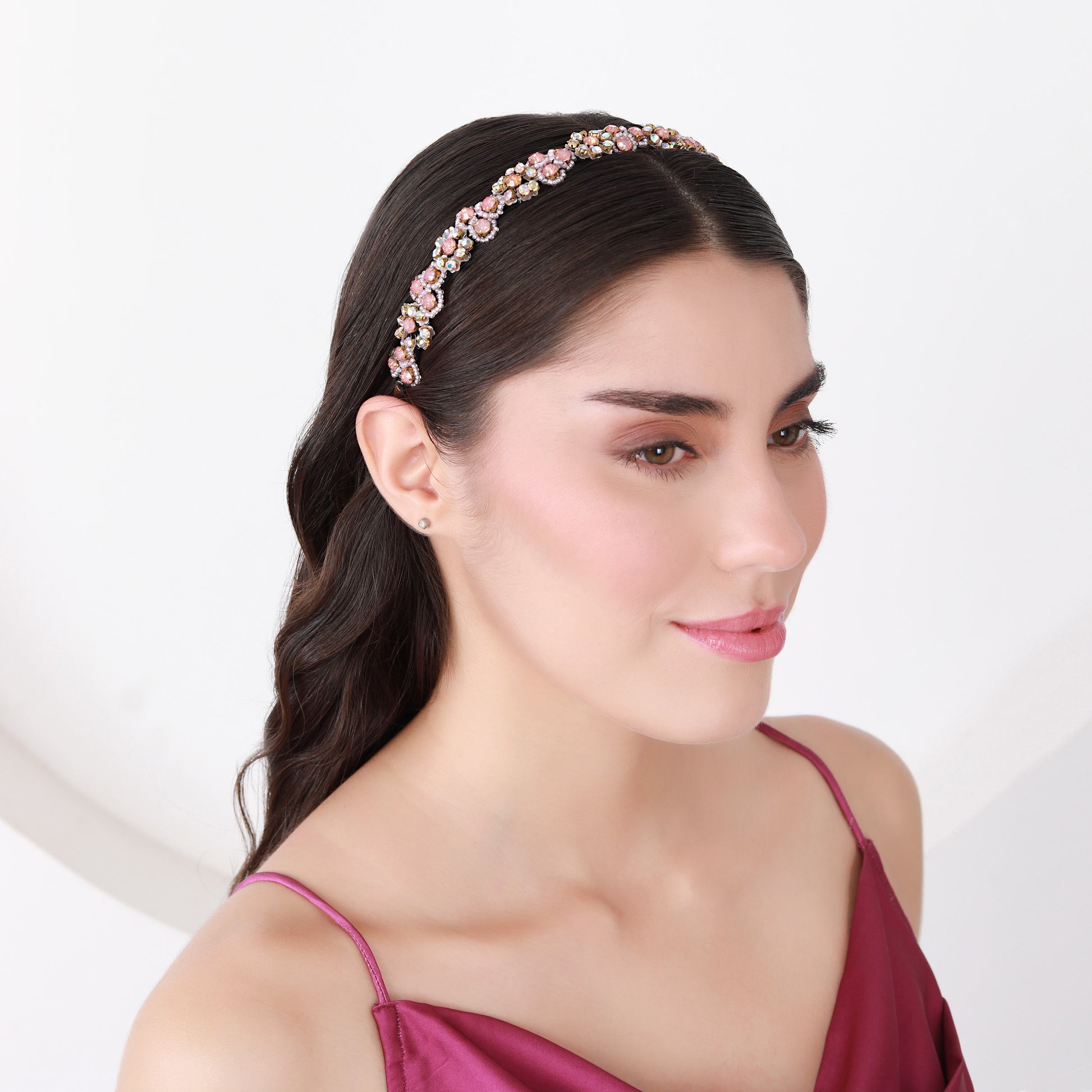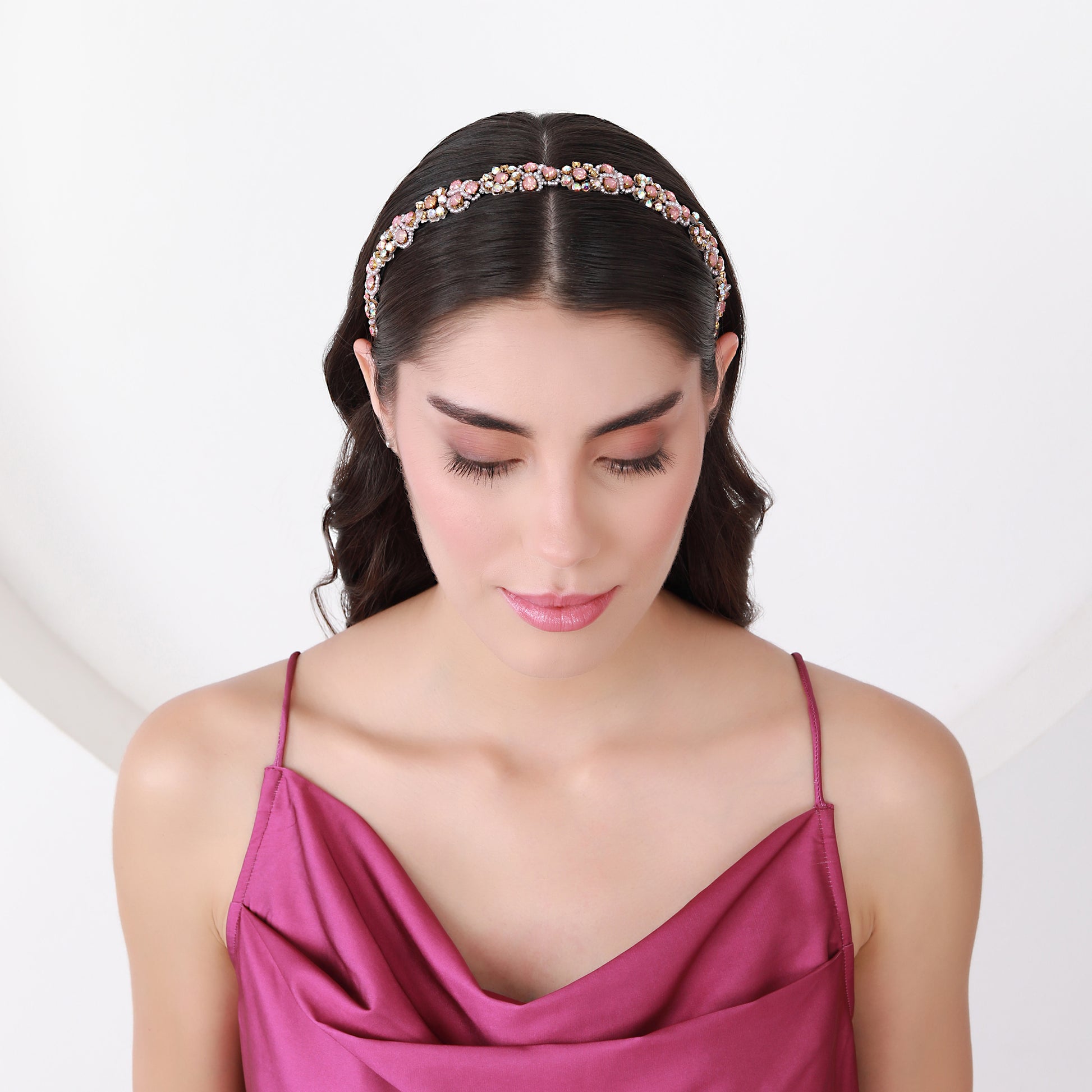 Turn heads with the Blush Radiance headband — a stunning fusion of vibrant sparkle and elegant design. This decorative headband features a wide, flat black elastic band adorned with an intricate floral pattern of pink and gold rhinestones. Clusters of round pink crystals are framed by dazzling aurora borealis accents and gold-toned beads, creating a mesmerizing shimmer from every angle. The repeating pattern runs across the entire length of the band, offering full-impact glamour whether worn with updos, loose waves, or sleek styles. An ideal choice for weddings, parties, or festive occasions. Comfort meets luxury in this standout accessory that elevates any look with ease.