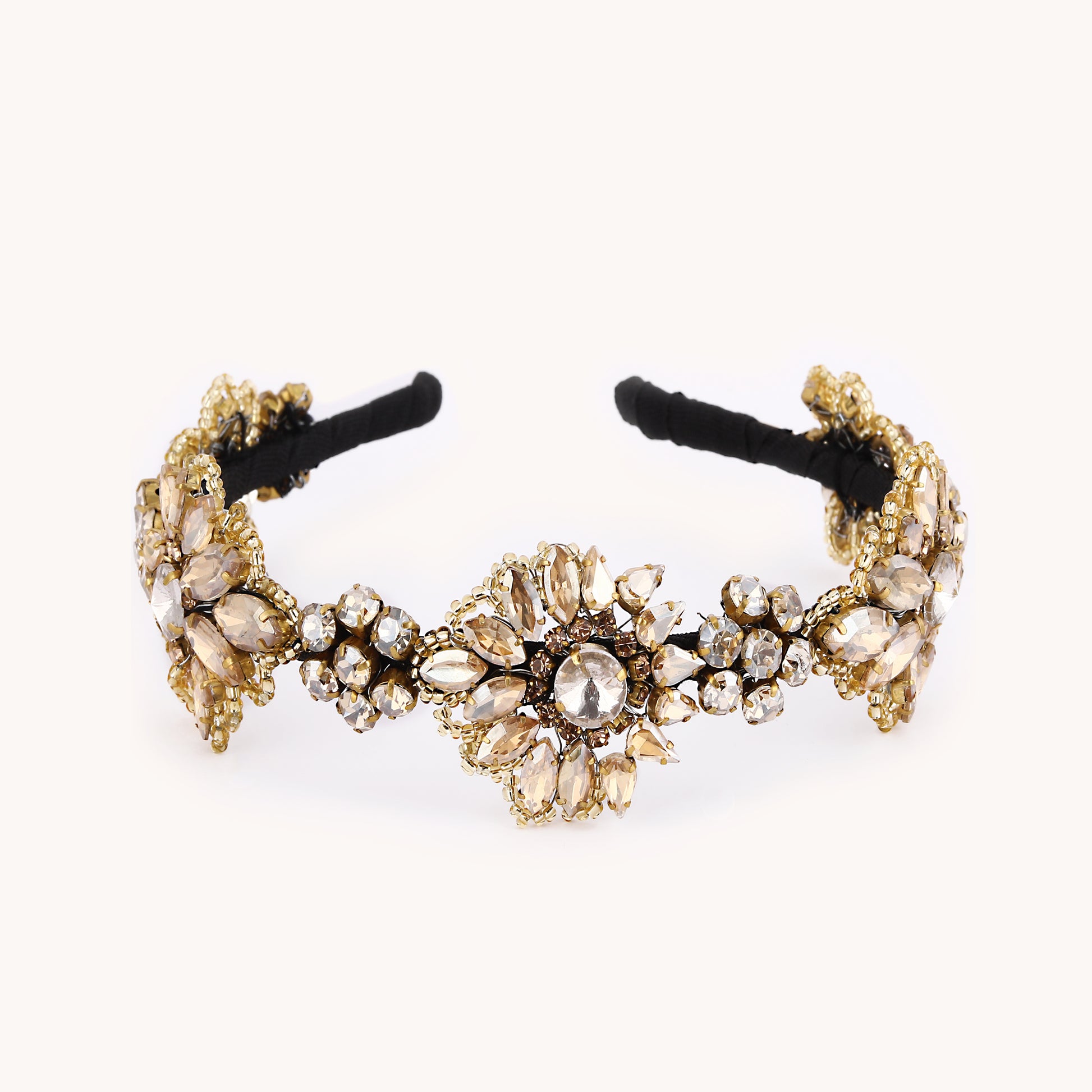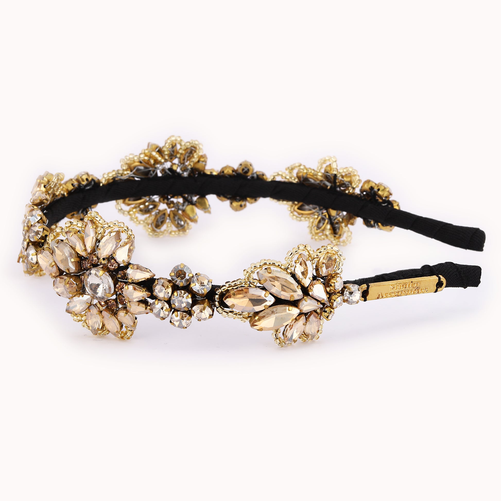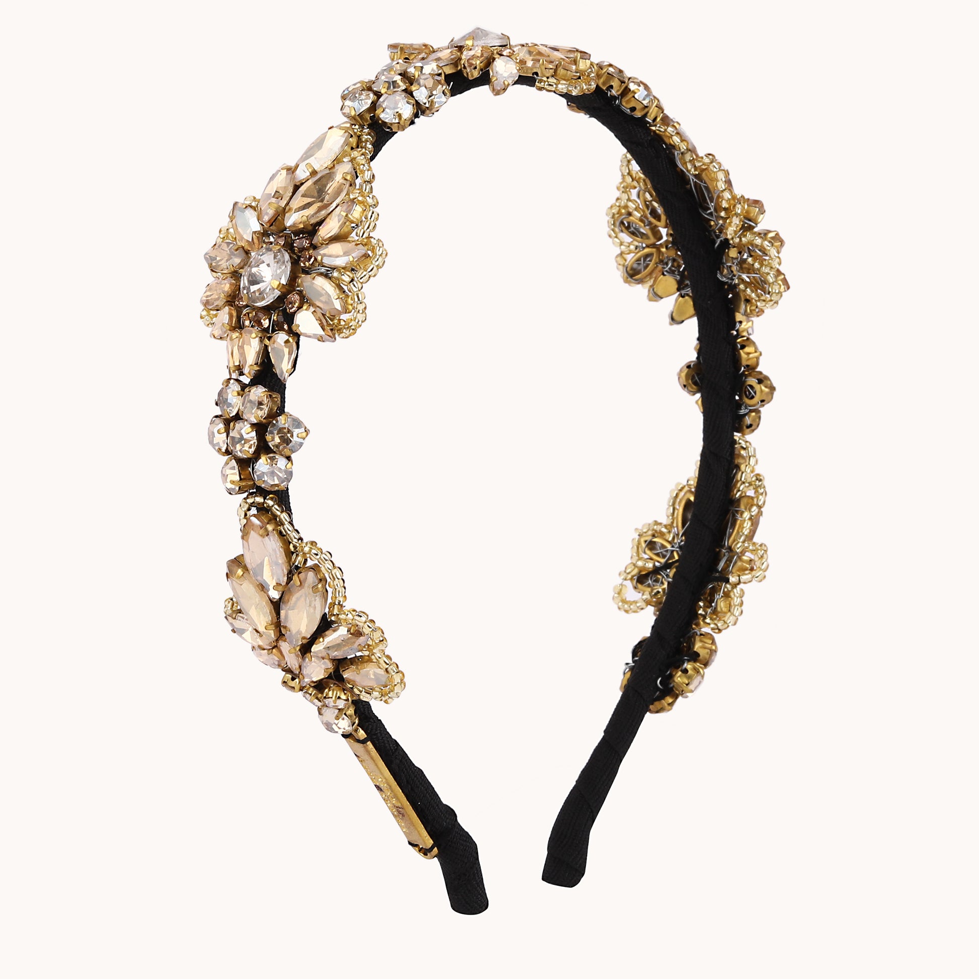 Add timeless elegance to your look with the Champagne Bloom vintage-style hairband, a stunning statement accessory crafted with intricate detail. this ornate hairband showcases dual floral-inspired motifs featuring large, champagne-hued crystals at the center, surrounded by delicately arranged marquise-cut stones. The gold-toned metalwork is enriched with fine beading and classic filigree patterns, enhancing its antique charm. Perfect for formal wear, bridal outfits, or saree drapes, this hairband brings a refined sparkle.