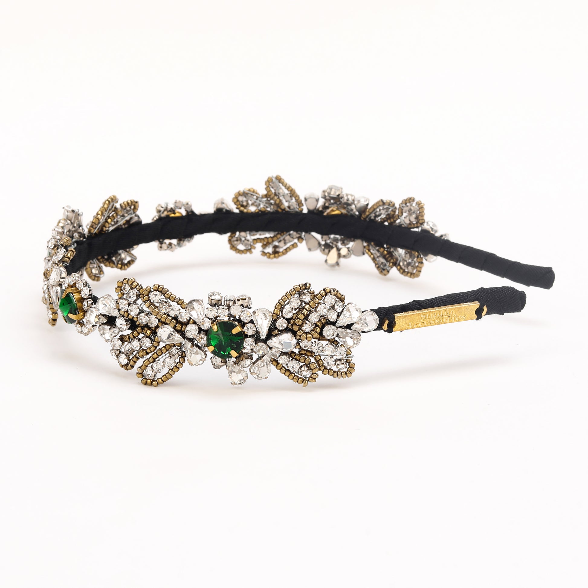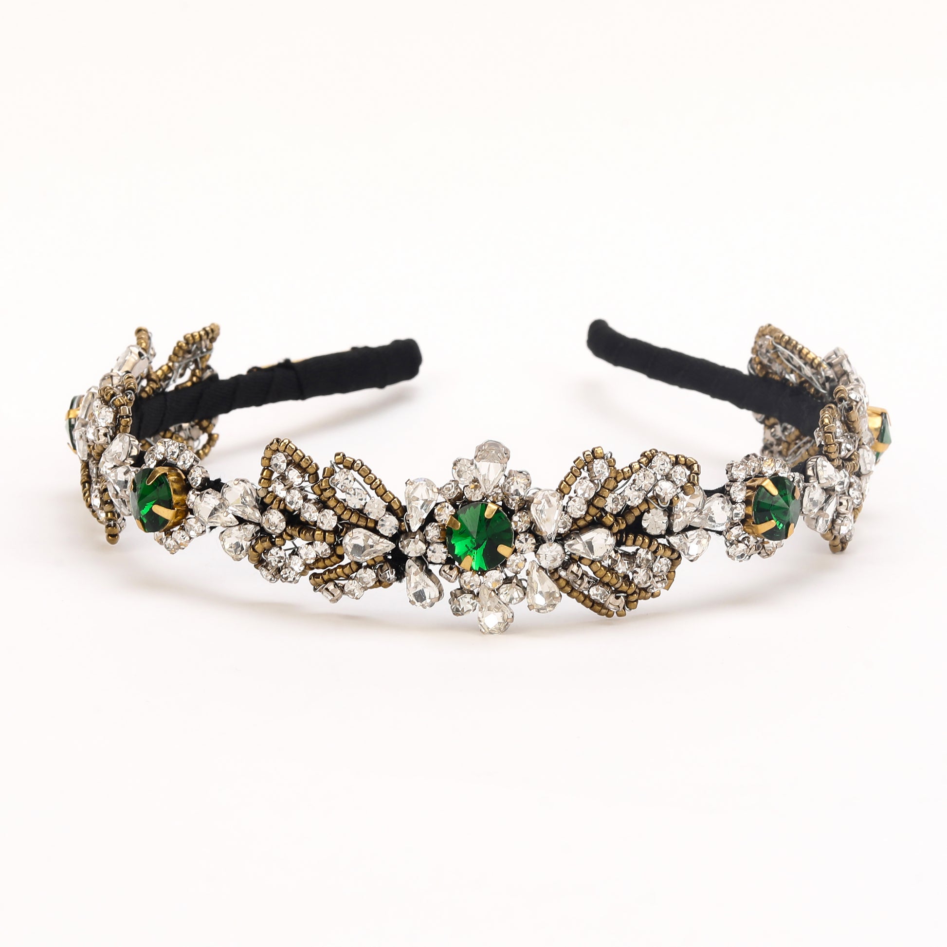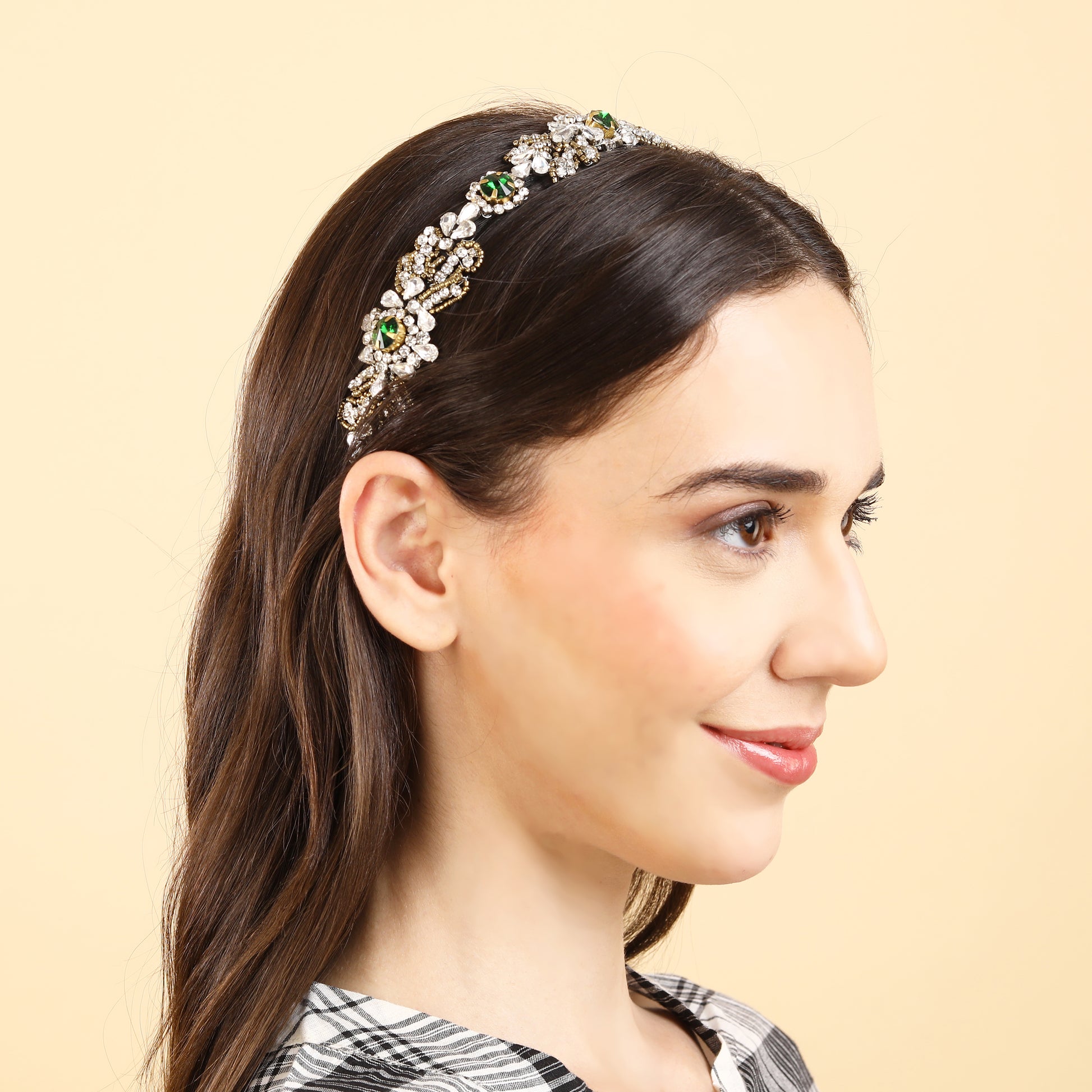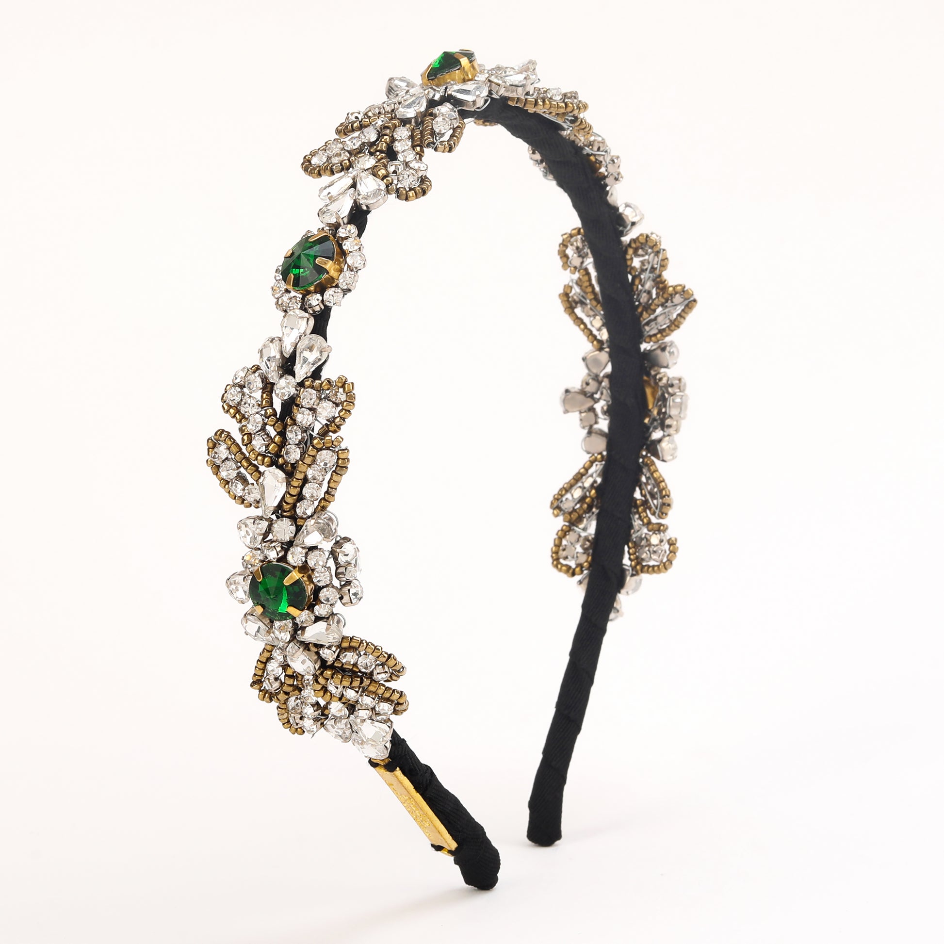 This elegant hand-beaded hairband features shimmering Green and silver crystals and beads delicately woven together to create a stunning accessory. The green hues add a touch of luxury, while the silver accents provide a sophisticated contrast. Perfect for adding a touch of glamour to any hairstyle, this hairband exudes timeless beauty and style.This exquisite handcrafted hairband features a mesmerizing combination of green, gold, and silver color crystals and beads. Each carefully chosen element adds a touch of elegance and sophistication to any hairstyle, making it perfect for special occasions or adding a glamorous flair to everyday looks. Crafted with meticulous attention to detail, this hair accessory is sure to make a statement and elevate your style to the next level.
