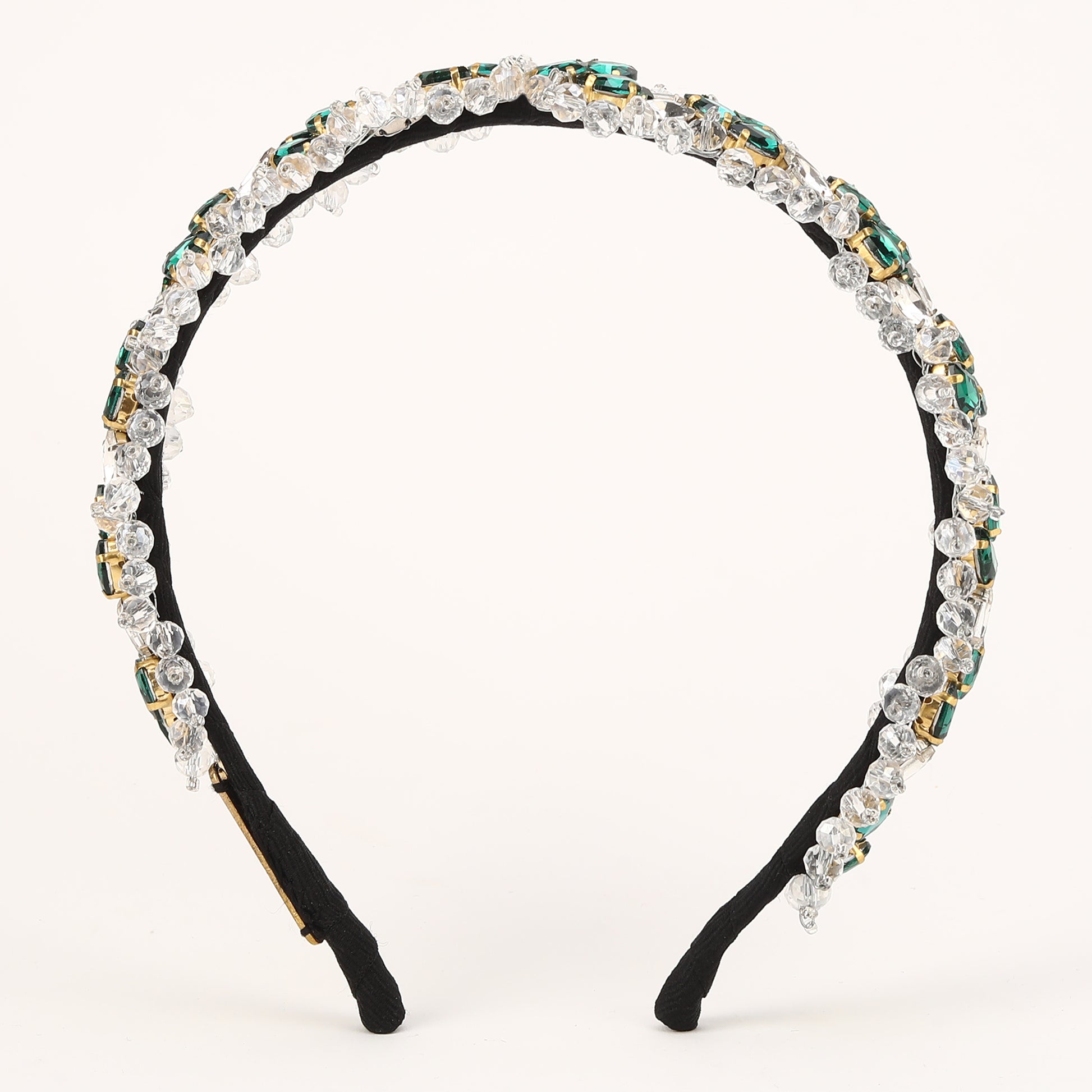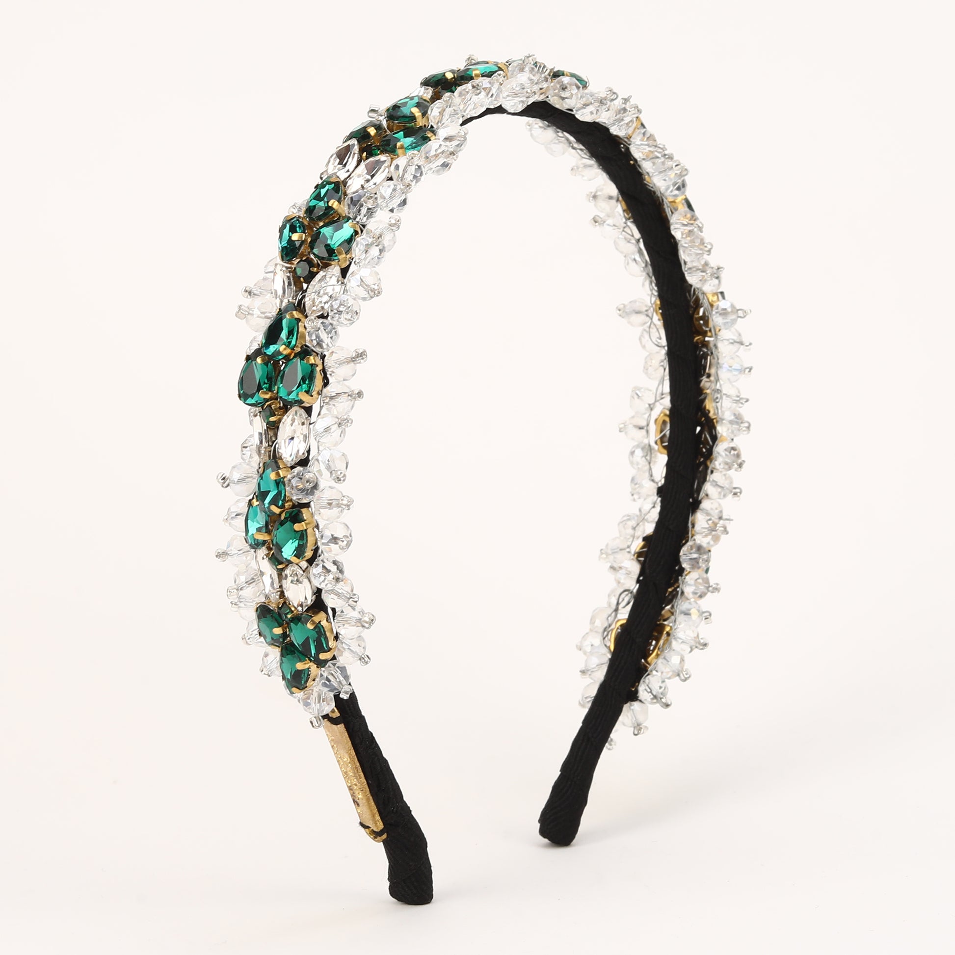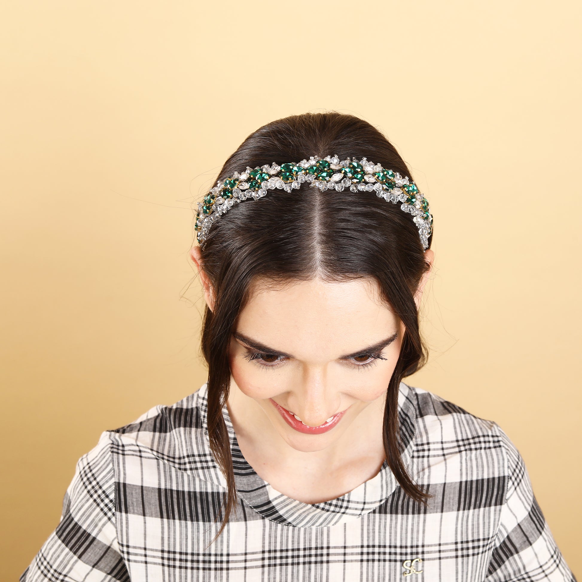 This elegant hand-beaded hairband features green and silver crystals and beads delicately woven together to create a stunning accessory. The green hues add a touch of luxury, while the silver accents provide a sophisticated contrast. Perfect for adding a touch of glamour to any hairstyle, this hairband exudes timeless beauty and style.This exquisite handcrafted hairband features a mesmerizing combination of green and silver color crystals and beads. Each carefully chosen element adds a touch of elegance and sophistication to any hairstyle, making it perfect for special occasions or adding a glamorous flair to everyday looks. Crafted with meticulous attention to detail, this hair accessory is sure to make a statement and elevate your style to the next level..