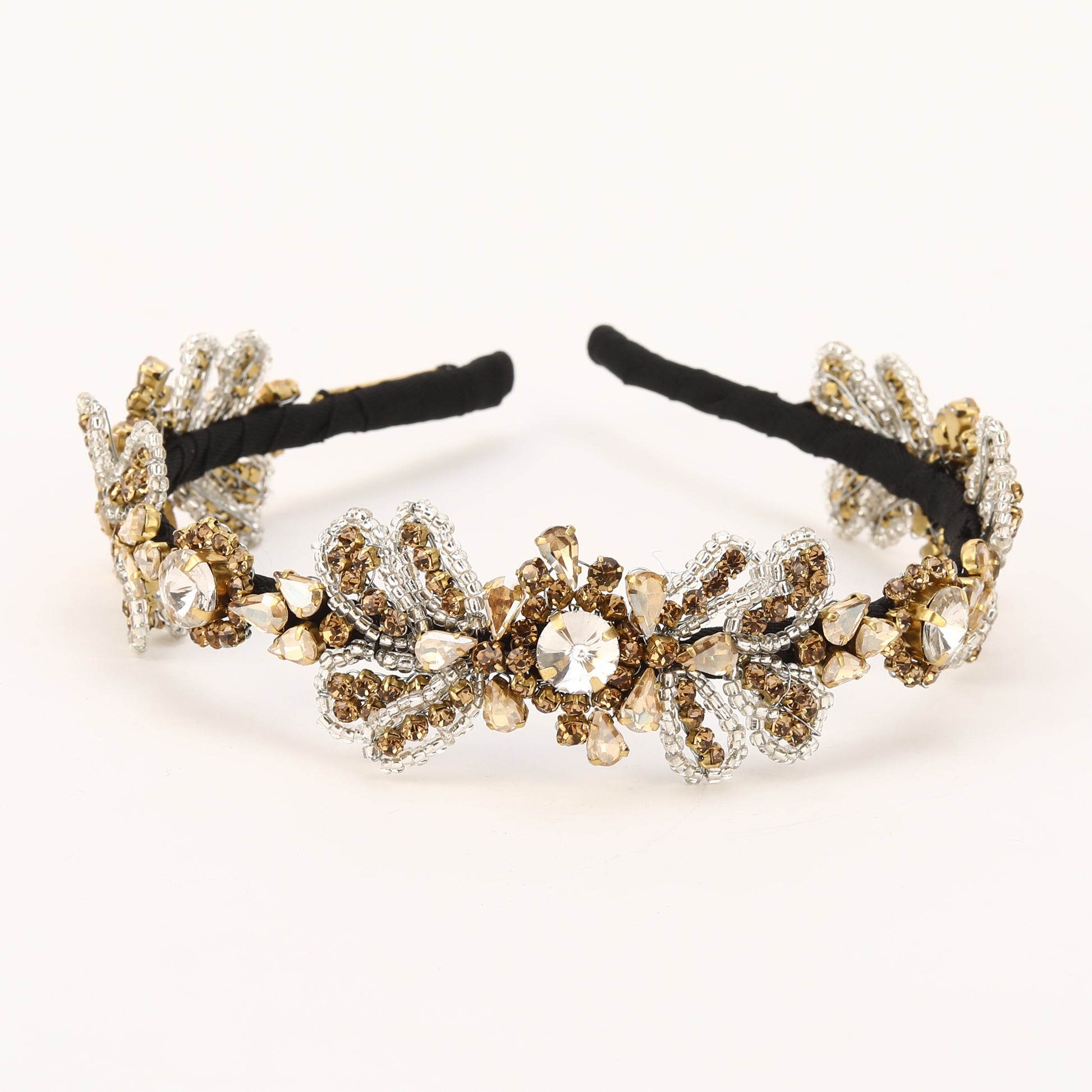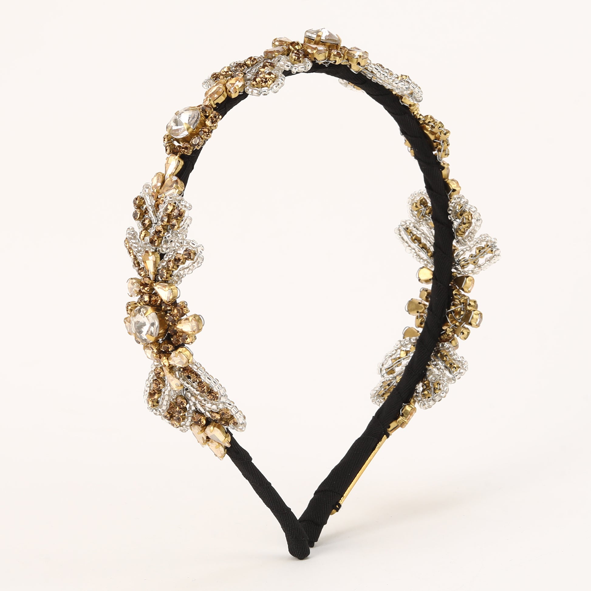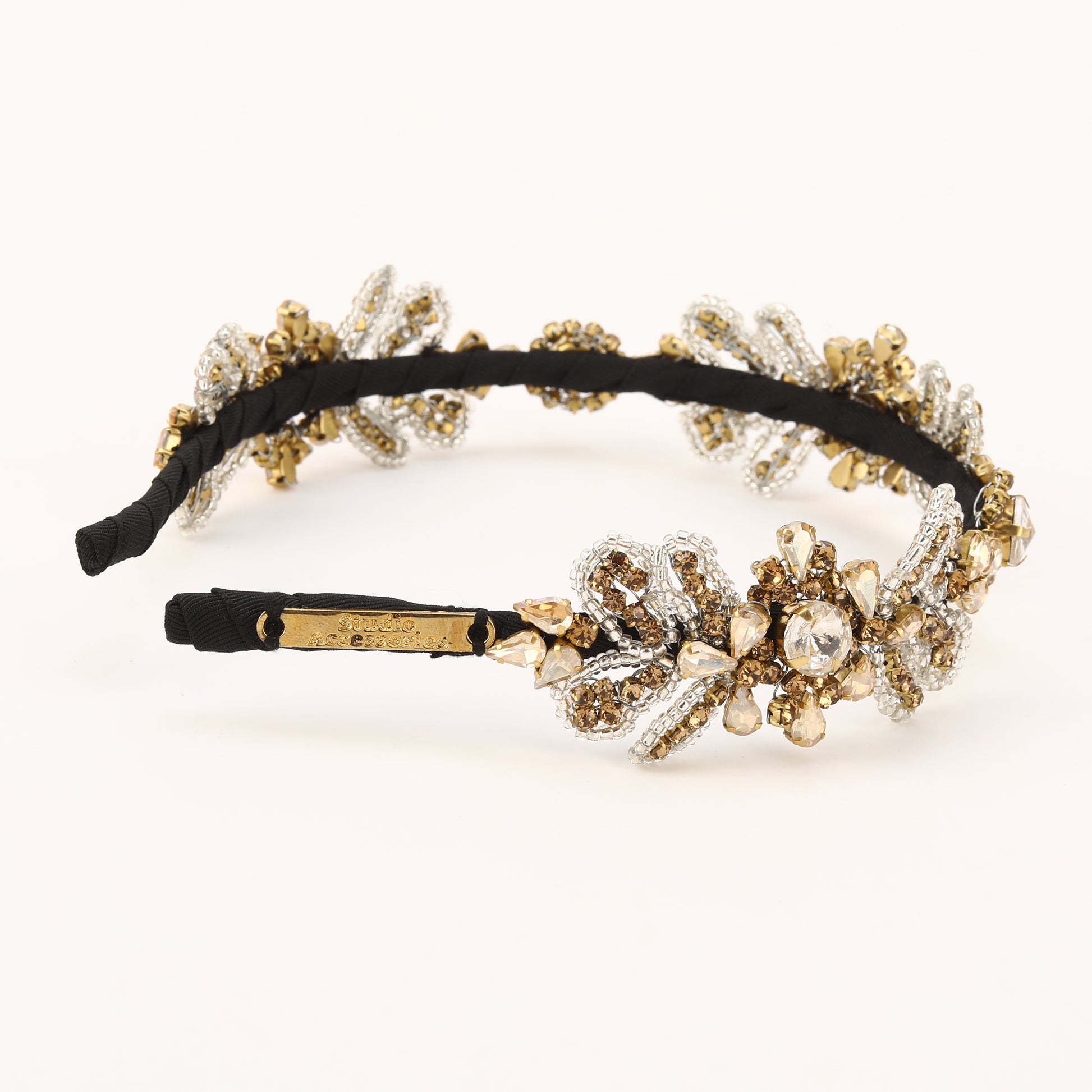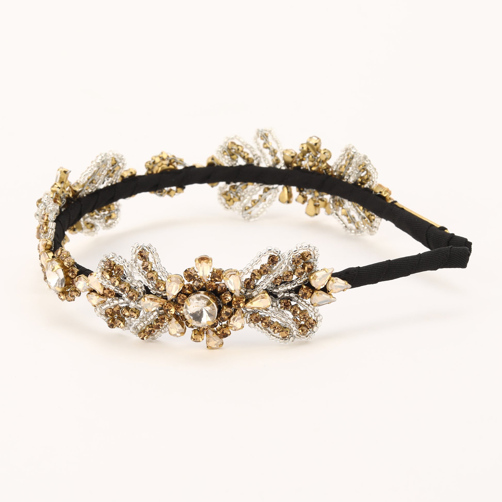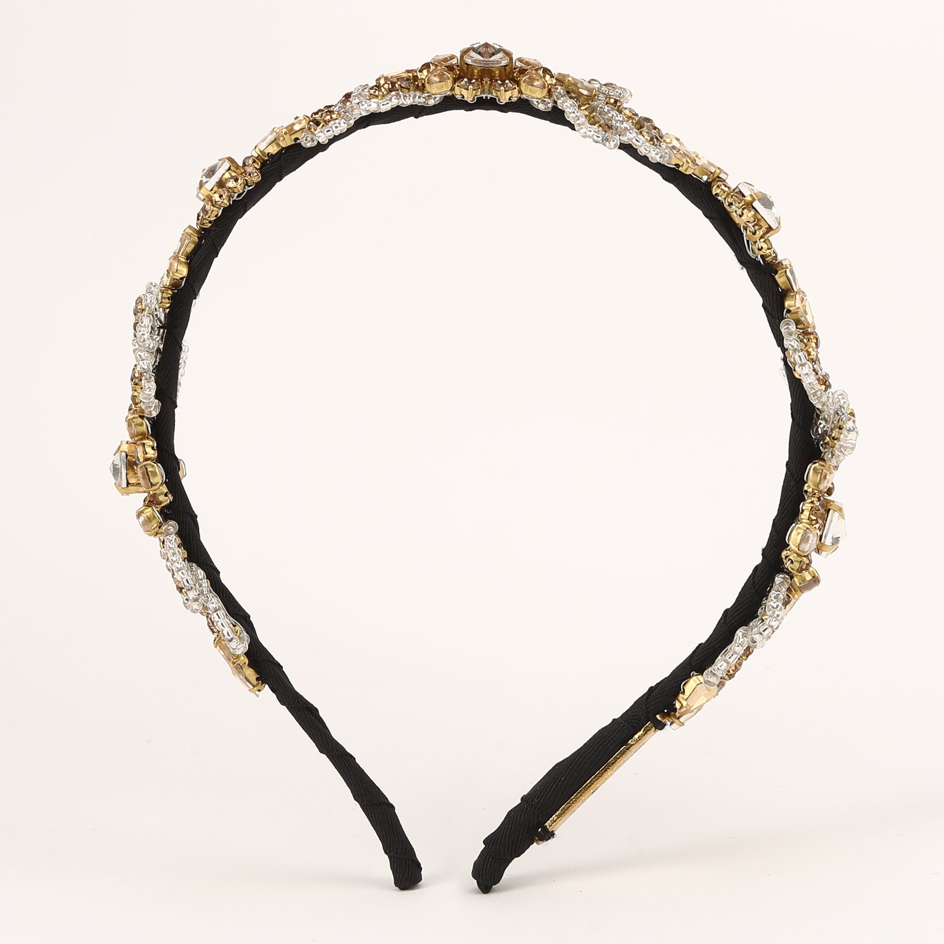 This elegant hand-beaded hairband features shimmering gold and silver crystals and beads delicately woven together to create a stunning accessory. The golden hues add a touch of luxury, while the silver accents provide a sophisticated contrast. Perfect for adding a touch of glamour to any hairstyle, this hairband exudes timeless beauty and style.This exquisite handcrafted hairband features a mesmerizing combination of gold and silver color crystals and beads. Each carefully chosen element adds a touch of elegance and sophistication to any hairstyle, making it perfect for special occasions or adding a glamorous flair to everyday looks. Crafted with meticulous attention to detail, this hair accessory is sure to make a statement and elevate your style to the next level...