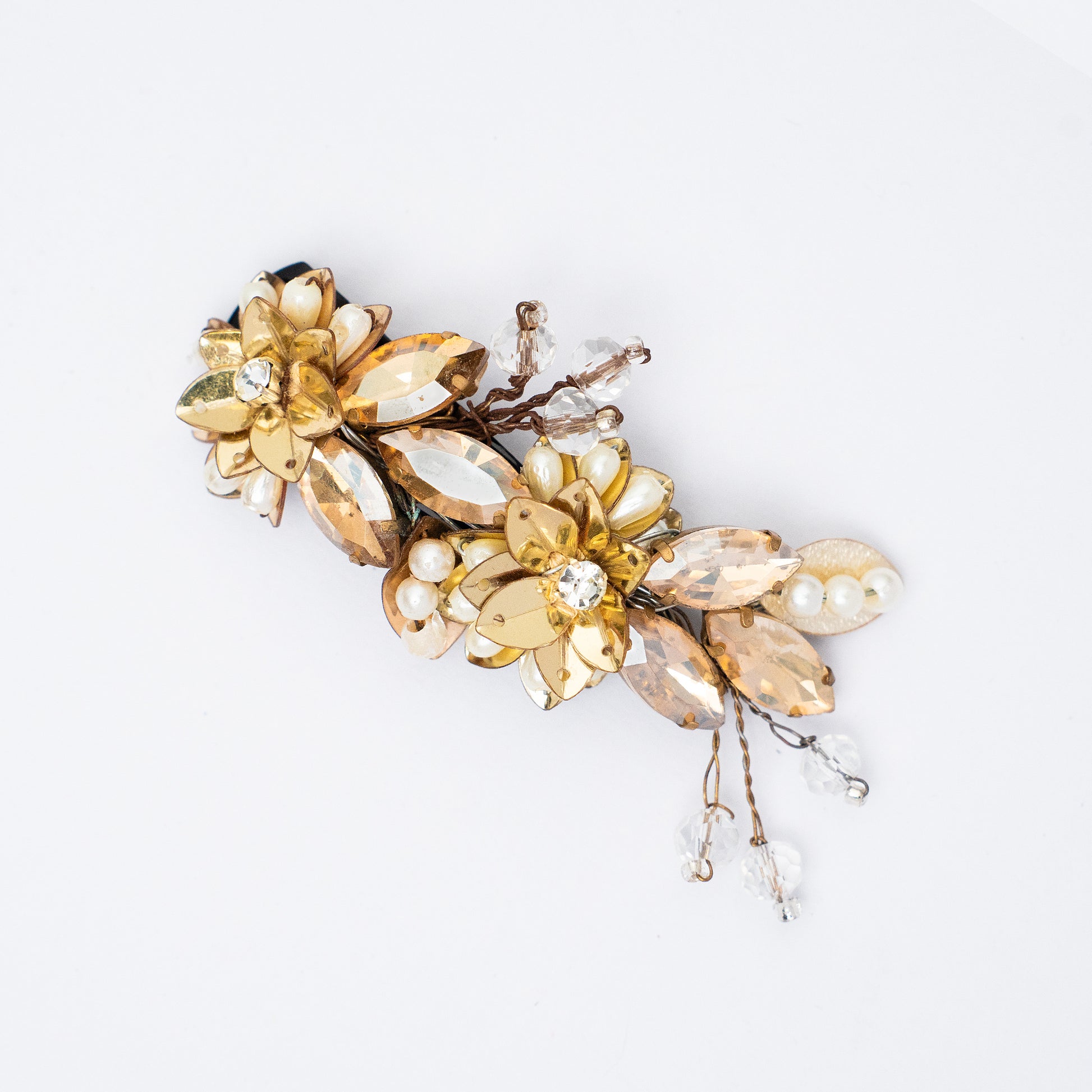 Bornflash Crystal, sequins, beads and pearls pembellished Gold Bridal hand beaded flower Wedding Party wear Tic Tac Hairclip set in steel.