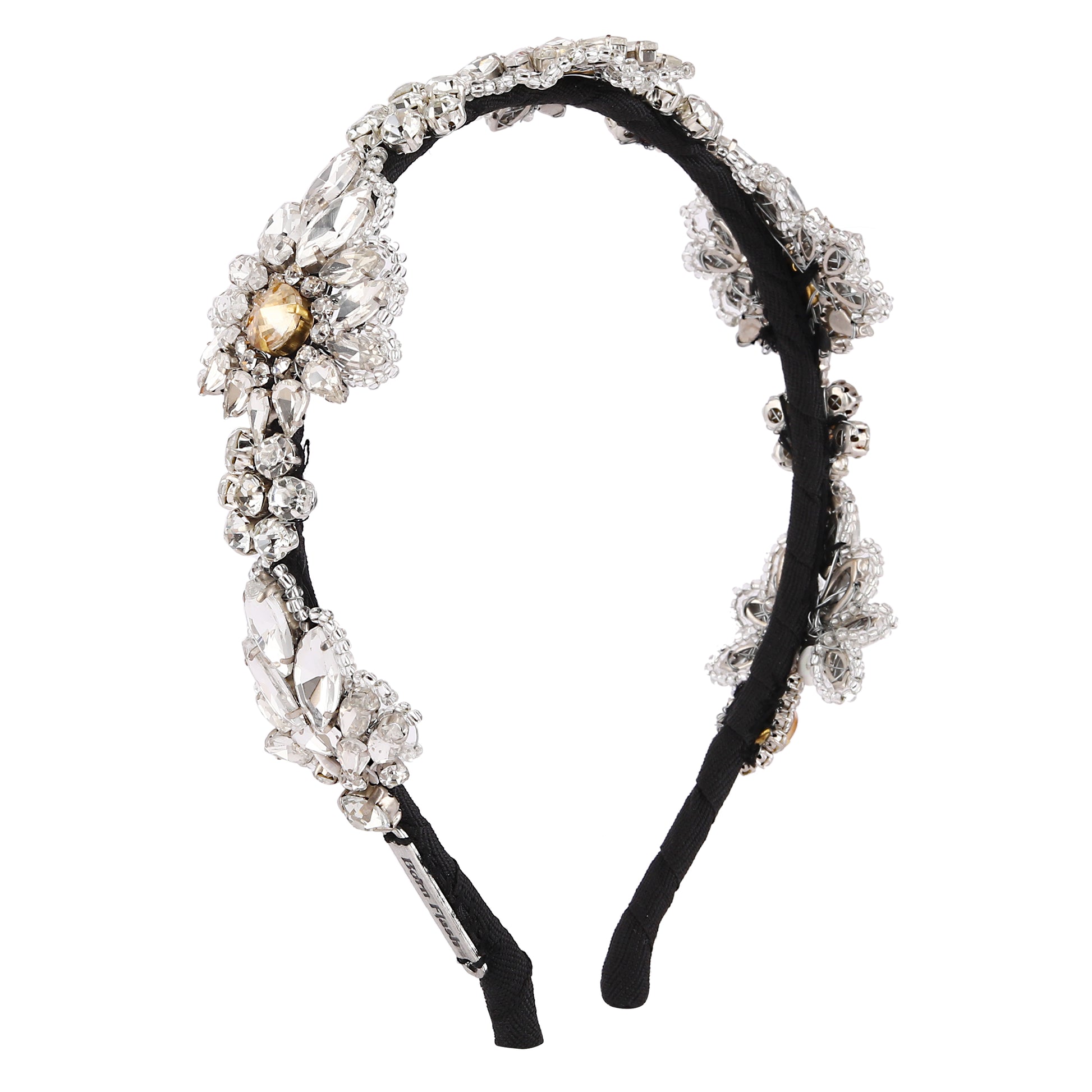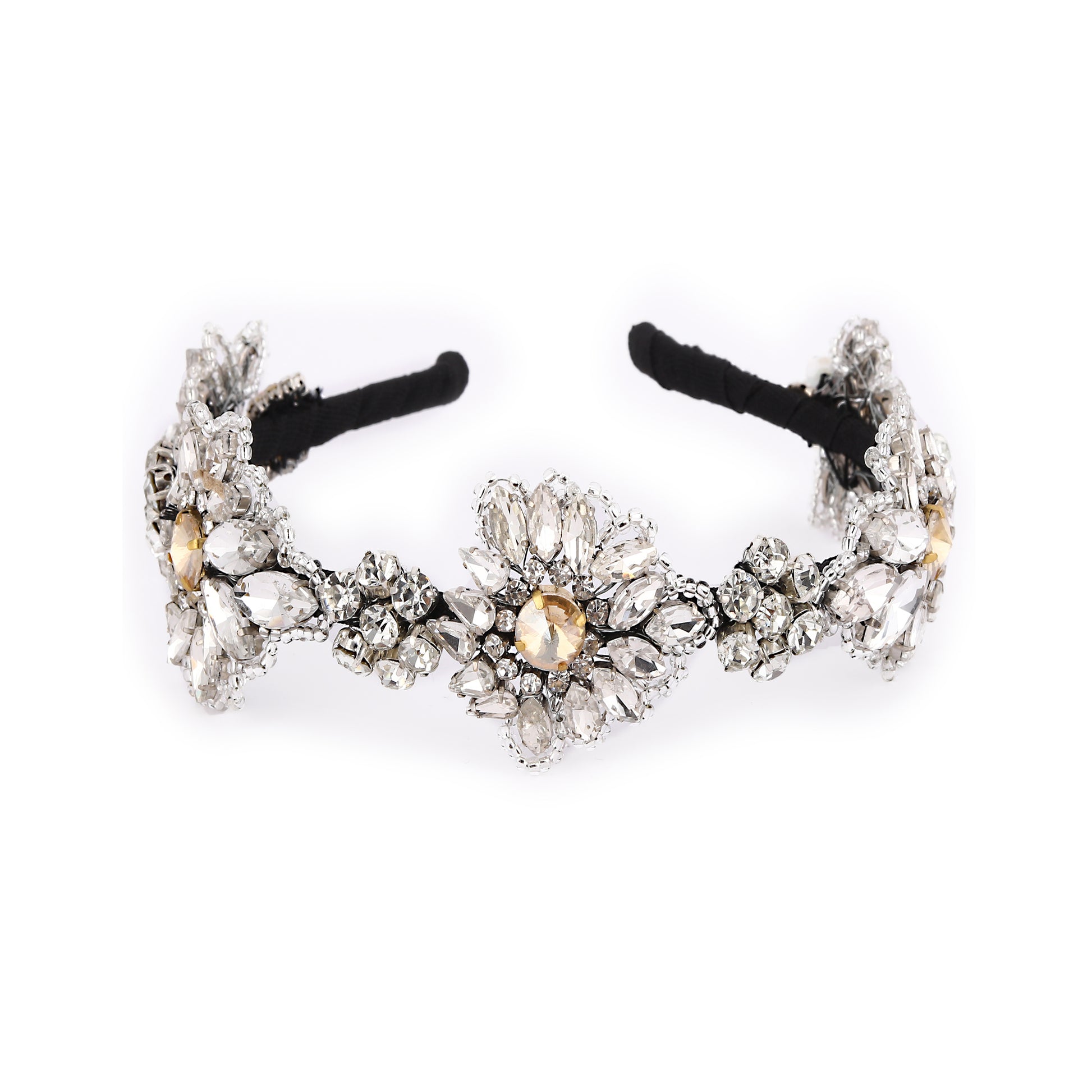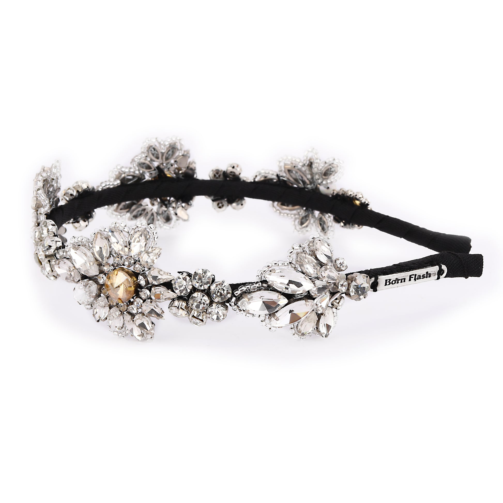 Add timeless elegance to your hairstyle with the Crystal Bloom hairband — a dazzling floral-inspired statement piece designed to turn heads. This ornate accessory showcases intricate silver-toned metalwork and a symmetrical arrangement of high-shine crystals. At its center, two large marquise-cut crystals radiate brilliance, framed by smaller round stones in a petal-like formation. this brooch-style embellishment is securely set on a flexible band, making it perfect for weddings, receptions, or festive occasions. The faceted cuts reflect light beautifully, offering a radiant finish that complements both traditional and contemporary outfits. Ideal for bridal looks or elegant evening wear.