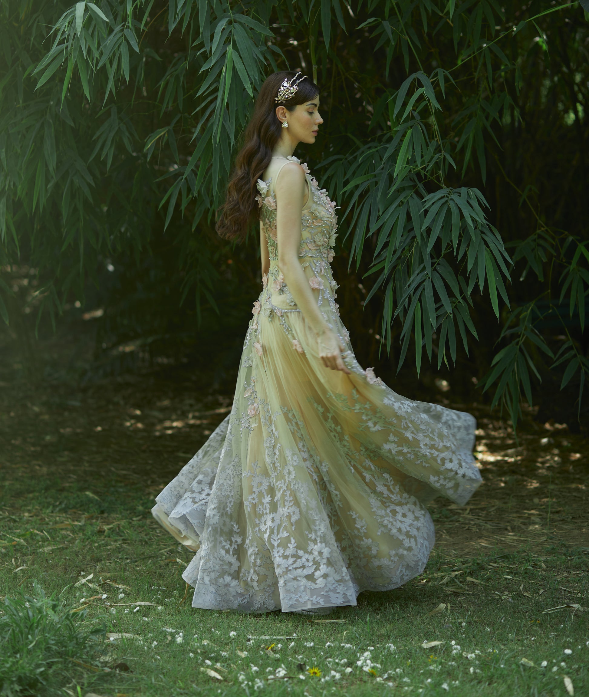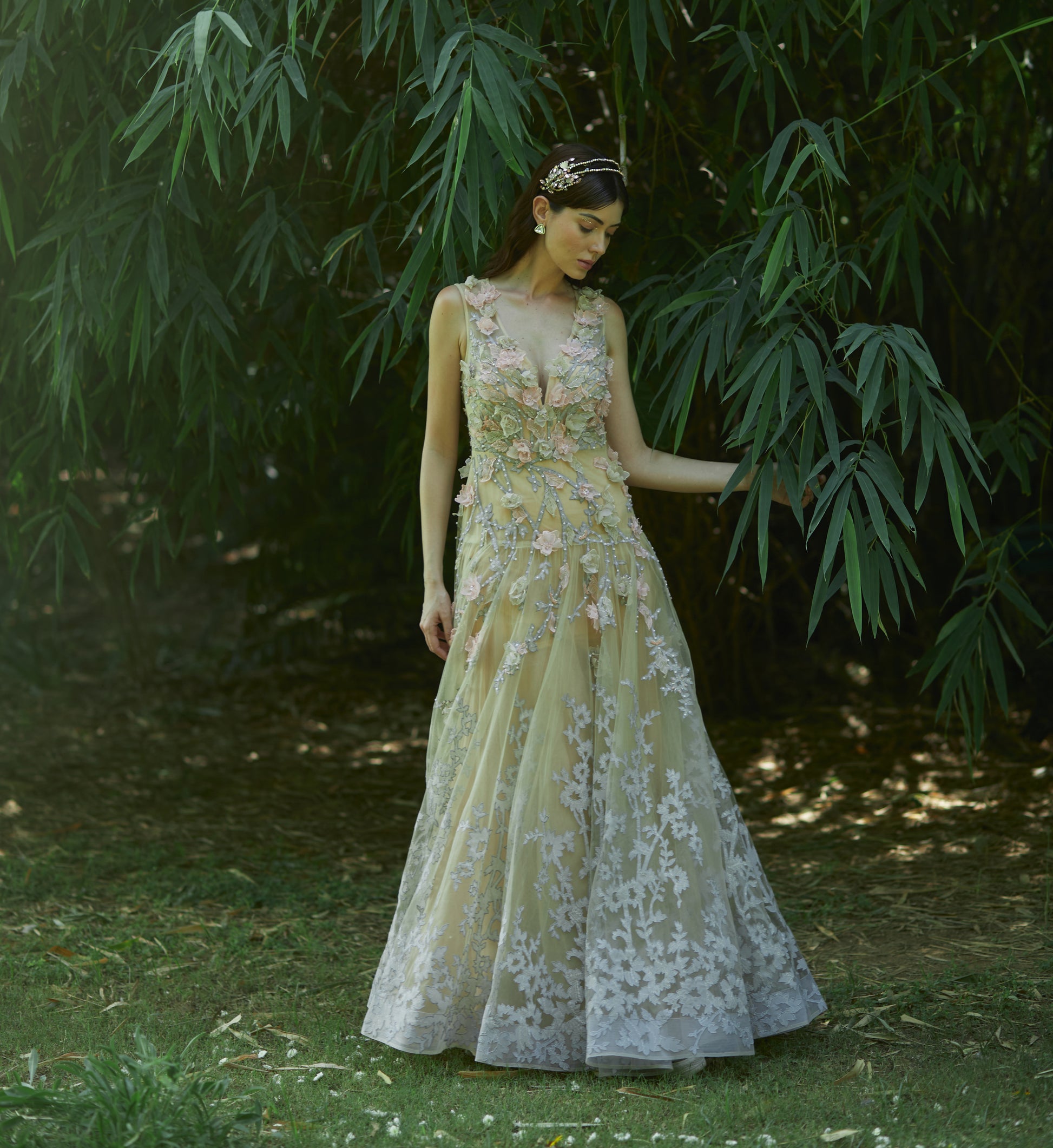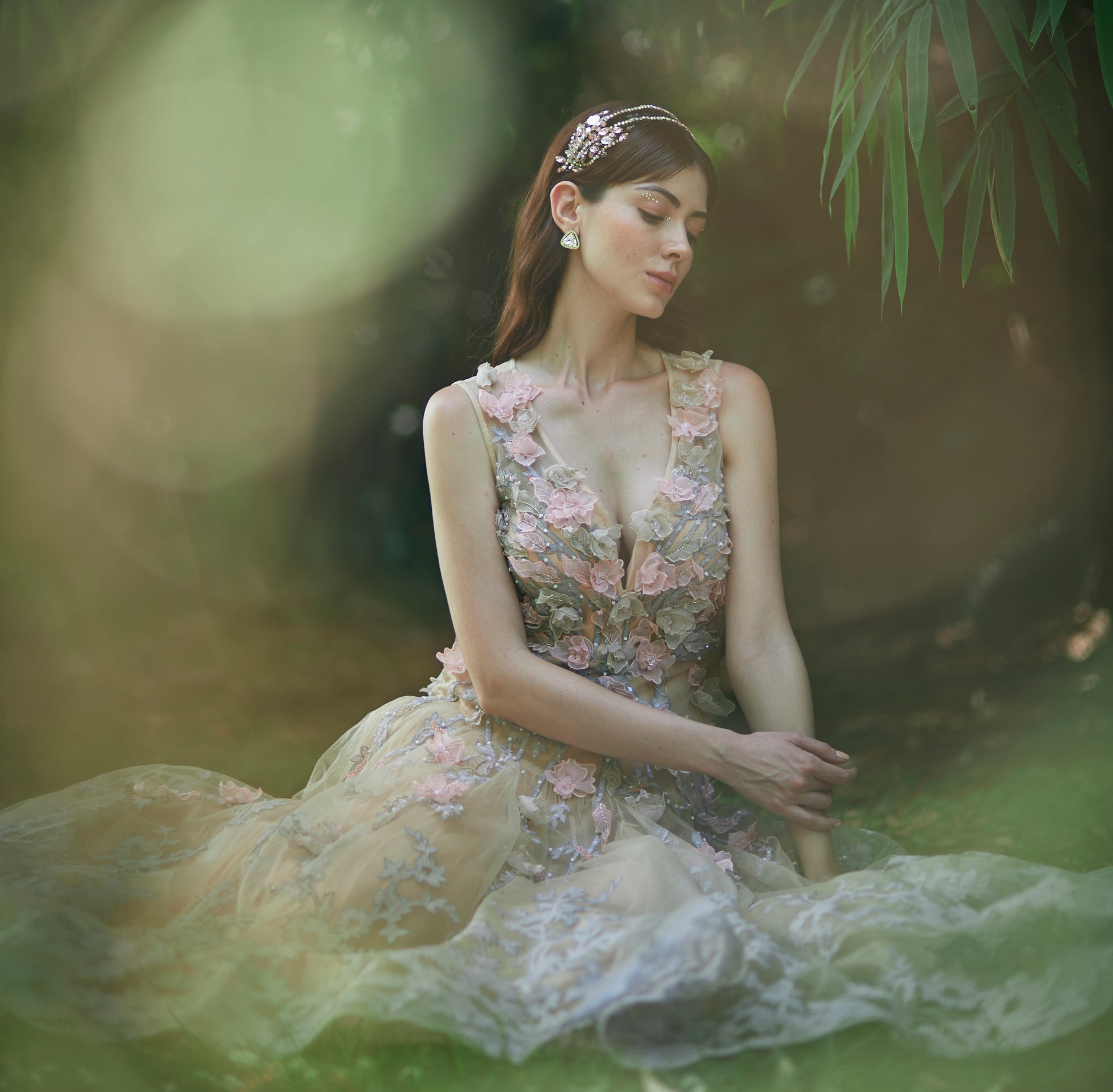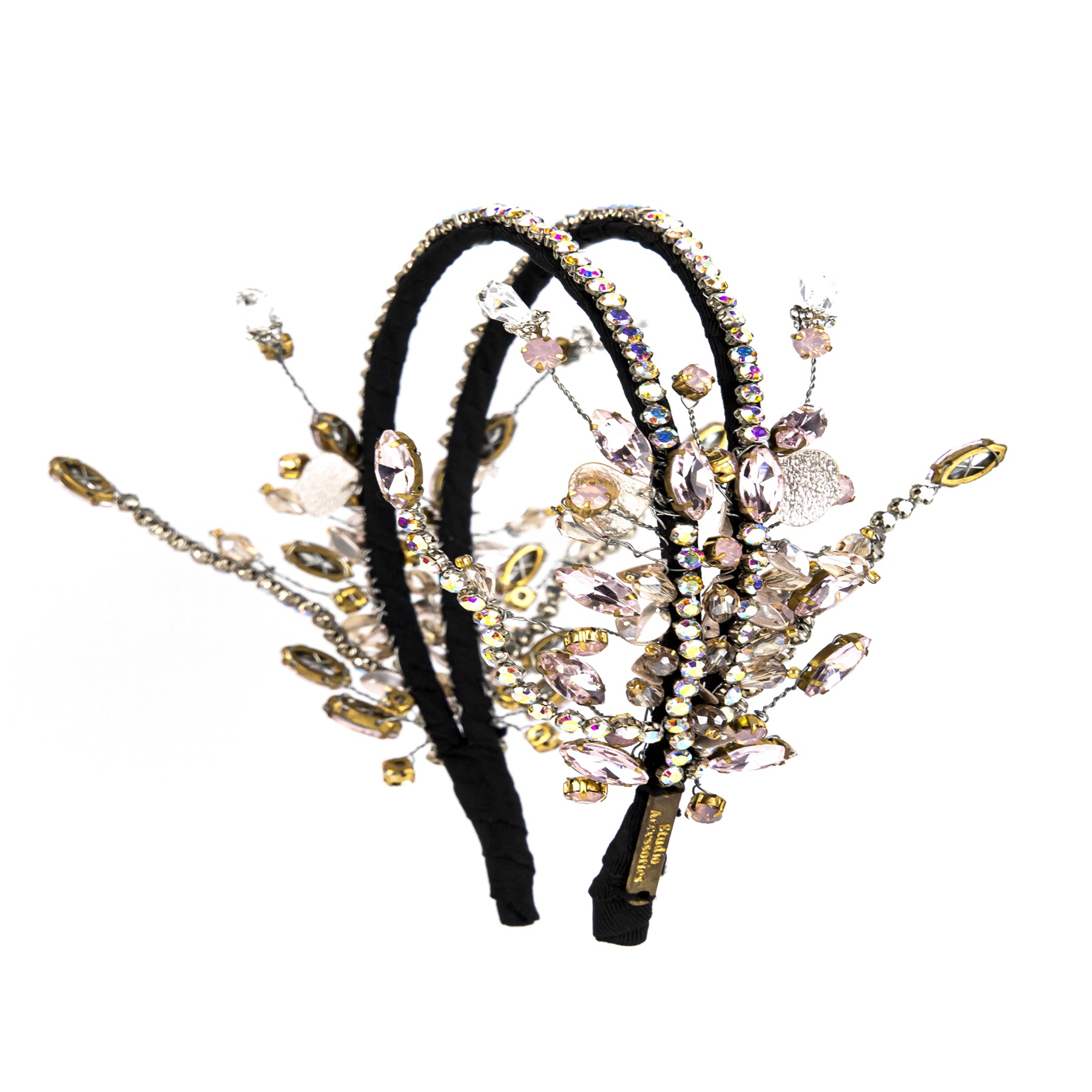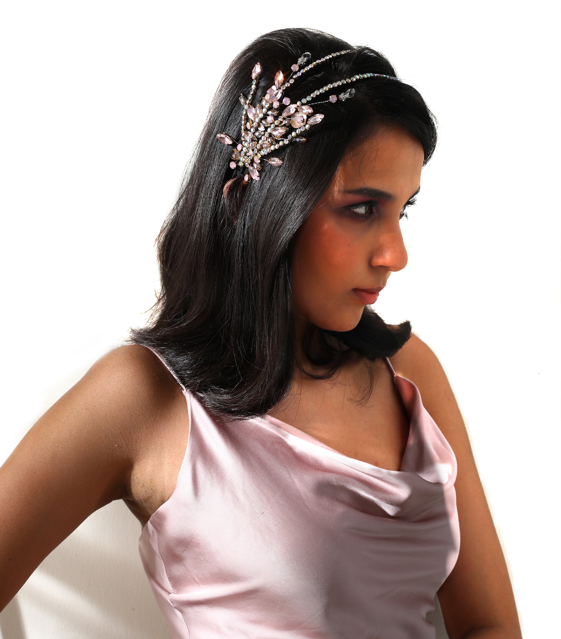This double layered crystal headgear in shades of pastel pink depicts the wildly sprouting petals and flowers in a controlled way.