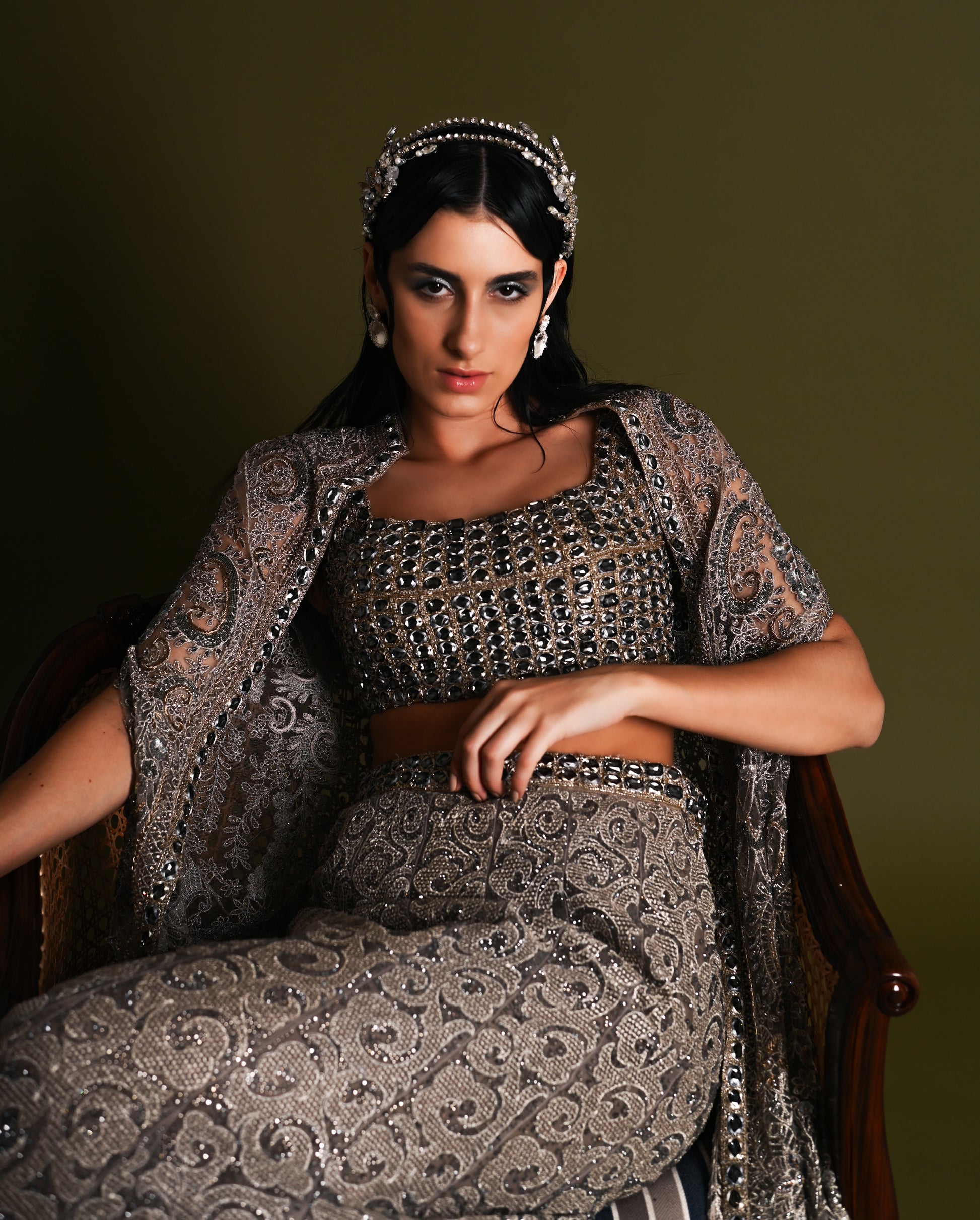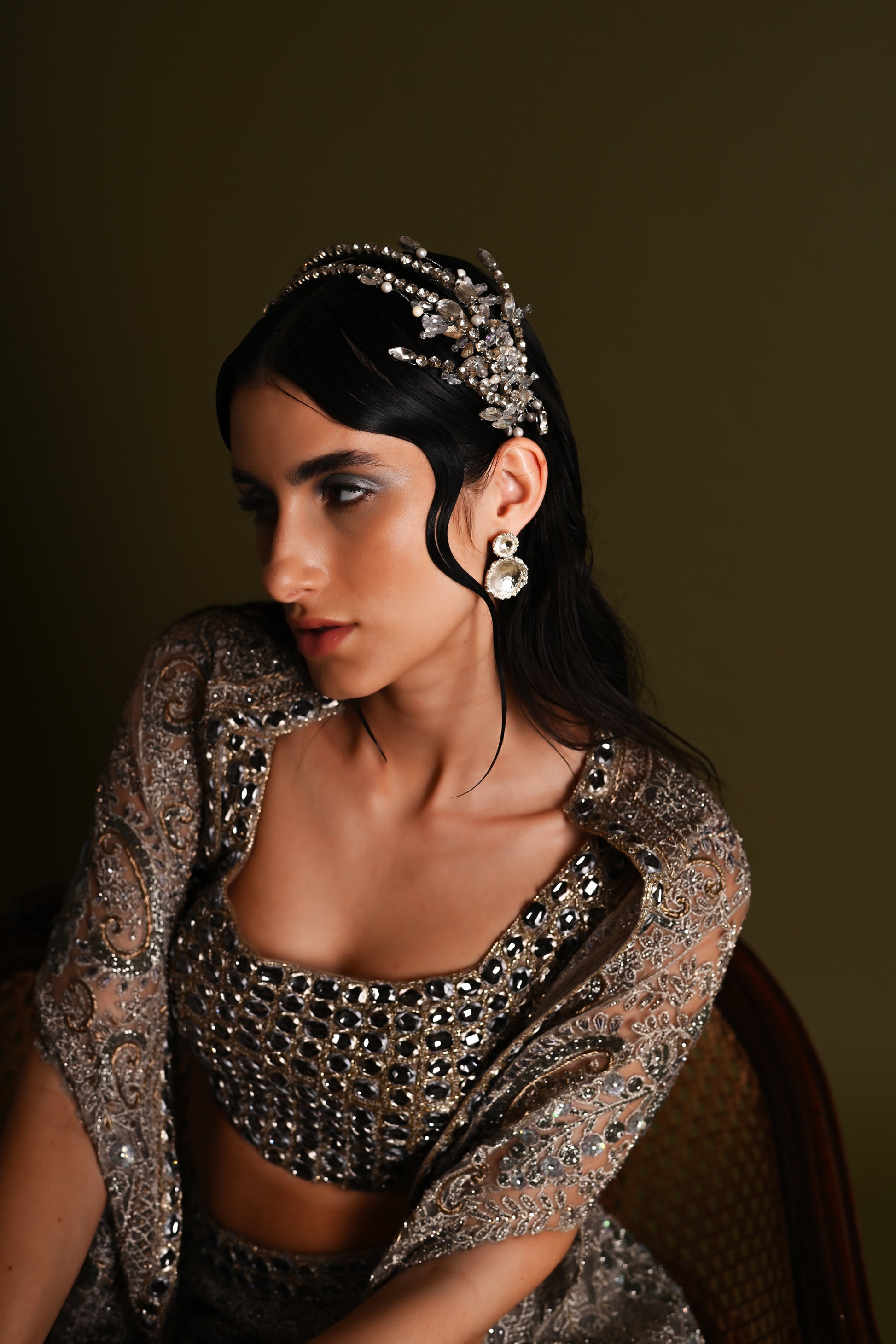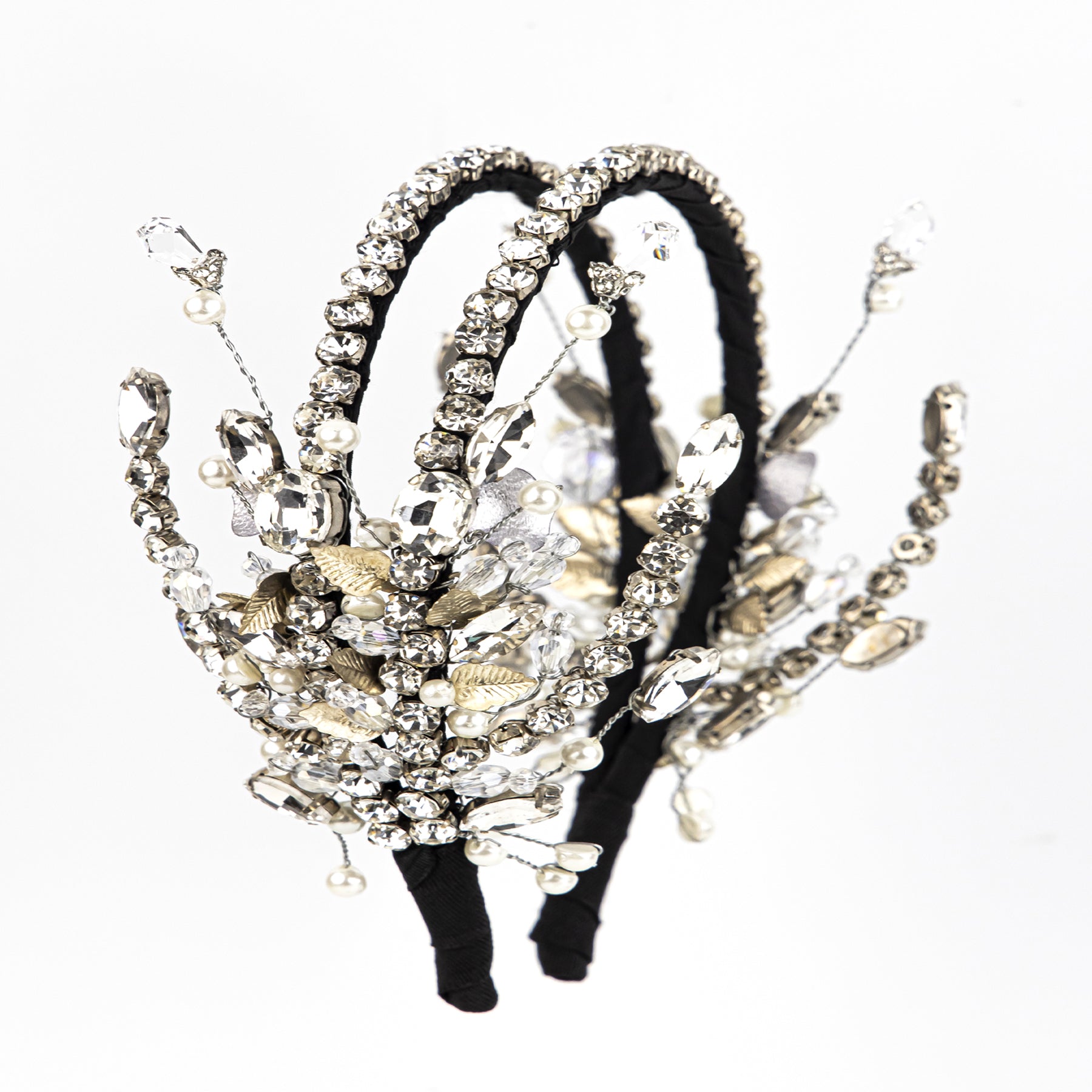 Bornflash Crystal, Pearls and sequins embellished silver Bridal hand beaded flower Wedding Party wear Hairband.