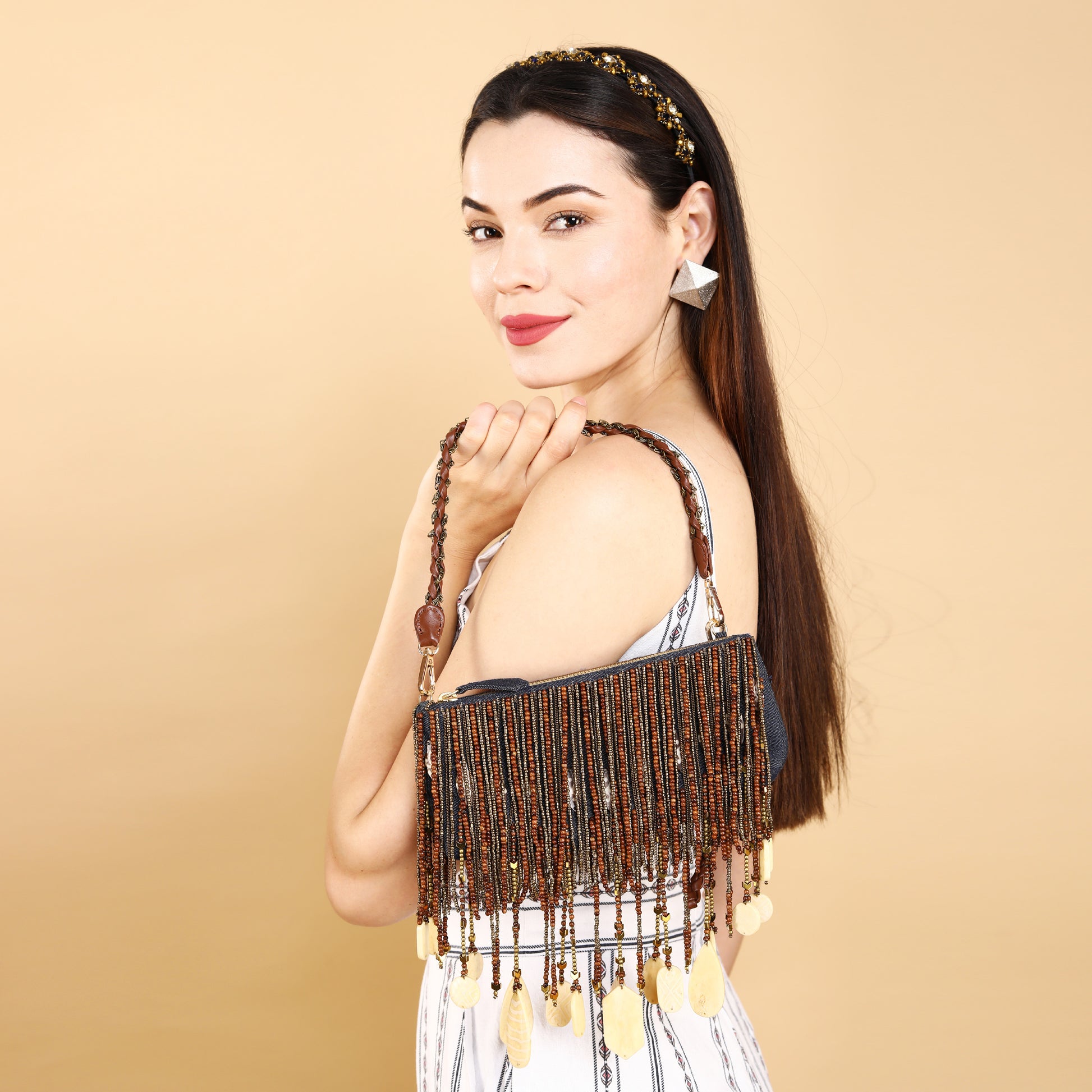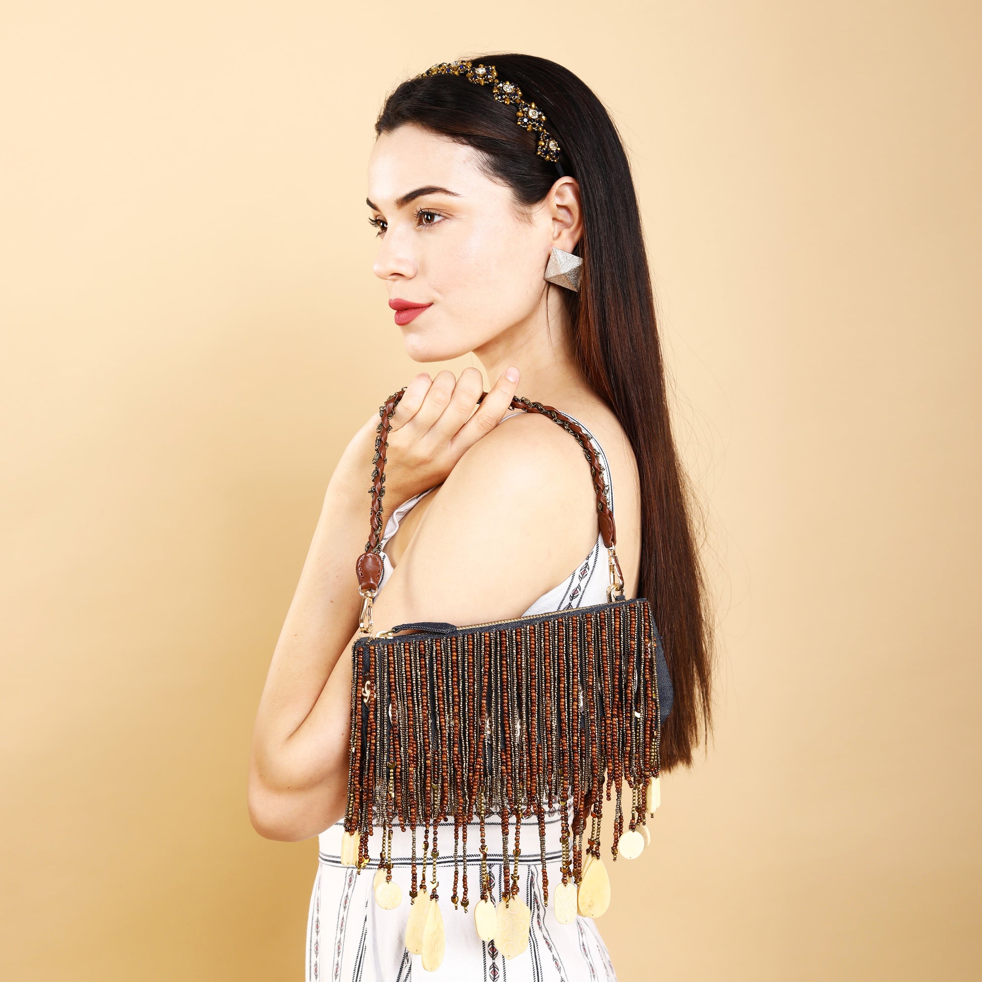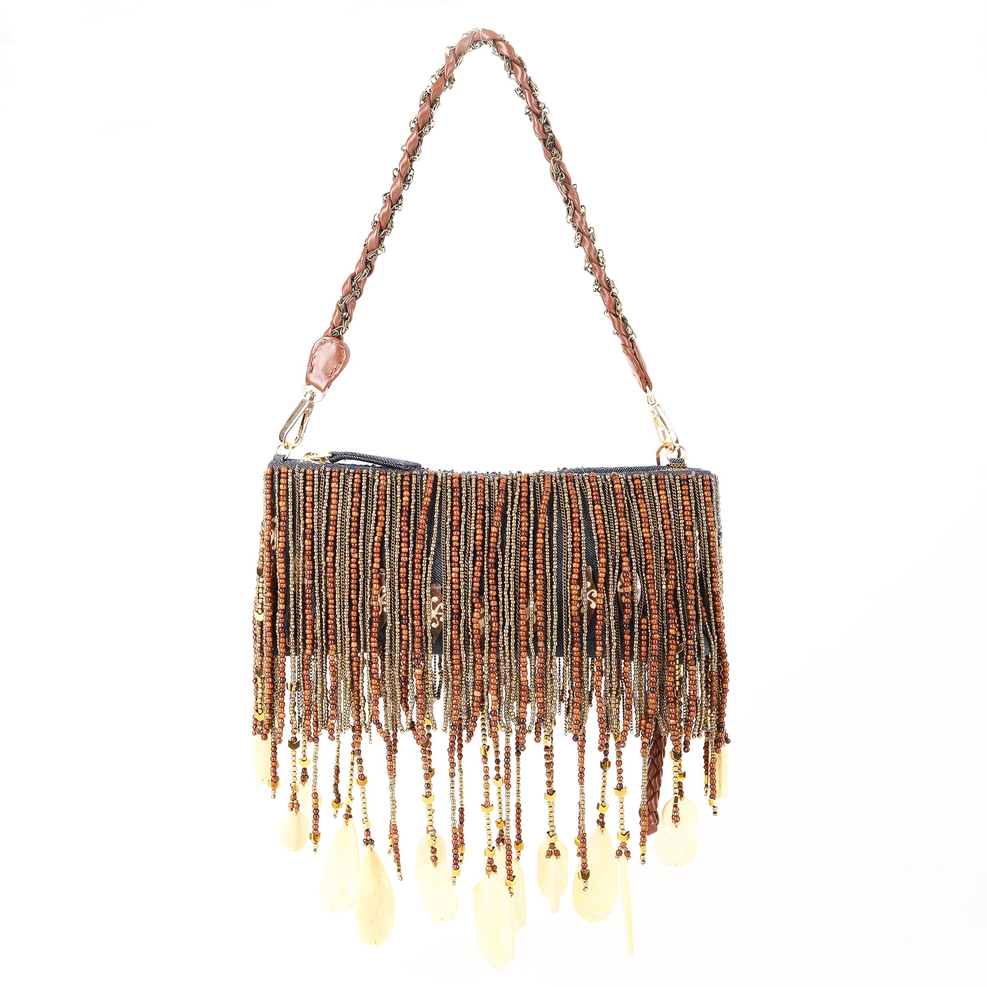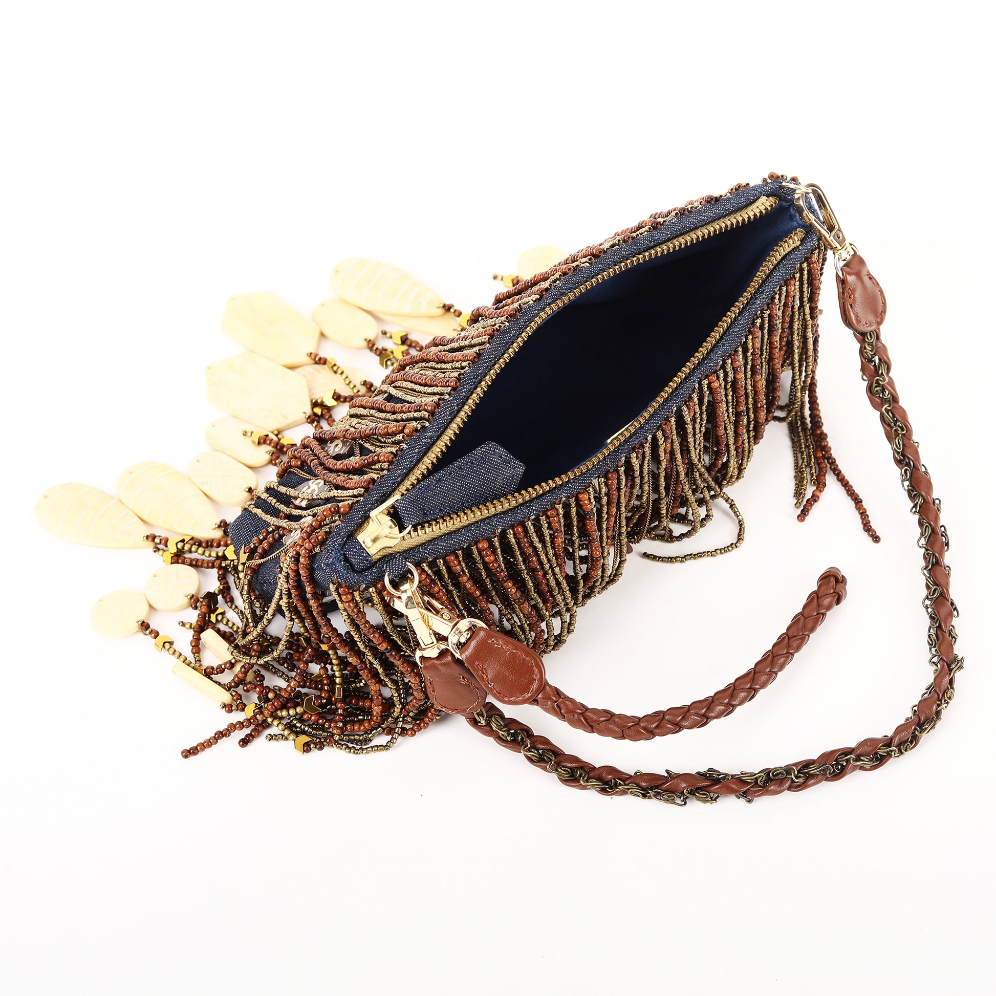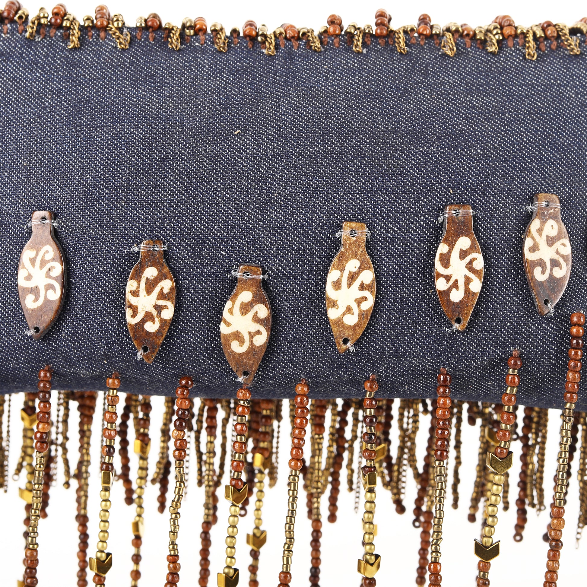 "Introducing our exquisite Denim Elegance horn tassel Bag , meticulously crafted with a denim base, adorned with intricate hand-beaded details. Its luxurious leather and metal chain handle add a touch of sophistication, while the embellished wooden, brass, pearl beaded and horn tassels elevate its charm. Perfect for special occasions, weddings, and parties, this bag effortlessly combines style and elegance to make a statement wherever you go."