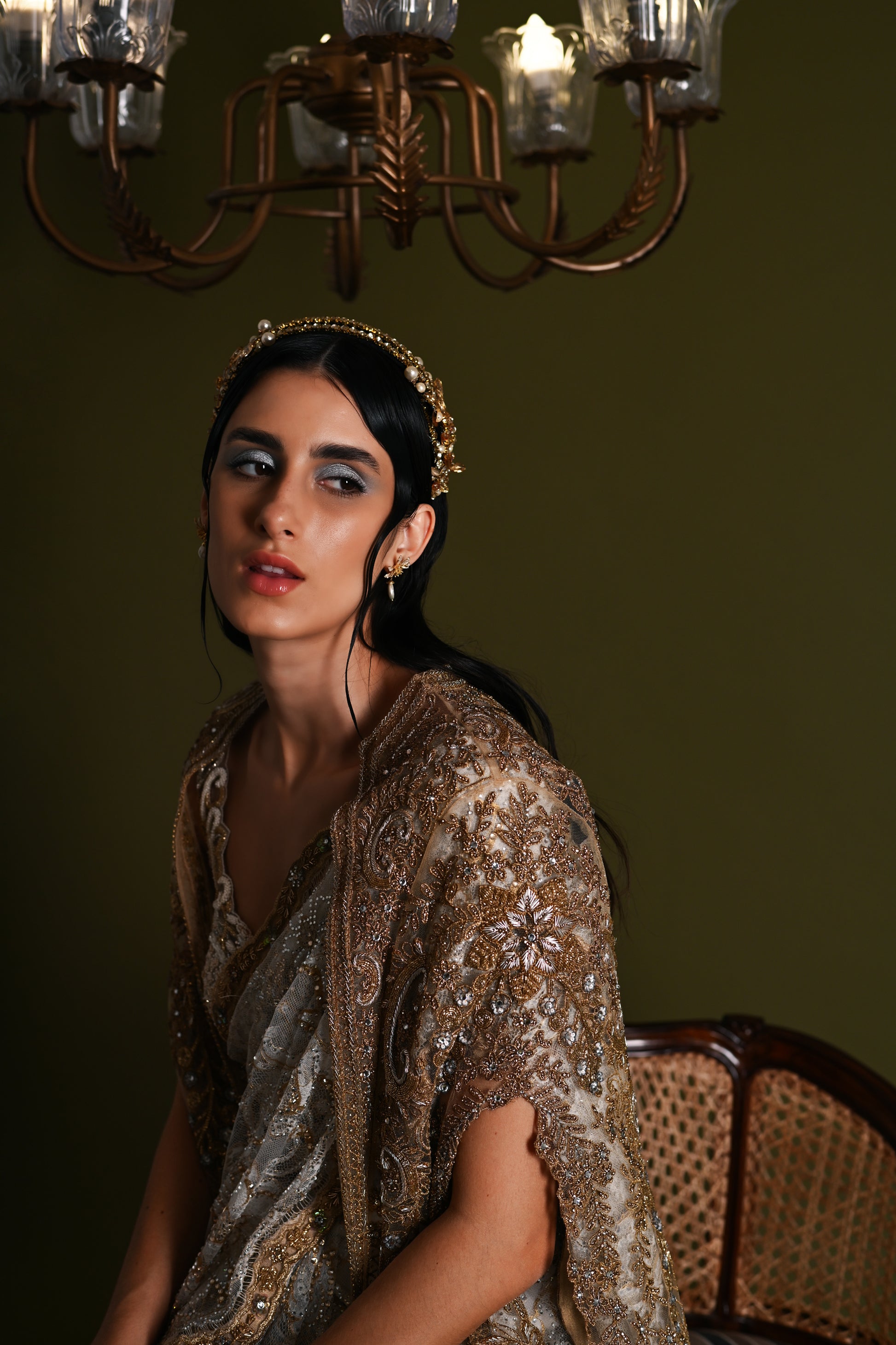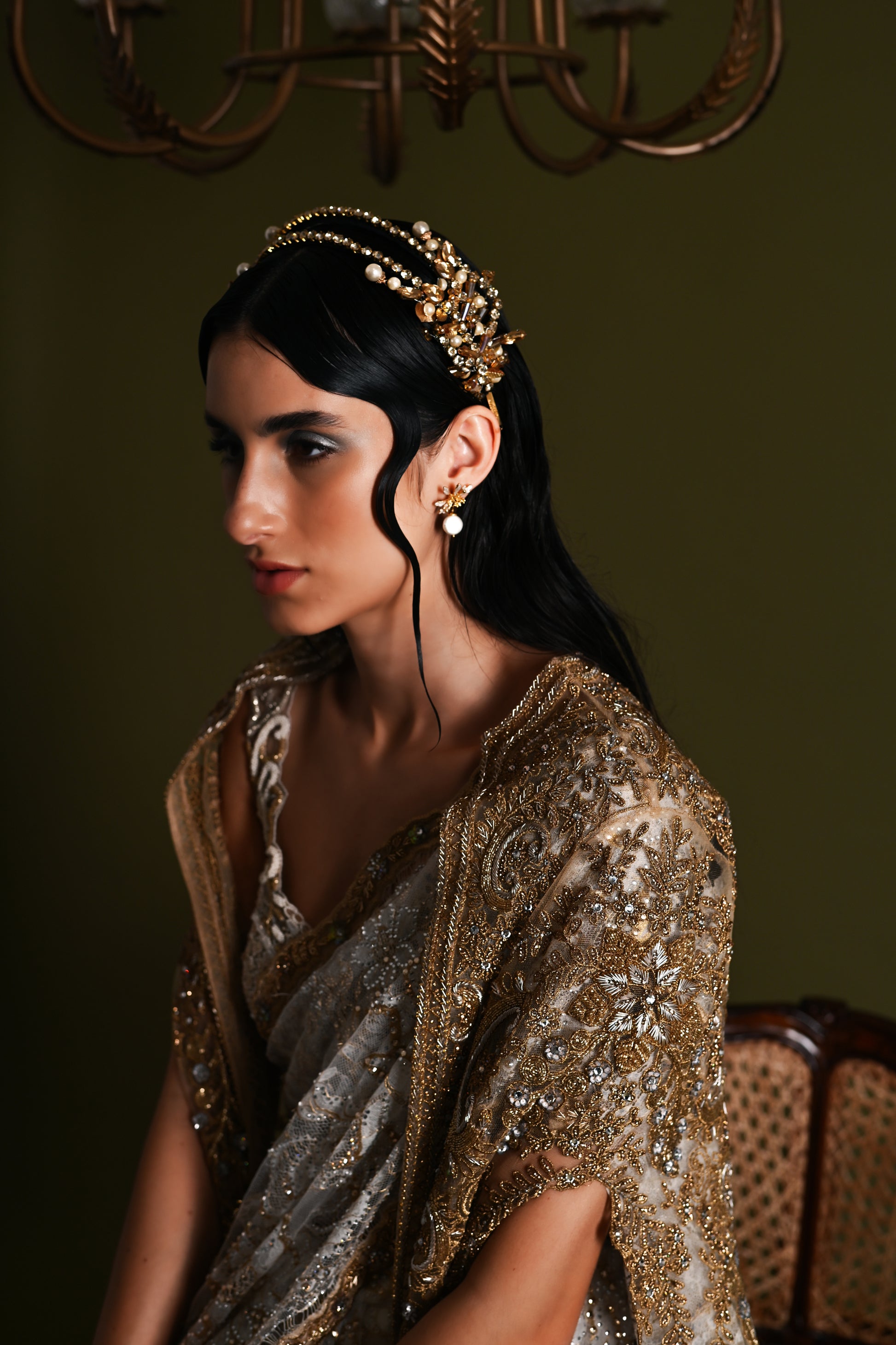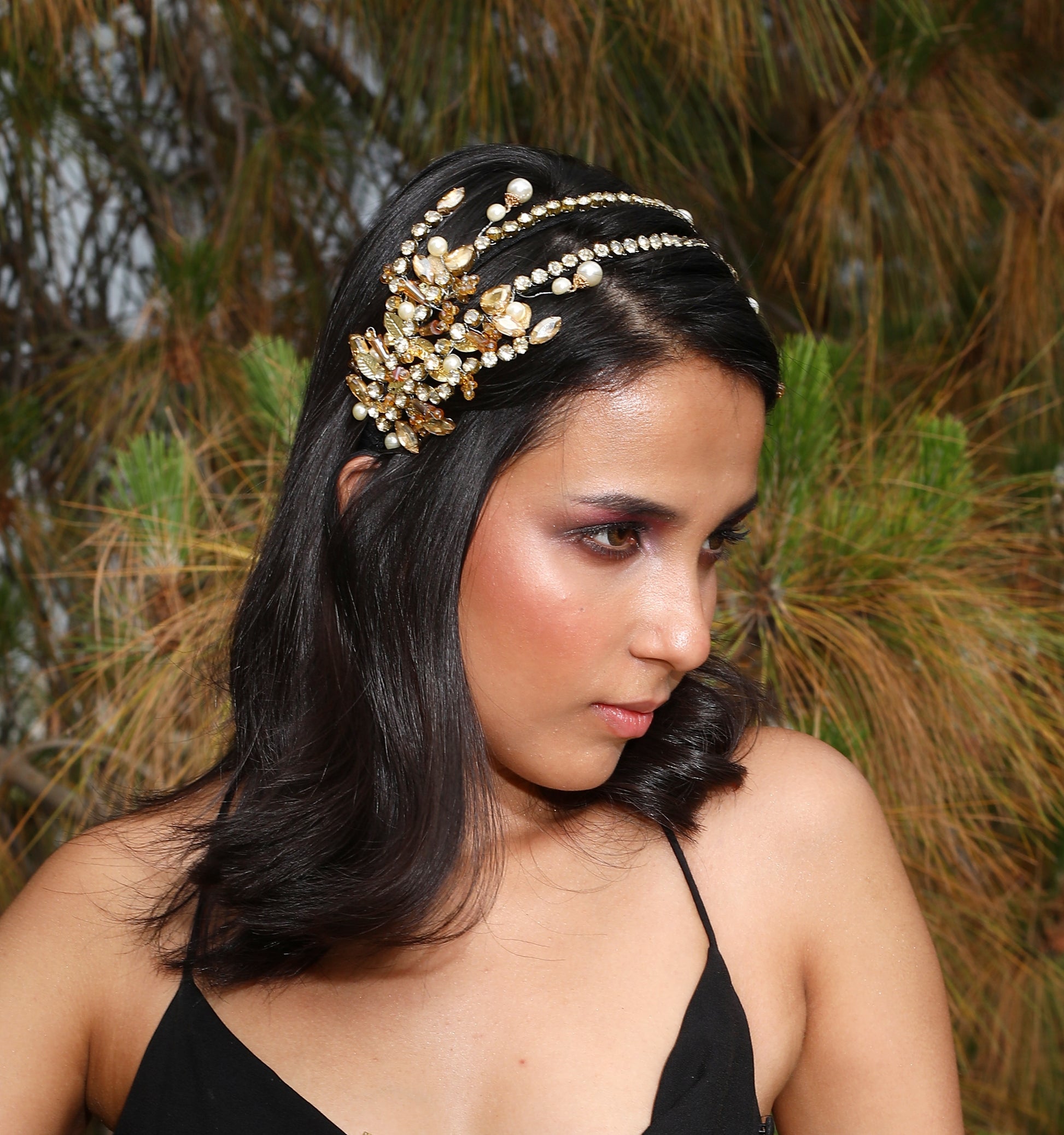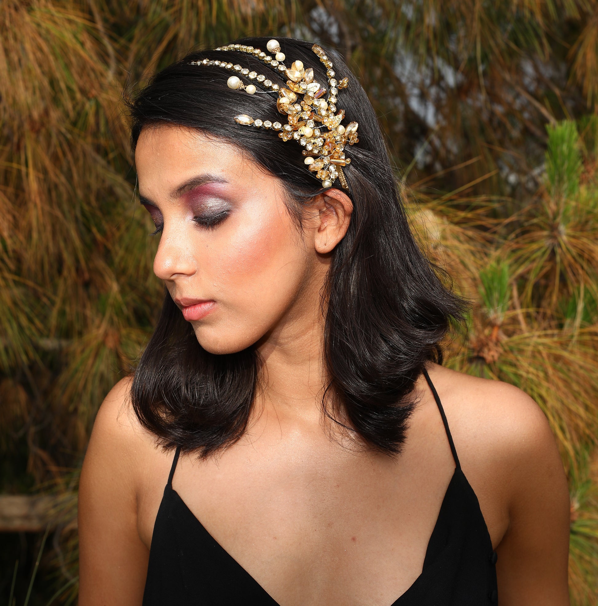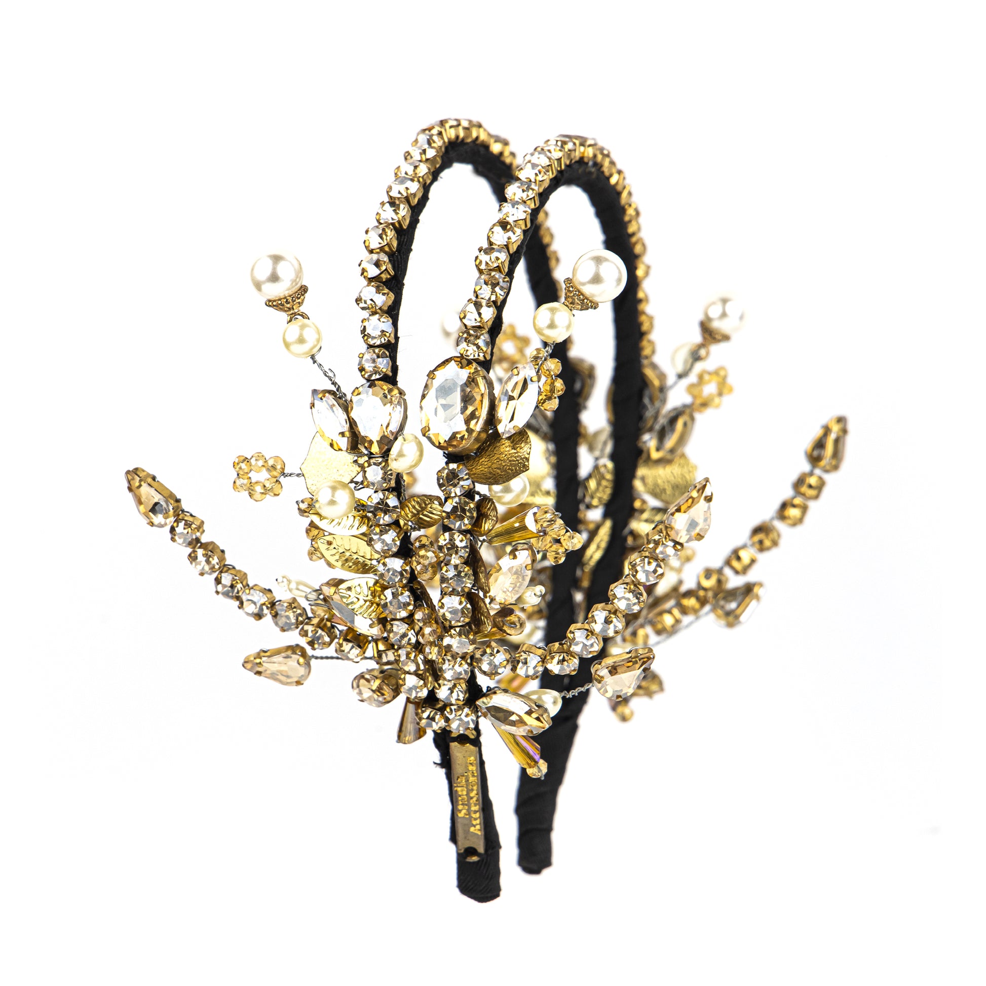 Bornflash Crystal, beads, Pearls and sequins embellished gold Bridal hand beaded flower Wedding Party wear Hairband..