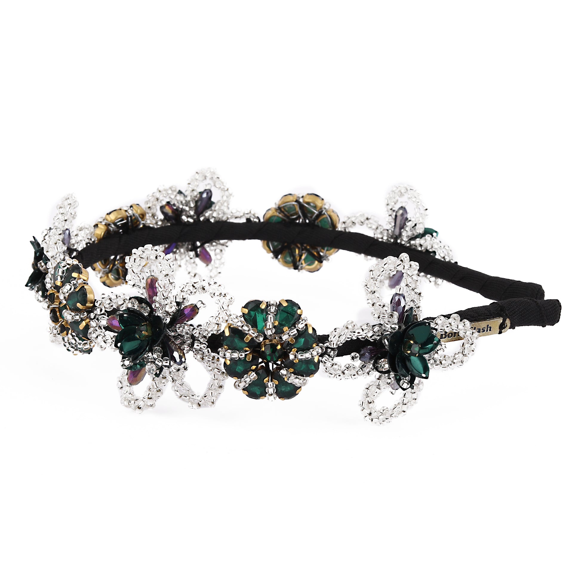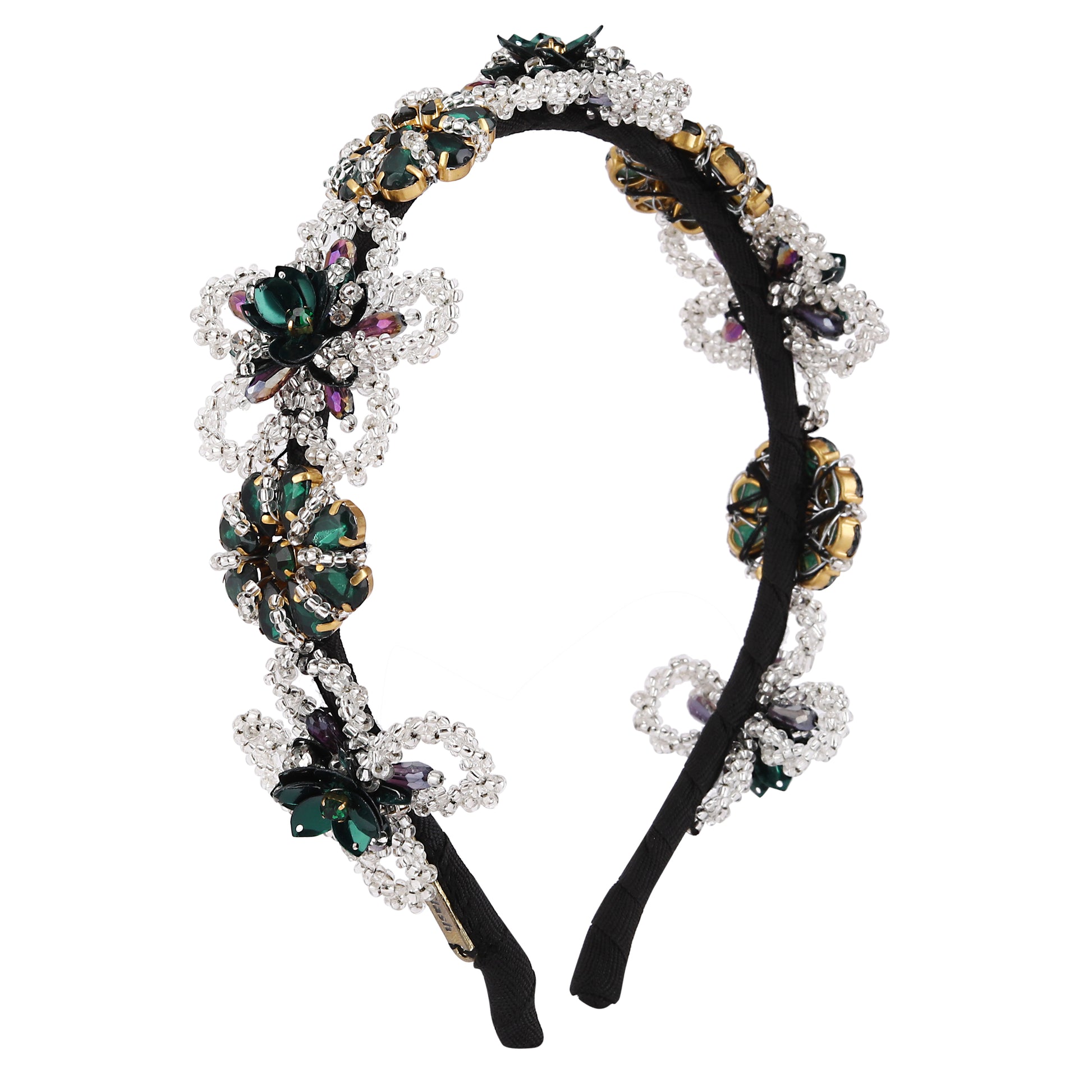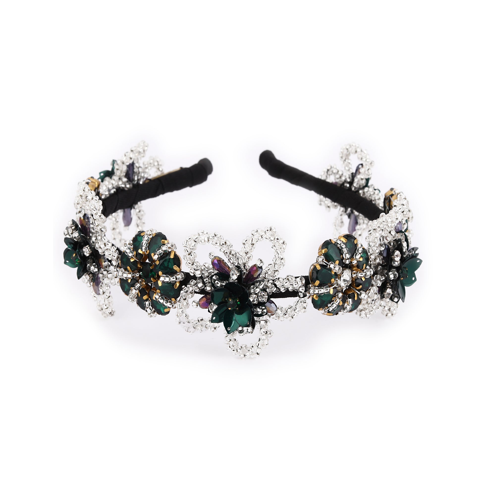 Add a regal touch to your hairstyle with the Emerald Cascade hair accessory — a luxurious silver-toned statement piece designed to captivate. This ornate hairband features an intricate cascading floral motif adorned with deep emerald green crystals and sparkling clear rhinestones. At its center lies a bold emerald green crystal, surrounded by shimmering accents and delicate silver filigree scrollwork. The tiered design gracefully transitions from petite florals at the top to larger, bloom-like elements at the base, creating a dynamic, flowing silhouette. Handcrafted with exquisite attention to detail, this hair accessory is perfect for bridal wear, festive occasions, or evening events. A must-have for those seeking elegance with a pop of rich color.