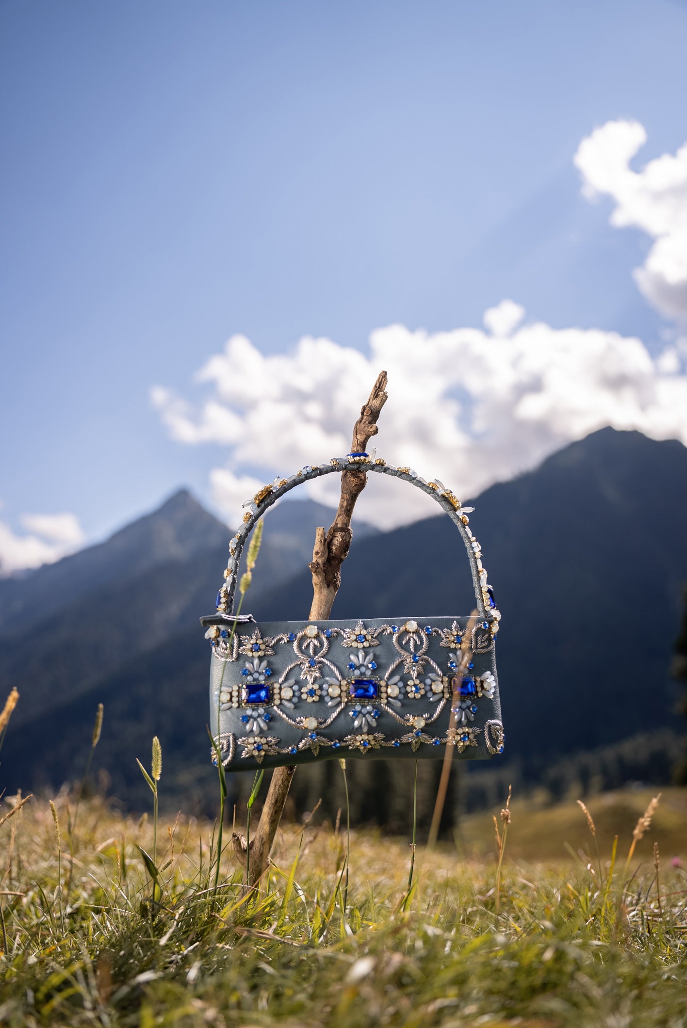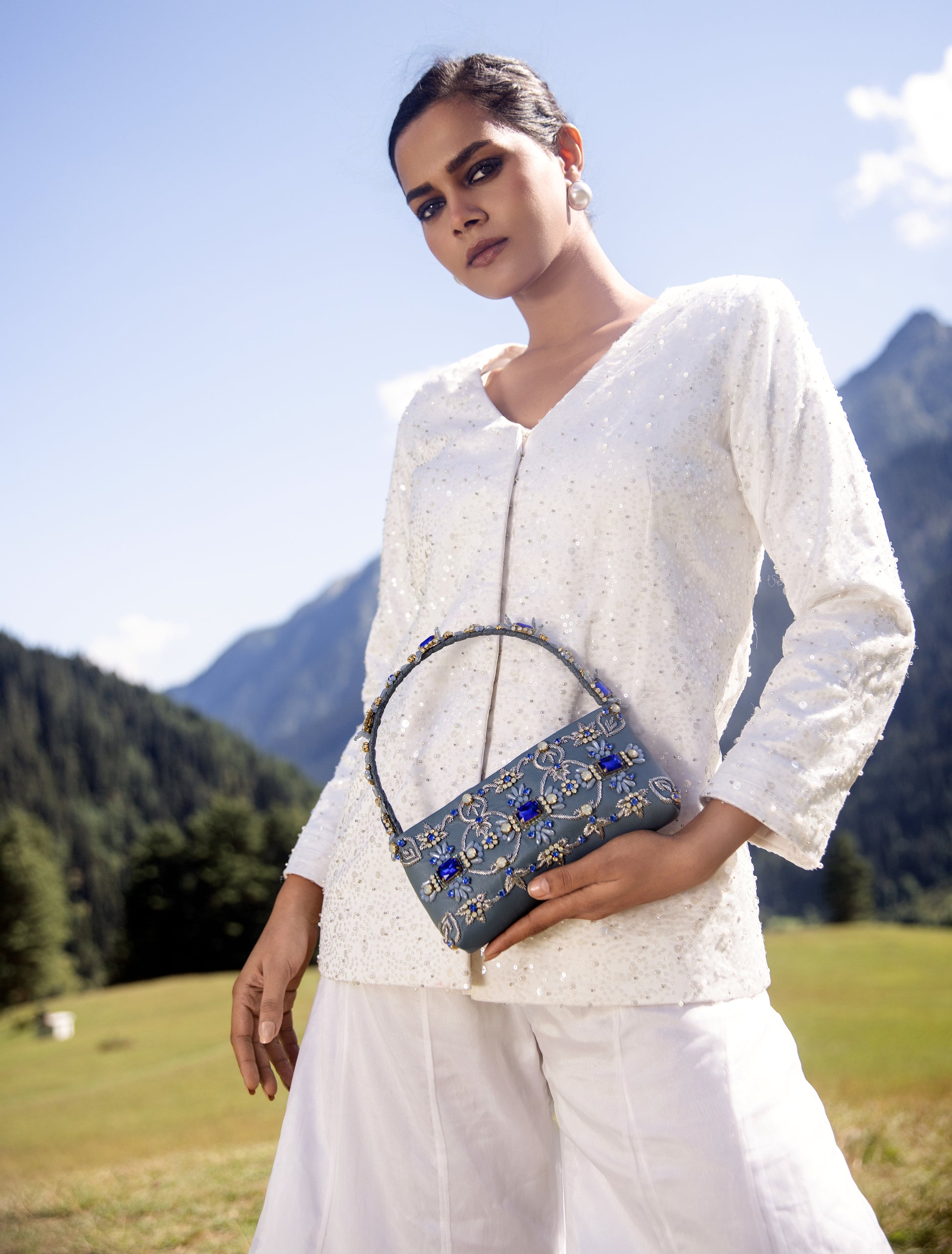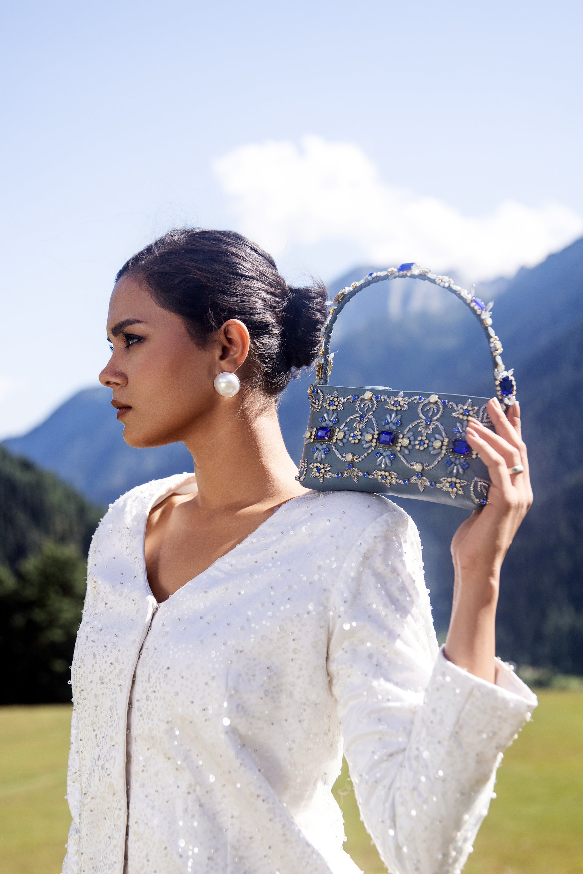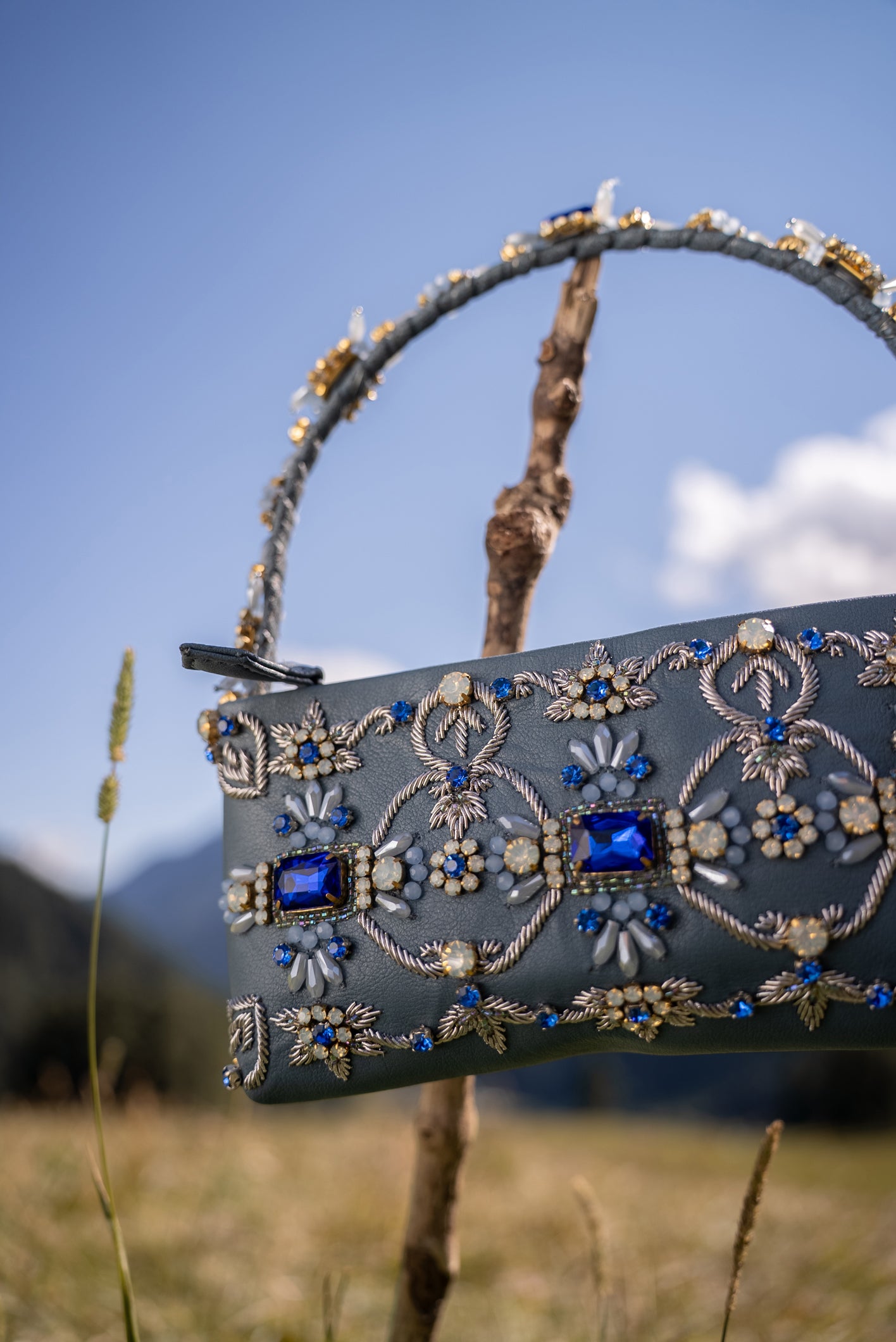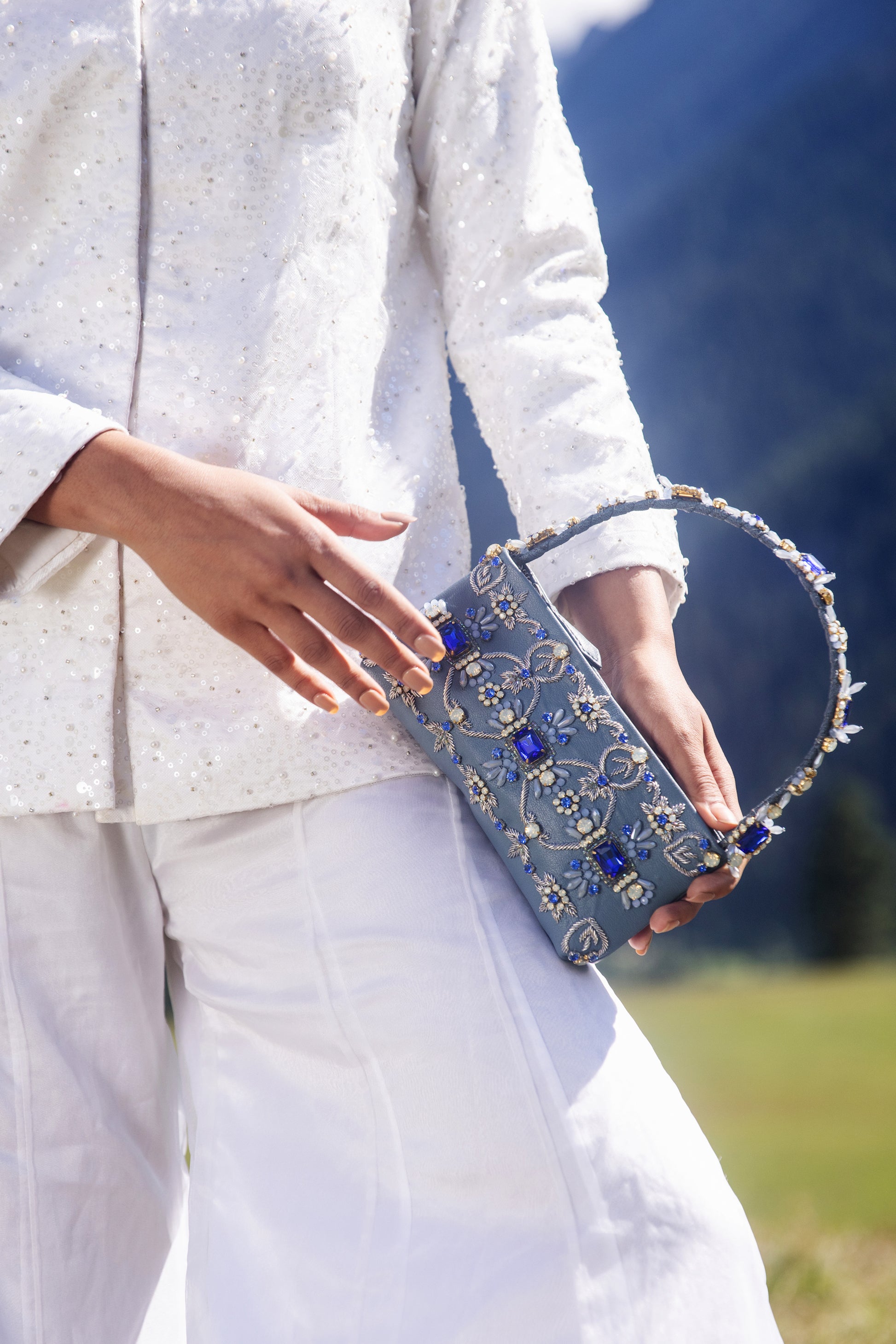 This elegant slate gray clutch bag is a sophisticated accessory, perfect for elevating any evening ensemble. Adorned with intricate silver floral beaded embroidery, it sparkles with the addition of delicate blue crystals that catch the light at every angle. The crystal-beaded handle adds a touch of luxury, ensuring both style and comfort. This clutch is the epitome of understated glamour, blending classic craftsmanship with modern design, making it a statement piece for any occasion.