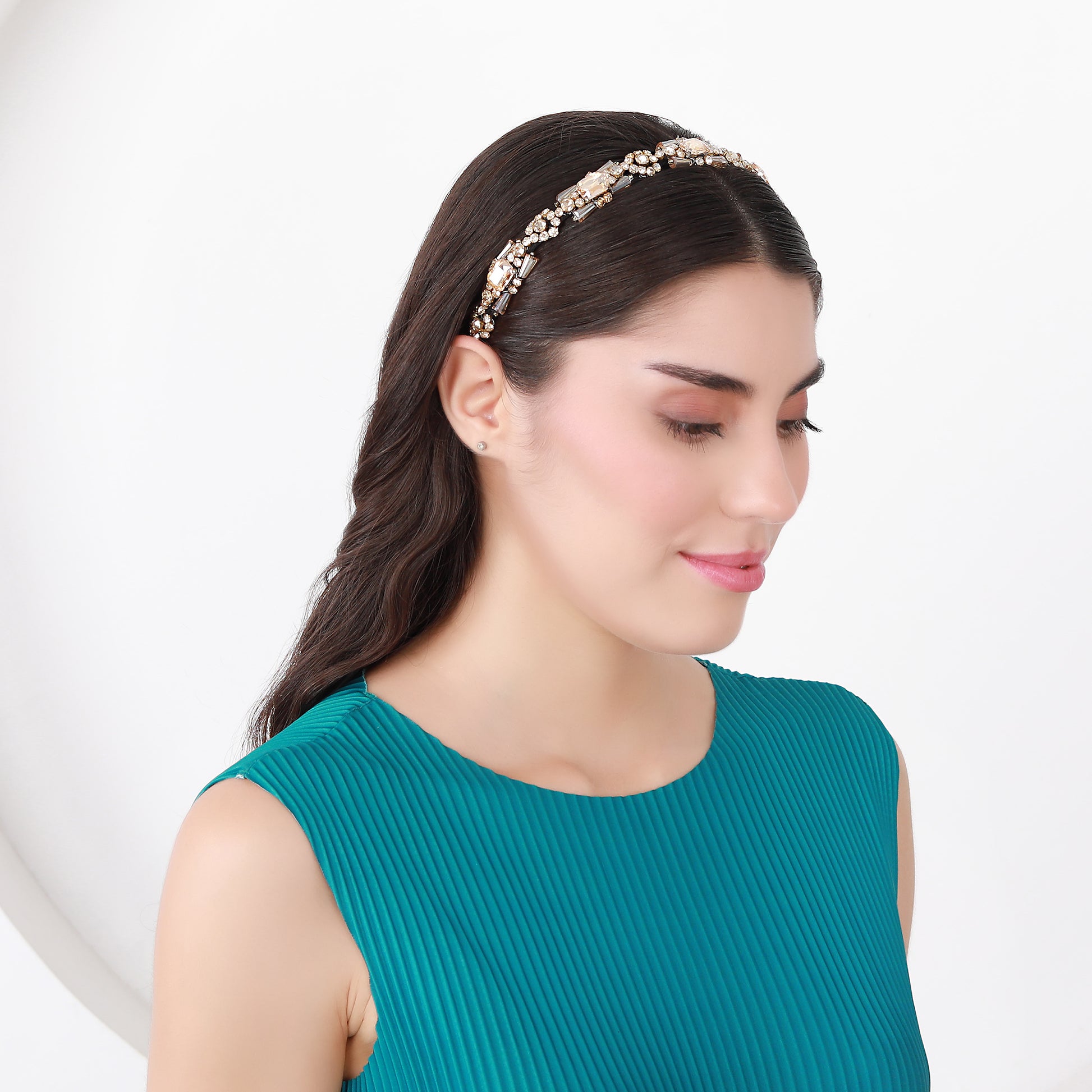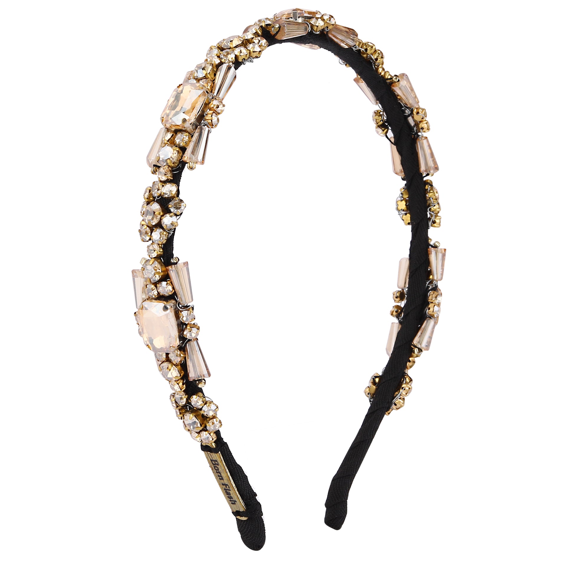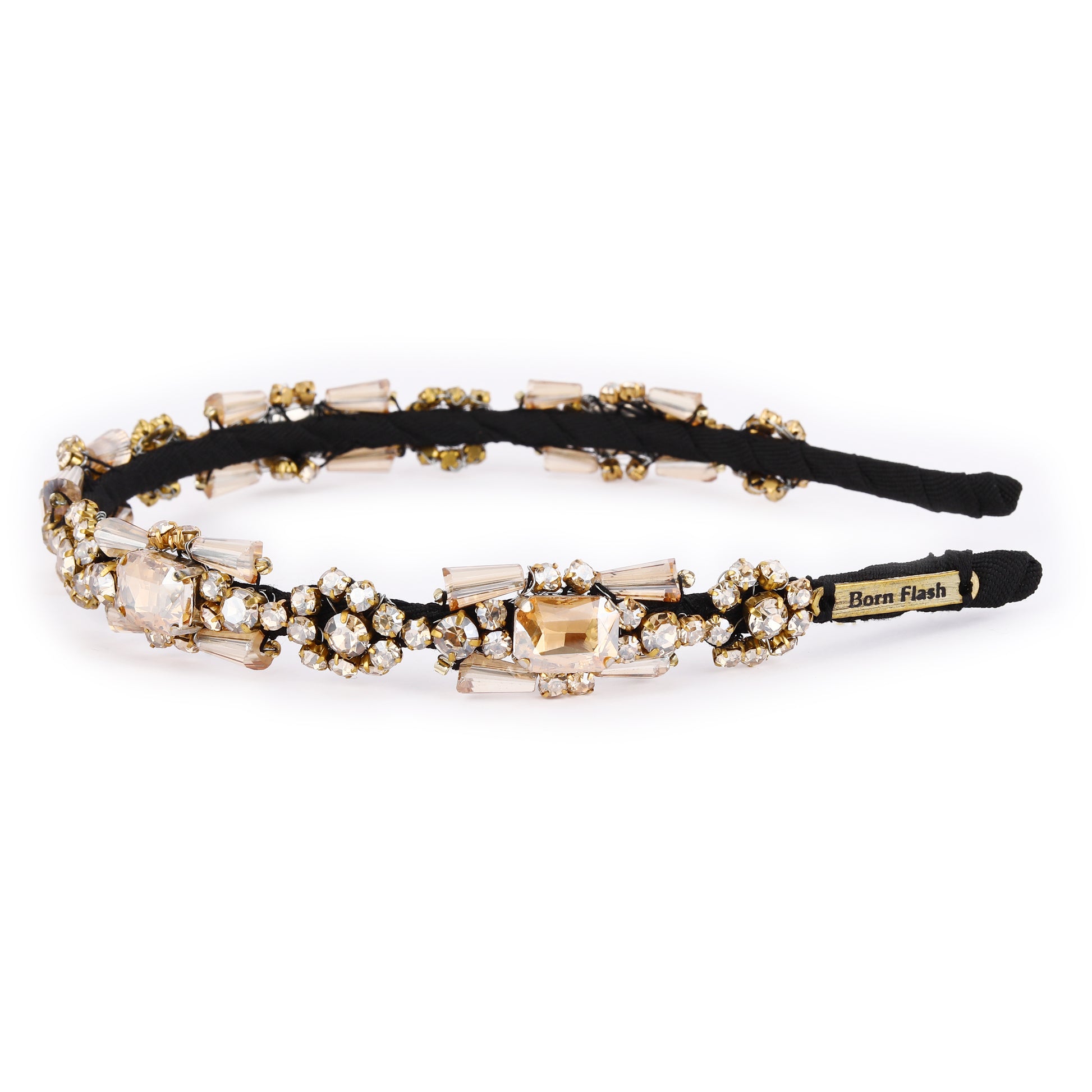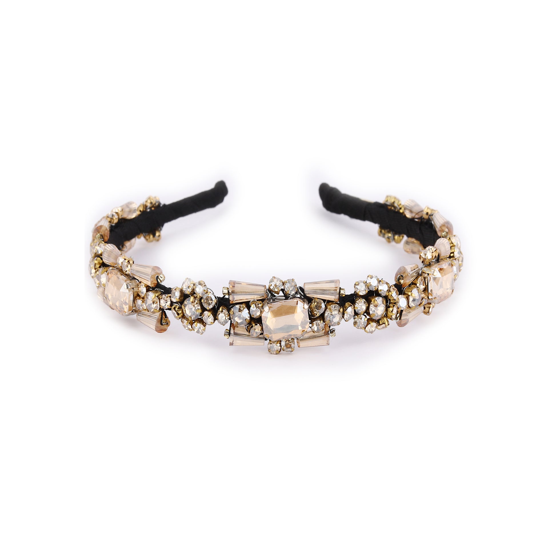 Elevate your look with this luxurious Crystal Bloom Headband, designed to add instant elegance and sparkle. Featuring a central rectangular champagne crystal surrounded by intricate gold-toned floral metalwork and shimmering clear rhinestones, this headband radiates opulence. Graduated crystal accents flow outward, transitioning seamlessly from bold centerpieces to delicate beadwork. This accessory is perfect for weddings, evening events, or adding a touch of glamour to your everyday style..
