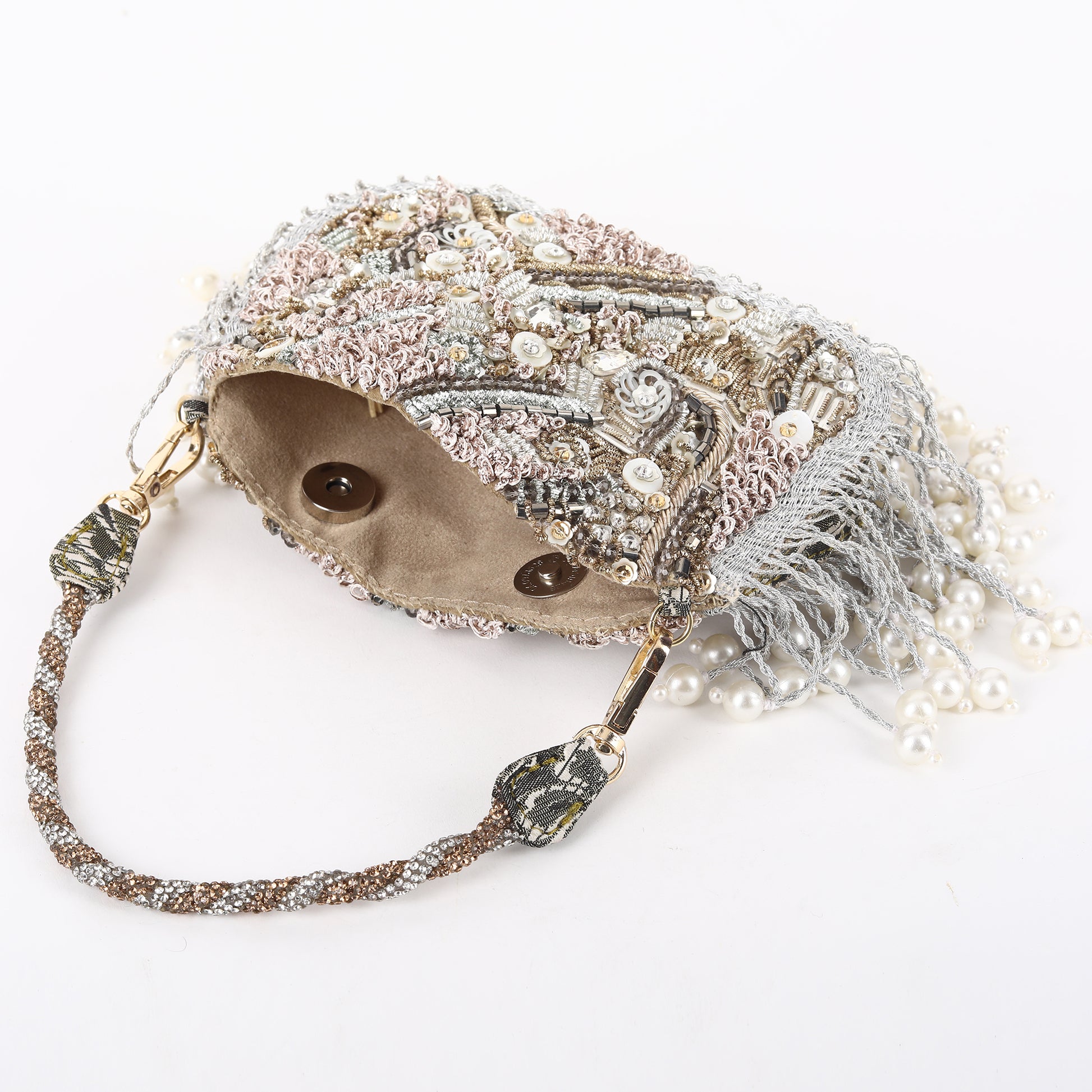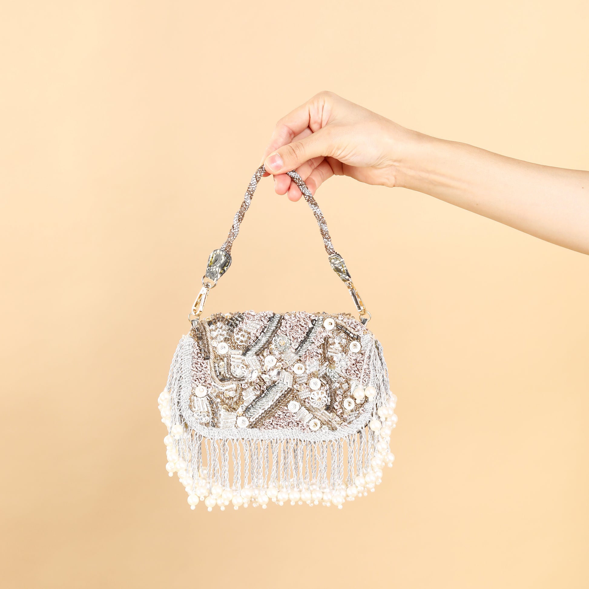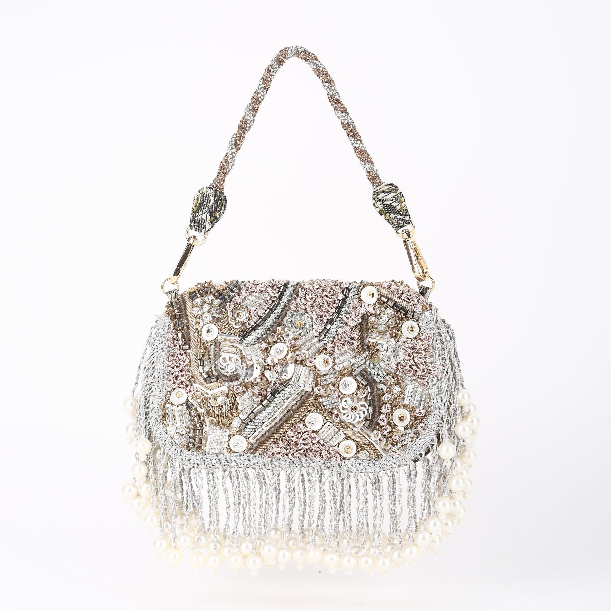 Introducing our exquisite Silver Gold Mix Shape Shifter Crystal Handle Bag, a true masterpiece of craftsmanship. This luxurious accessory features intricate pearl and shell detailing on both sides, each element meticulously arranged by skilled artisans. The bag is adorned with delicate dapka work, showcasing the finesse of traditional hand embroidery. Every piece is a testament to hand craftsmanship, with shimmering crystals integrated into the handle, offering a mesmerizing blend of silver and gold tones. This bag is not just an accessory, but a statement of elegance and sophistication, perfect for any occasion where you wish to shine.