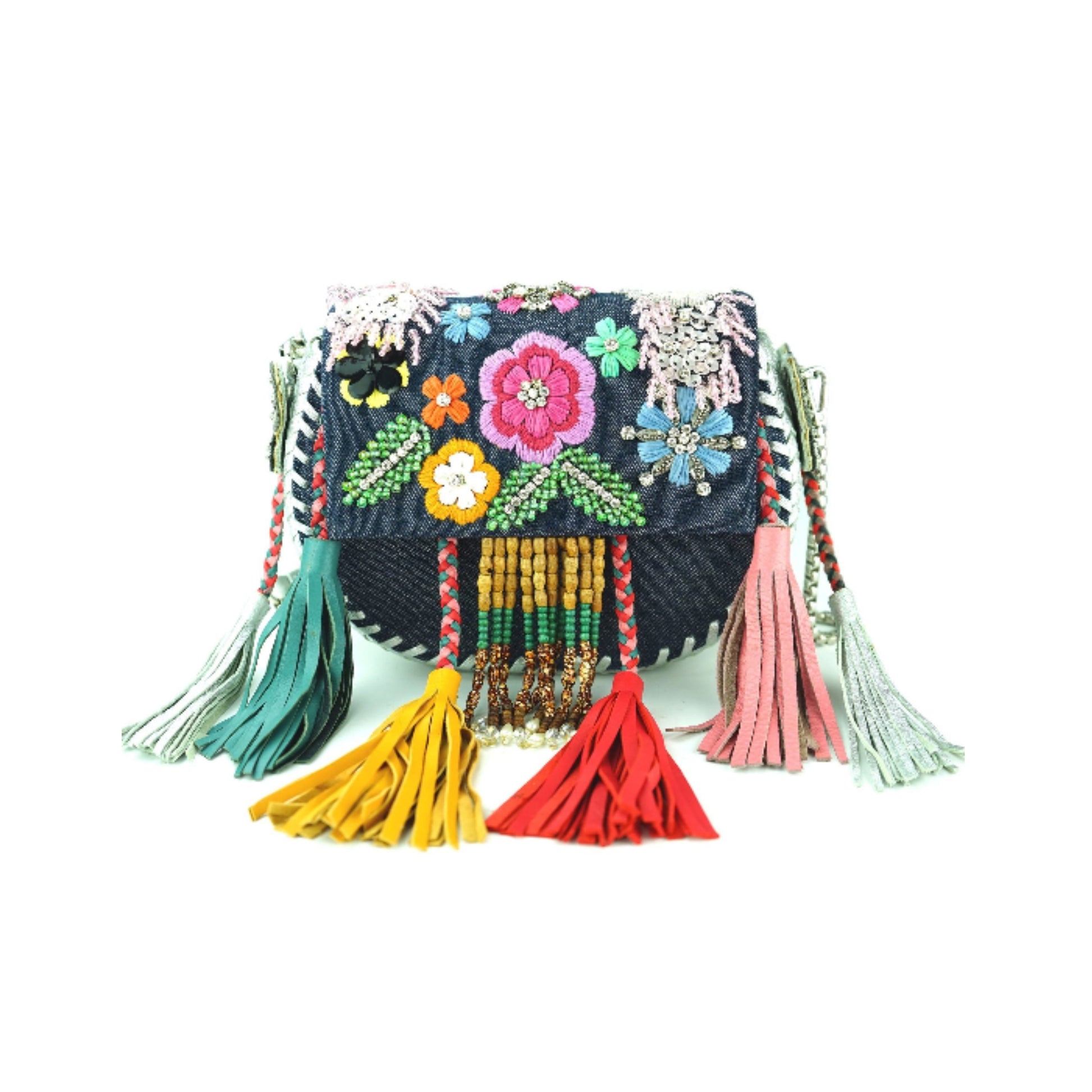 Featuring a Multicolor floral Denim and Leather hand embroidery clutch bag with crystals, sequins, beads and leather tassels embellishment, suspended with a Silver sling chain..