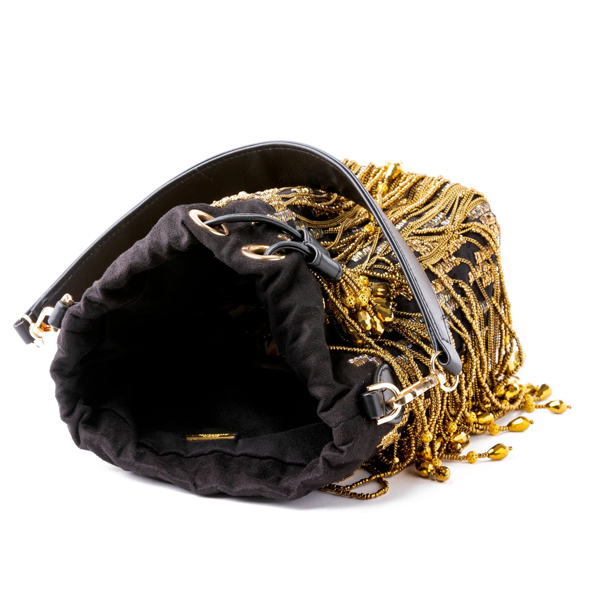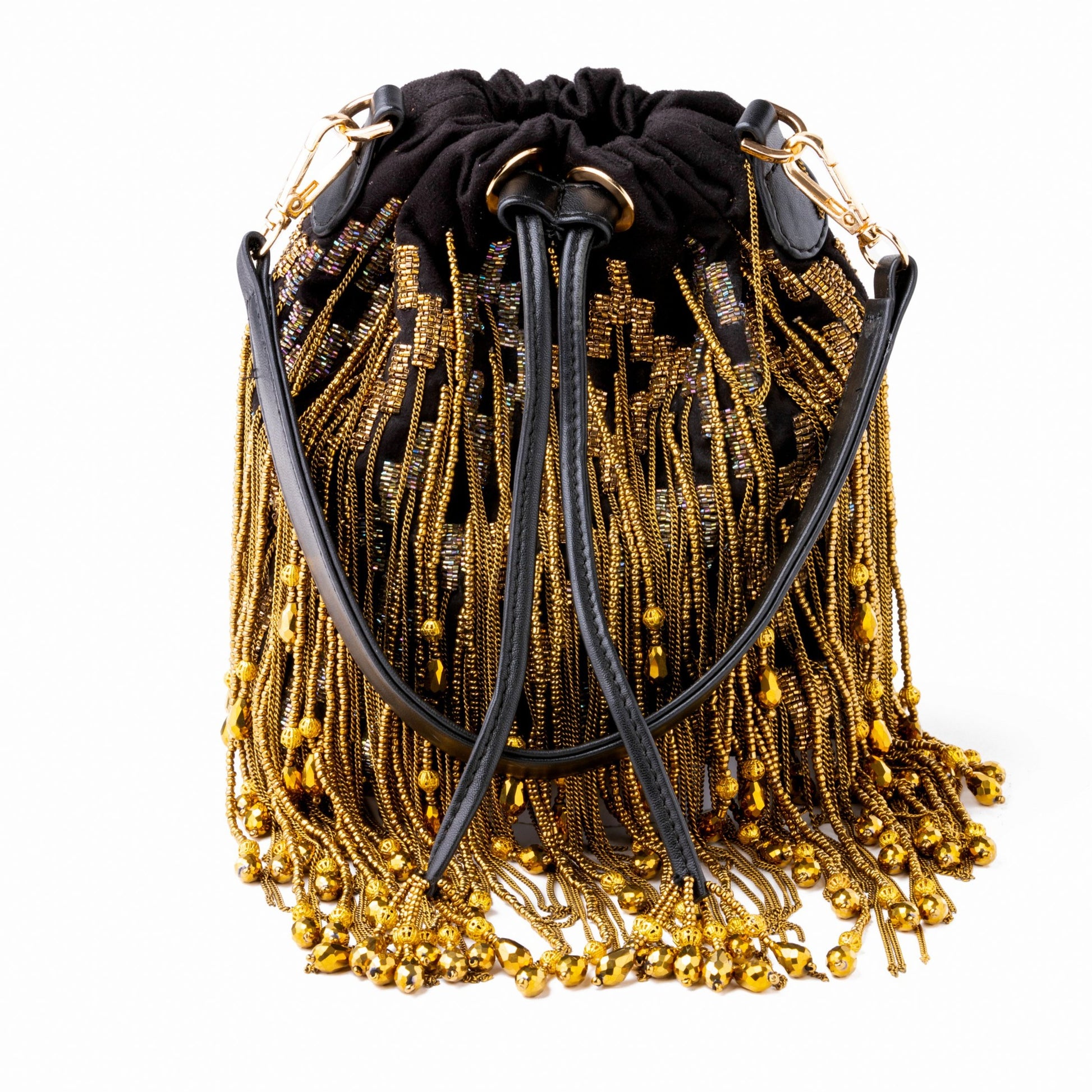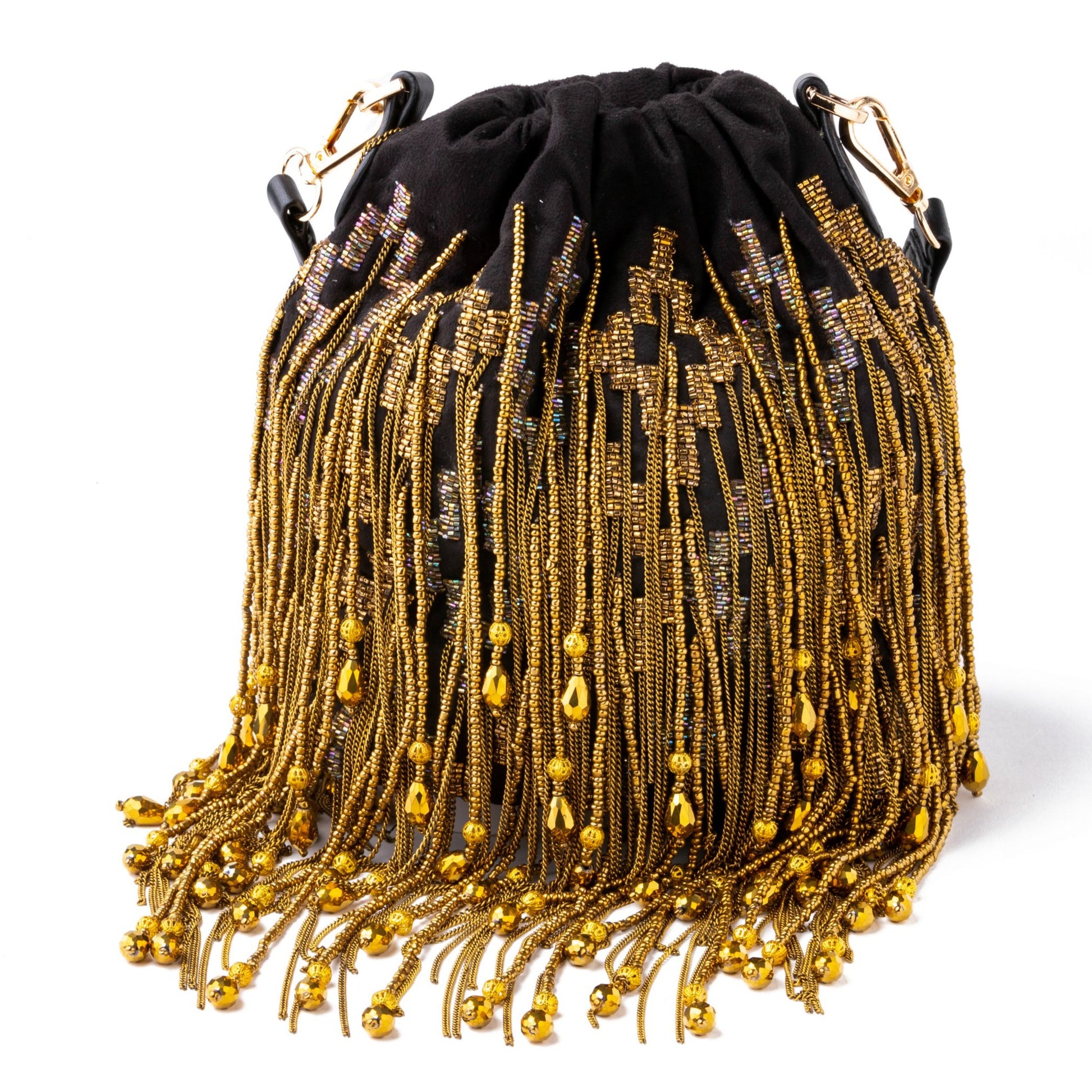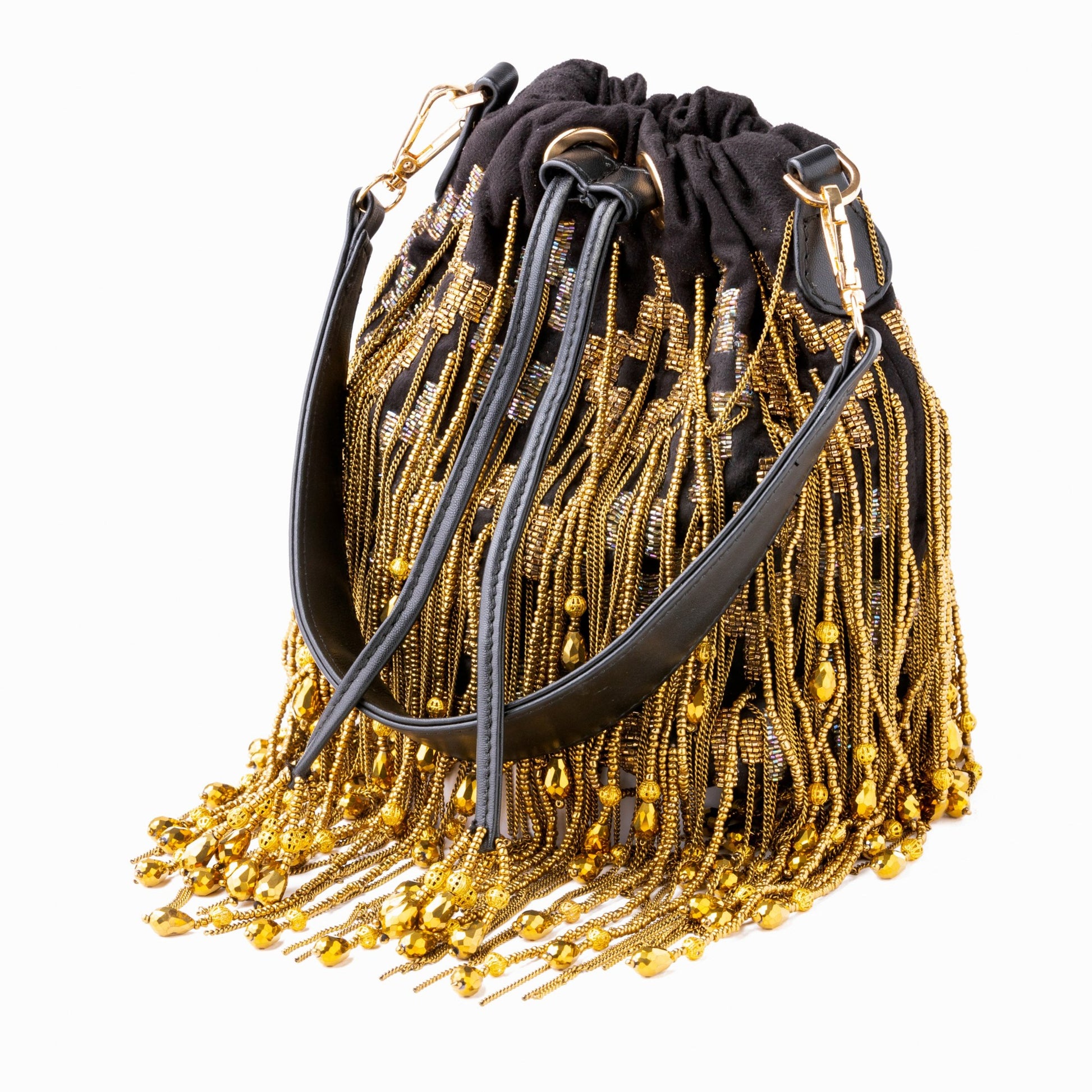 Featuring a Black color fabric chain tassels potli bag embellished with beads and chains hanging all over. Color: Black ,Gold |