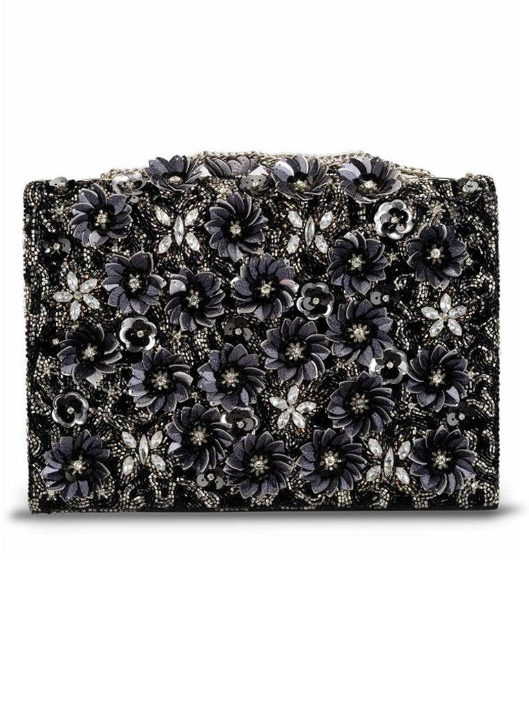 The Front Of This Black Large Leather Clutch Is Fully Hand Beaded In A Black Silver And Gold Floral Motif. It Has A Suede Lined Interior Large Enough For A Cellphone, Compact And Keys. The Chain Strap Can Be Worn Long Or Short Depending On The Look.