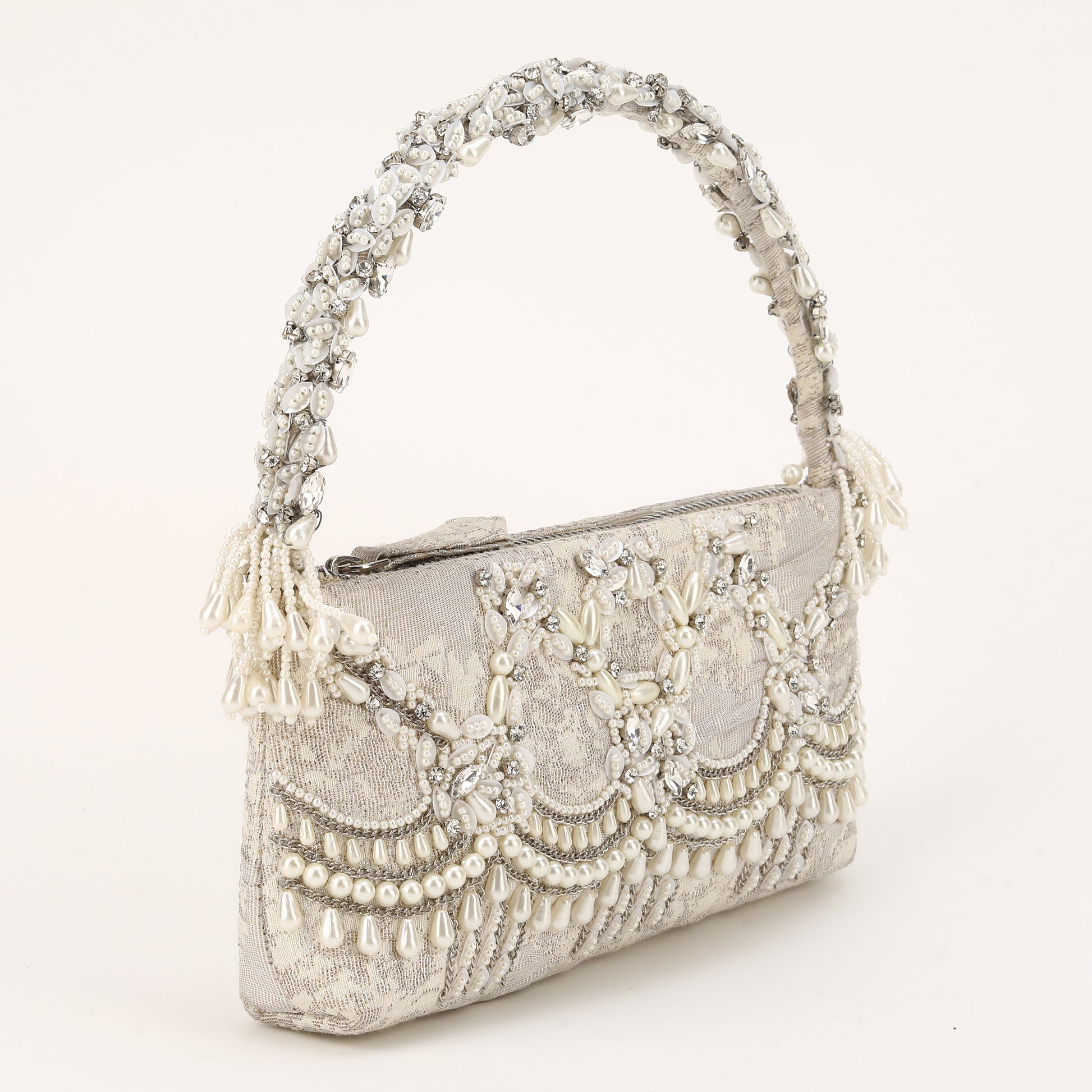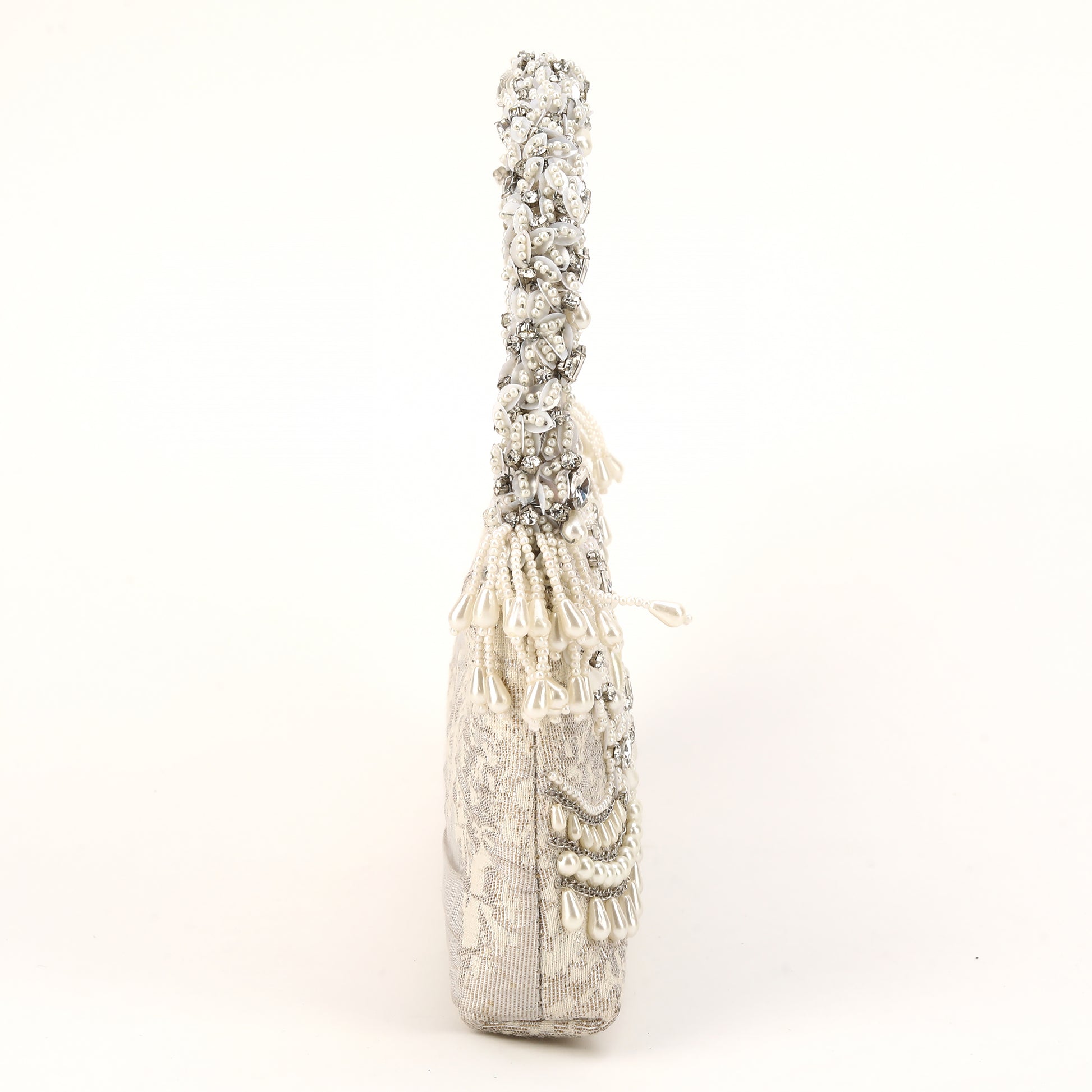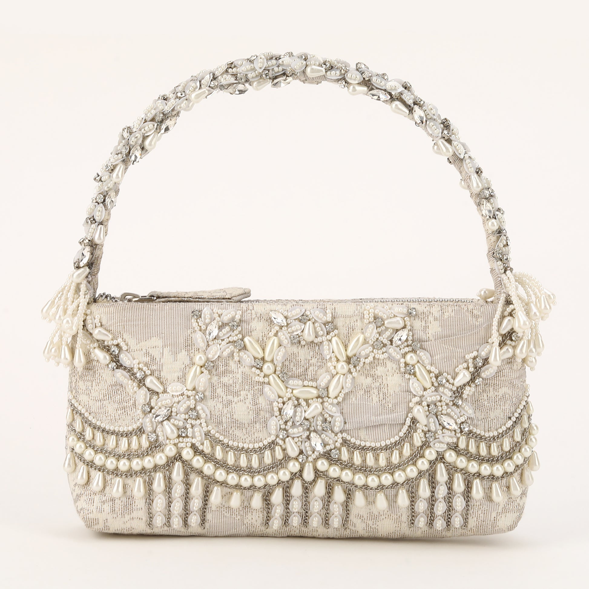 This exquisite bag is crafted from luxurious silk jacquard, perfect for wedding parties and special occasions. The front is adorned with intricate embellishments, including pearls, crystals, and sequins, and pearl tassel detailing on the side a dazzling display of elegance. The handle is a work of art itself, hand-beaded with crystals, pearls, and sequins and zipper closure adding a touch of opulence to the overall design. This bag is not just an accessory but a statement piece, embodying sophistication and glamour.