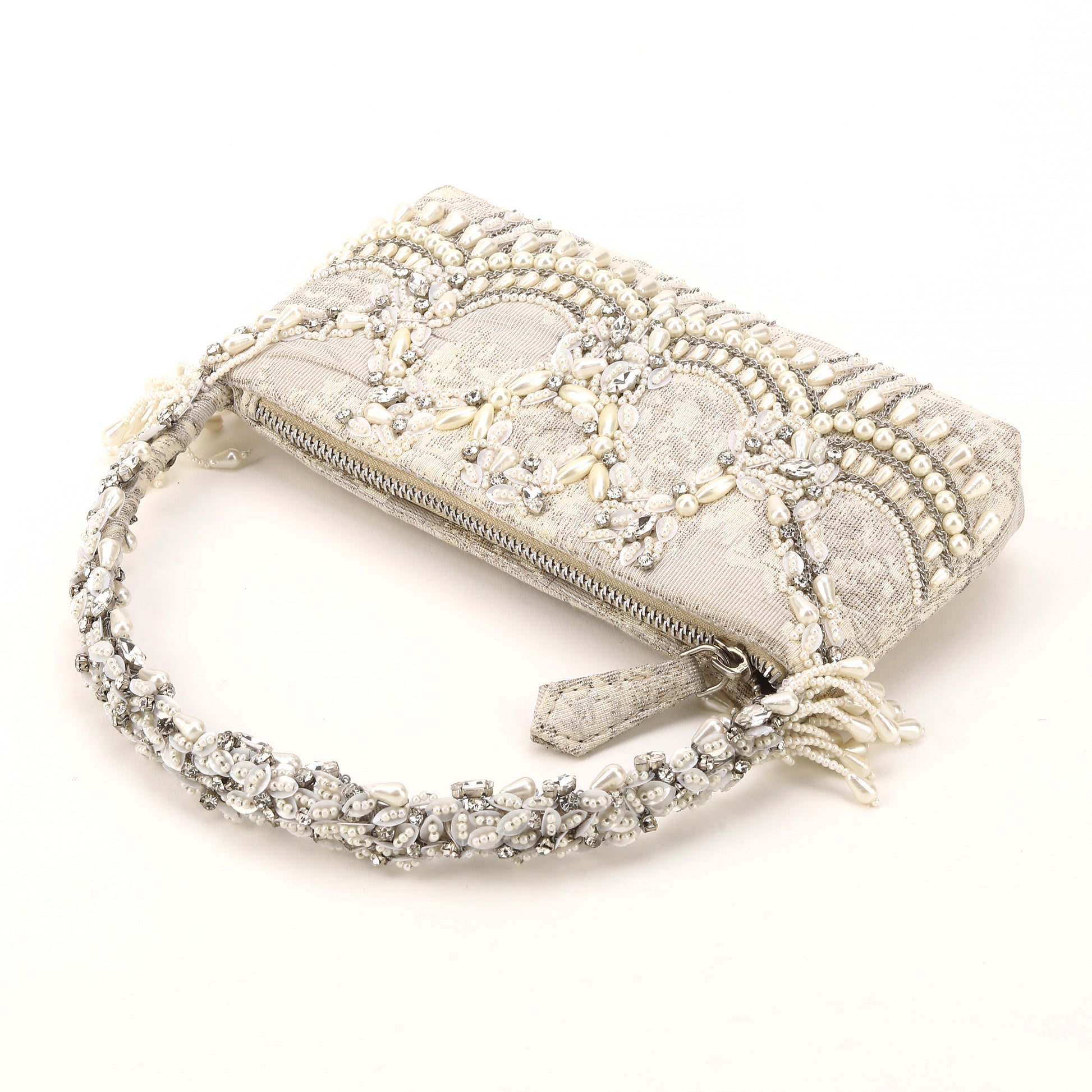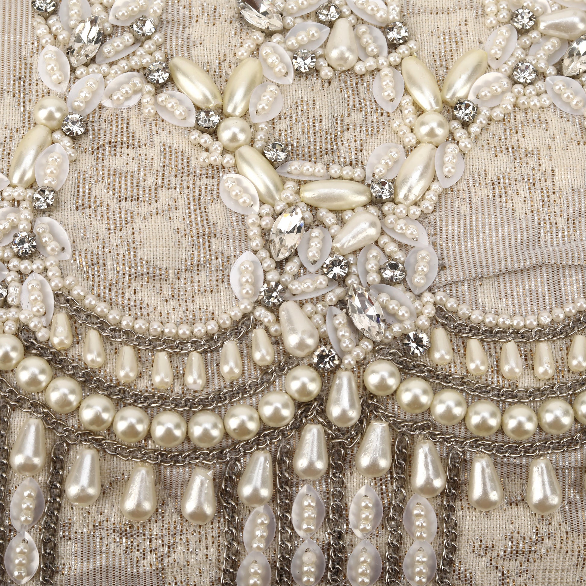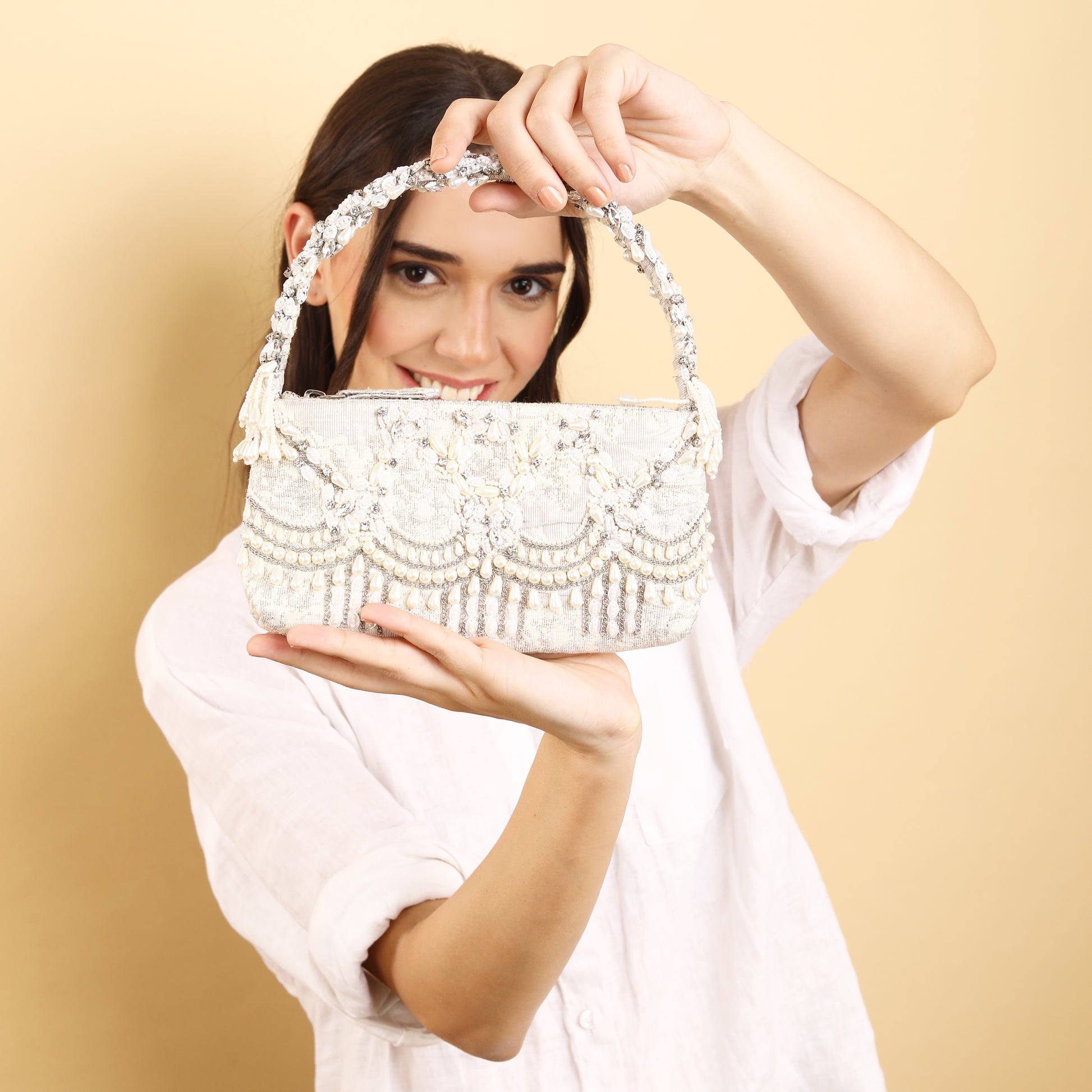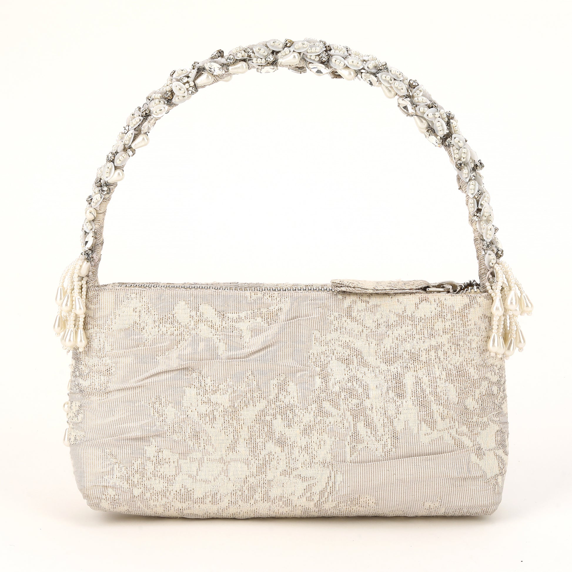 This exquisite bag is crafted from luxurious silk jacquard, perfect for wedding parties and special occasions. The front is adorned with intricate embellishments, including pearls, crystals, and sequins, and pearl tassel detailing on the side a dazzling display of elegance. The handle is a work of art itself, hand-beaded with crystals, pearls, and sequins and zipper closure adding a touch of opulence to the overall design. This bag is not just an accessory but a statement piece, embodying sophistication and glamour.