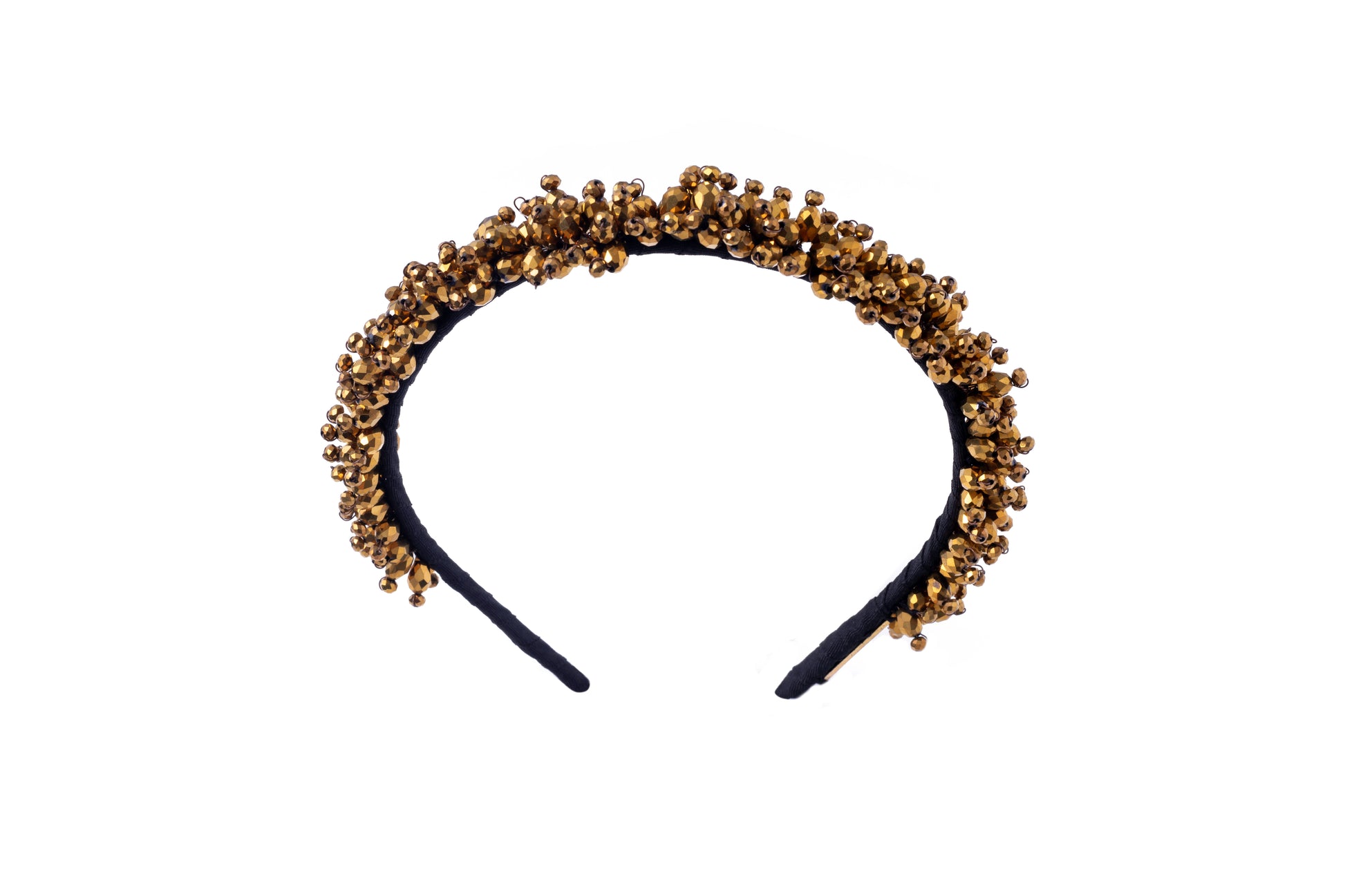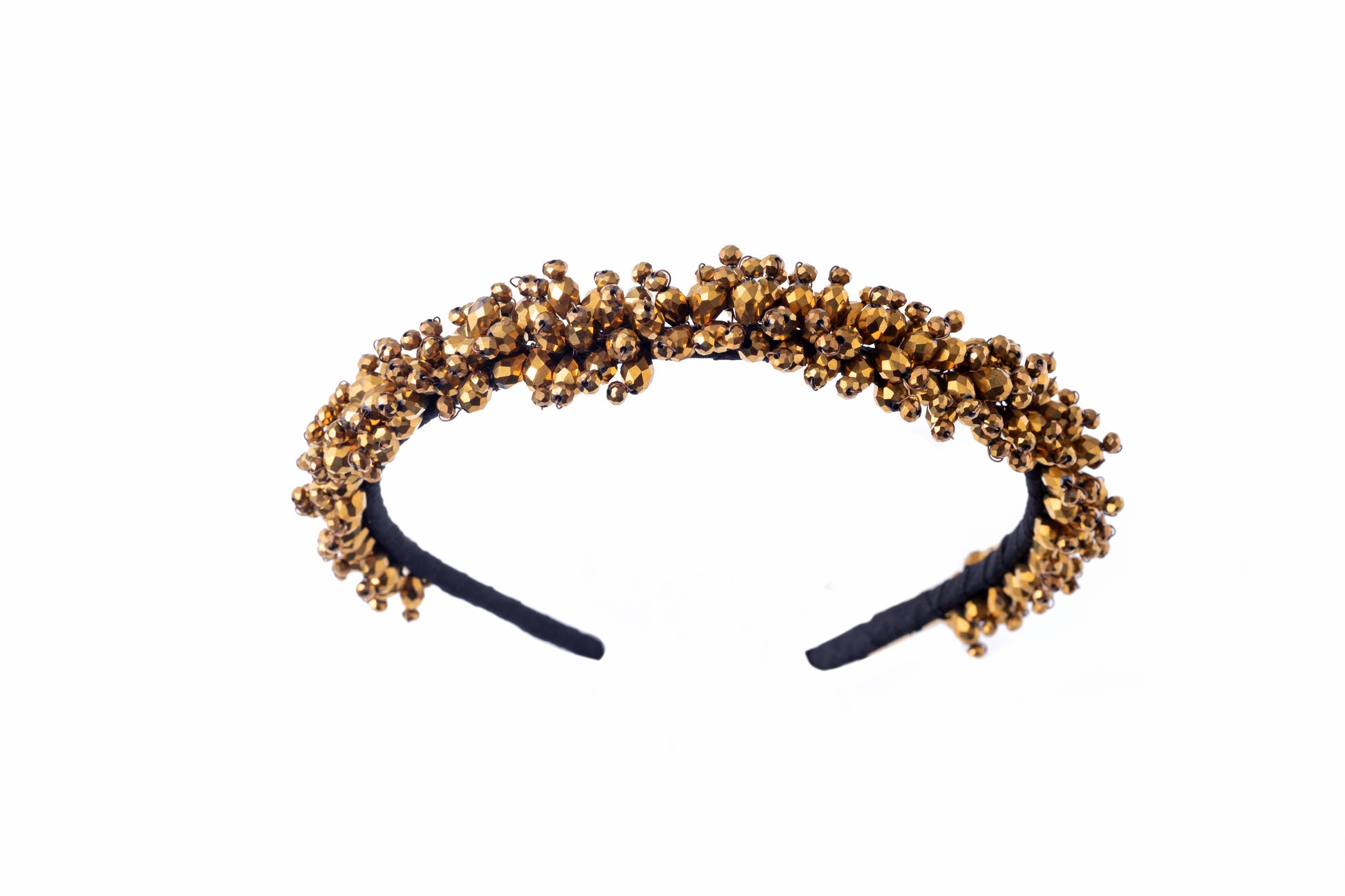 Gold opaque metallic bronze crystal beads woven together to make this stunning headgear.