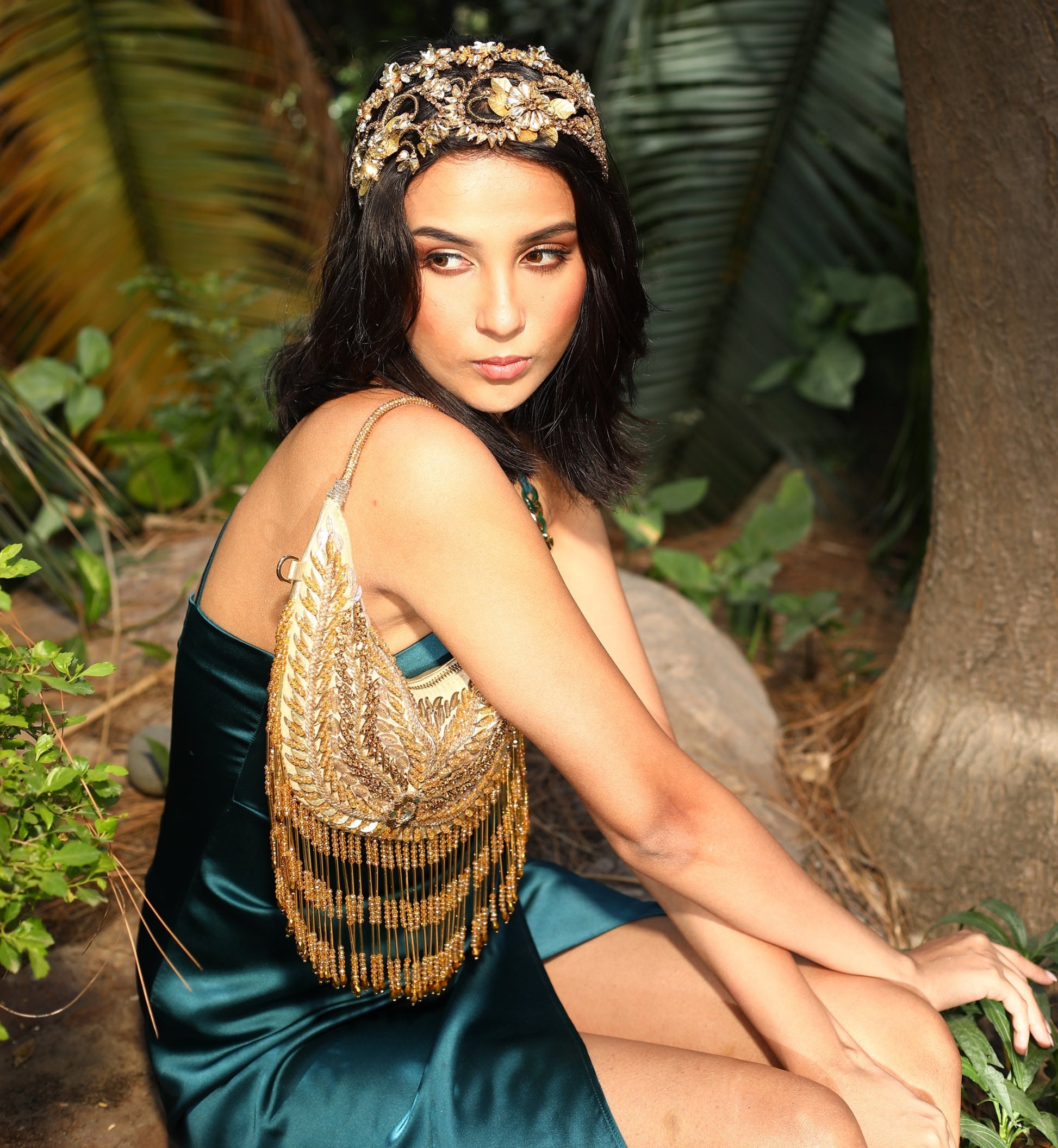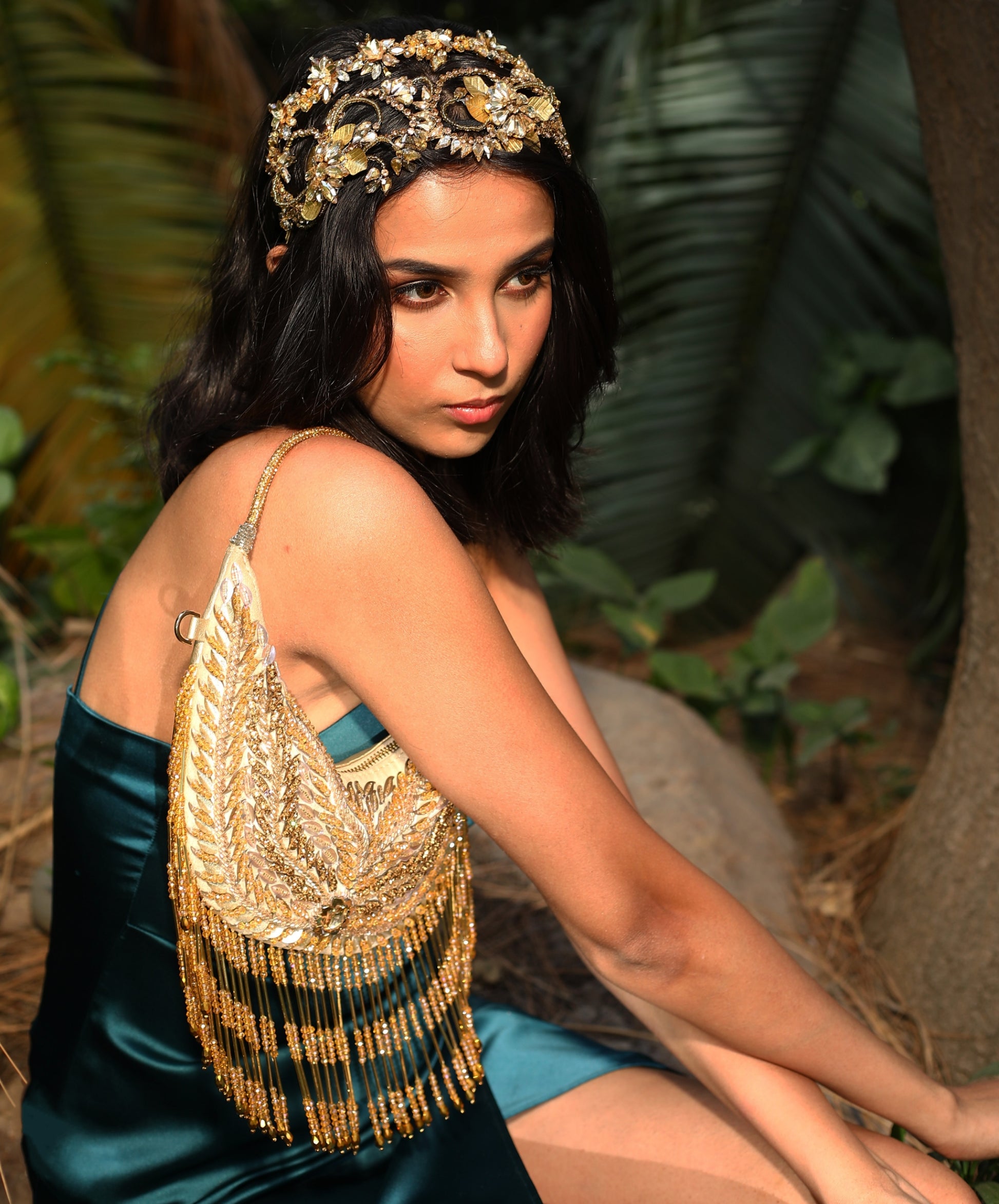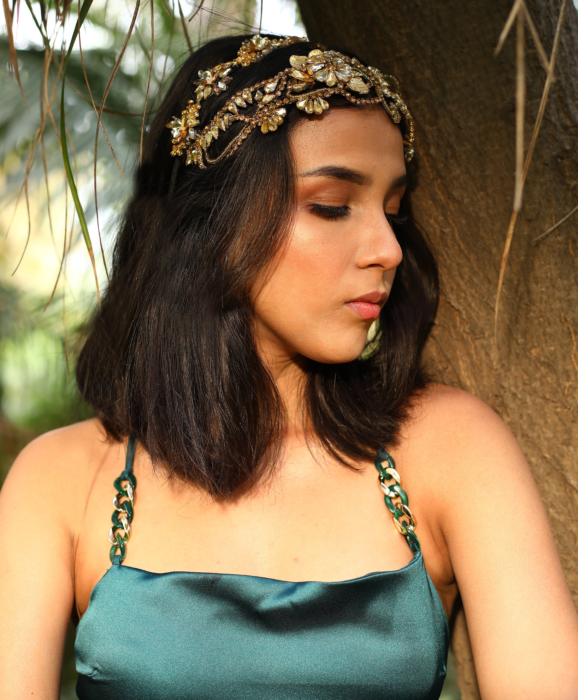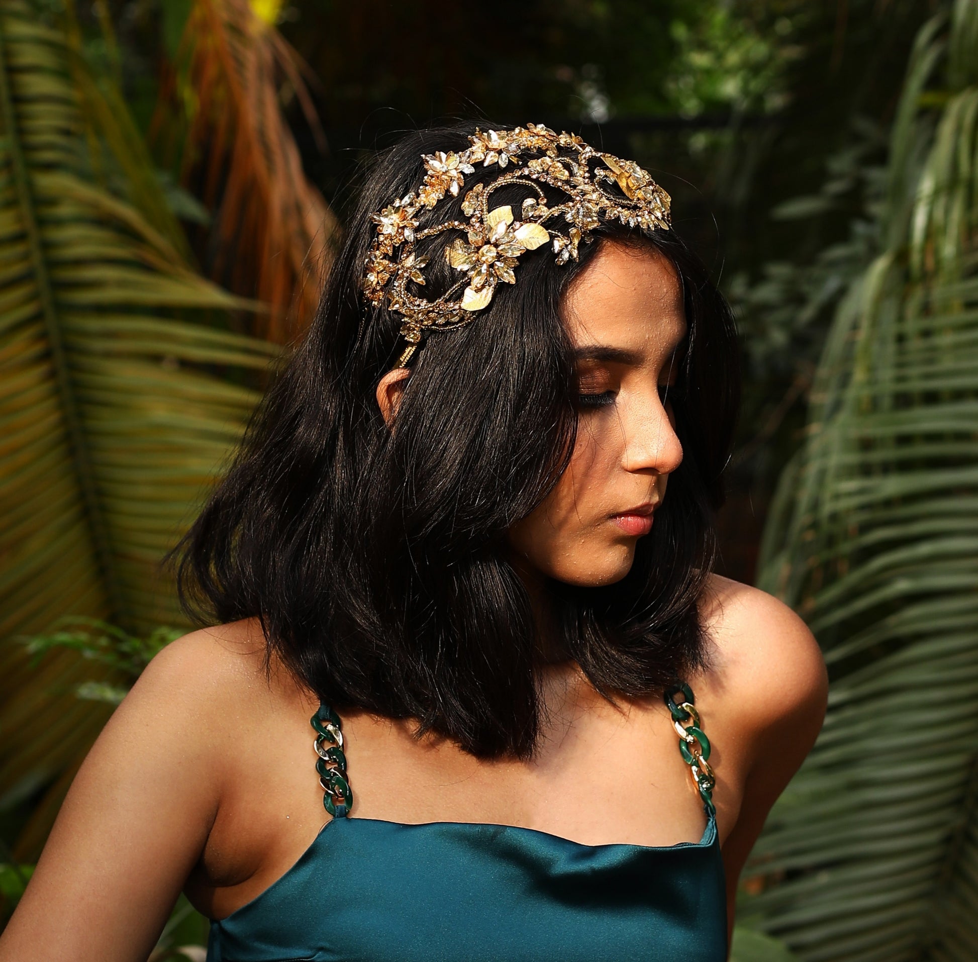Introducing the Monarch from the Queen Collection, a magnificent and awe-inspiring headpiece like no other. Crafted from delicate metal leaves, sparkling crystals, and exquisite beads, it provides a truly ethereal and romantic touch to any outfit. The lustrous bronze-gold finish on this headgear exudes character and sophistication, making it the perfect piece for those who love to make a statement with their style. Its captivating beauty will leave anyone spellbound and overwhelmed, making it the ultimate symbol of power and elegance. So, be ready to shine like a queen and add this stunning Monarch headpiece to your collection today!