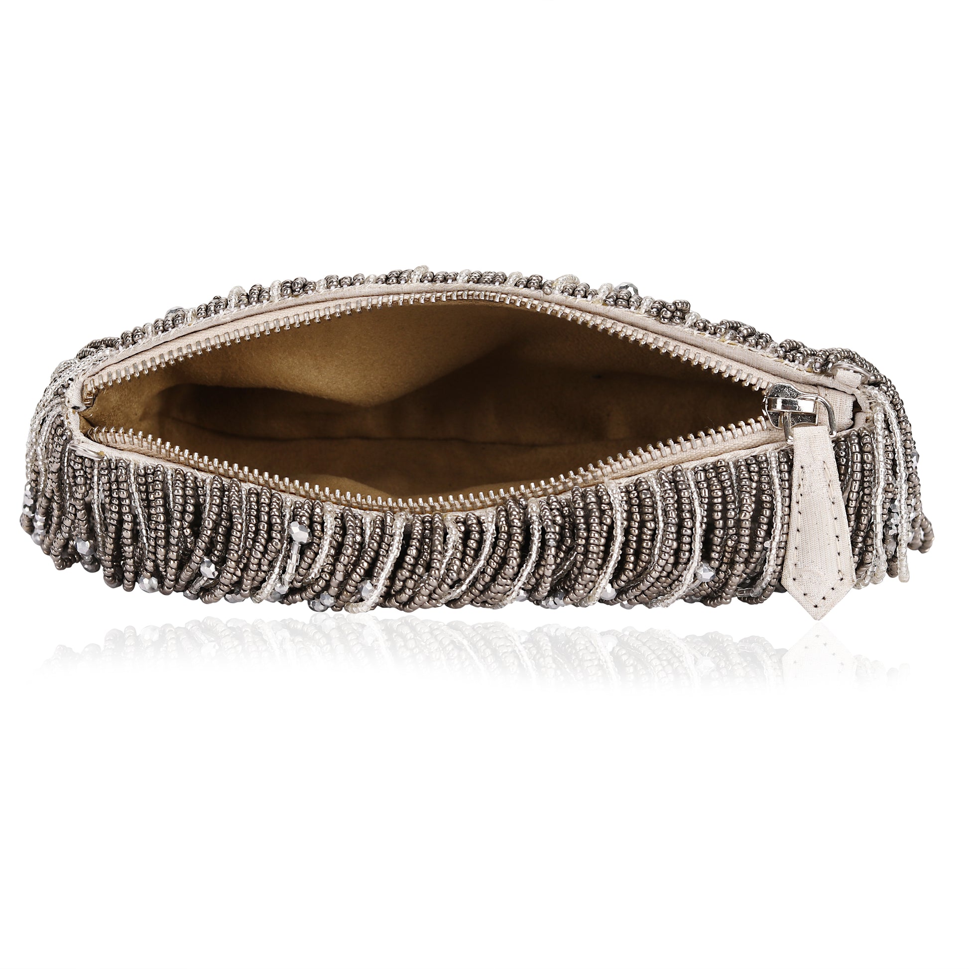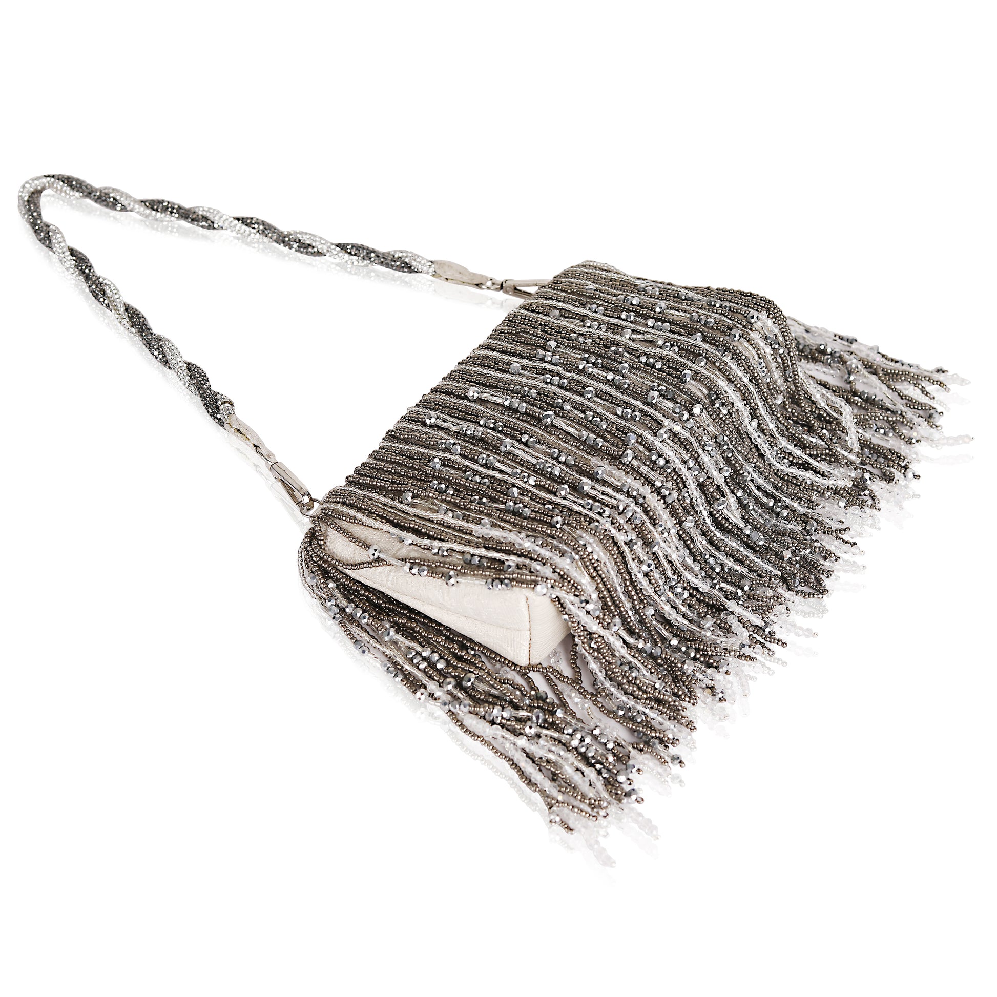 Turn heads at your next event with Moonlit Fringe, a vintage-inspired evening clutch purse featuring intricate metallic beaded fringe in shimmering silver and gunmetal gray. This luxurious rectangular clutch is designed with cascading rows of vertical bead tassels that create a mesmerizing movement and texture. Crafted with precision, each bead is connected by fine metallic threads, forming a radiant surface that beautifully catches and reflects light.