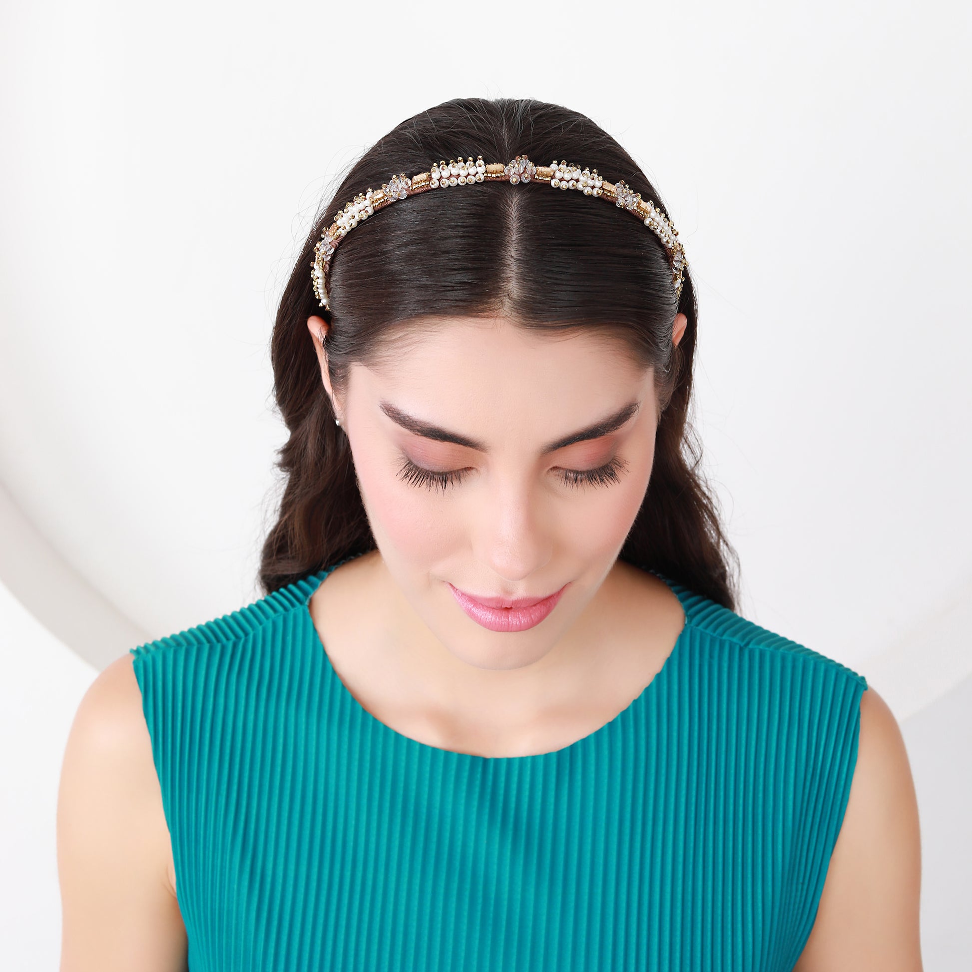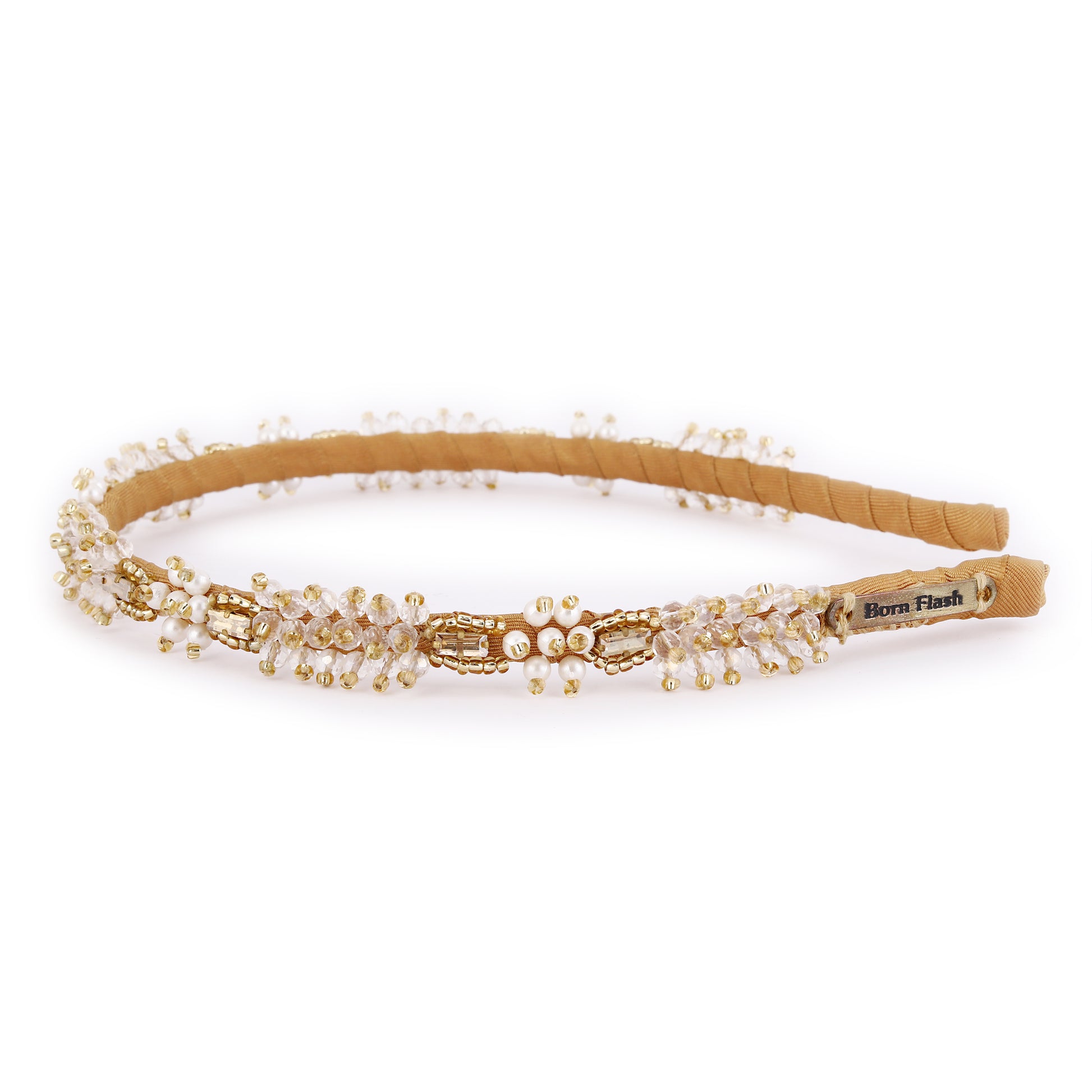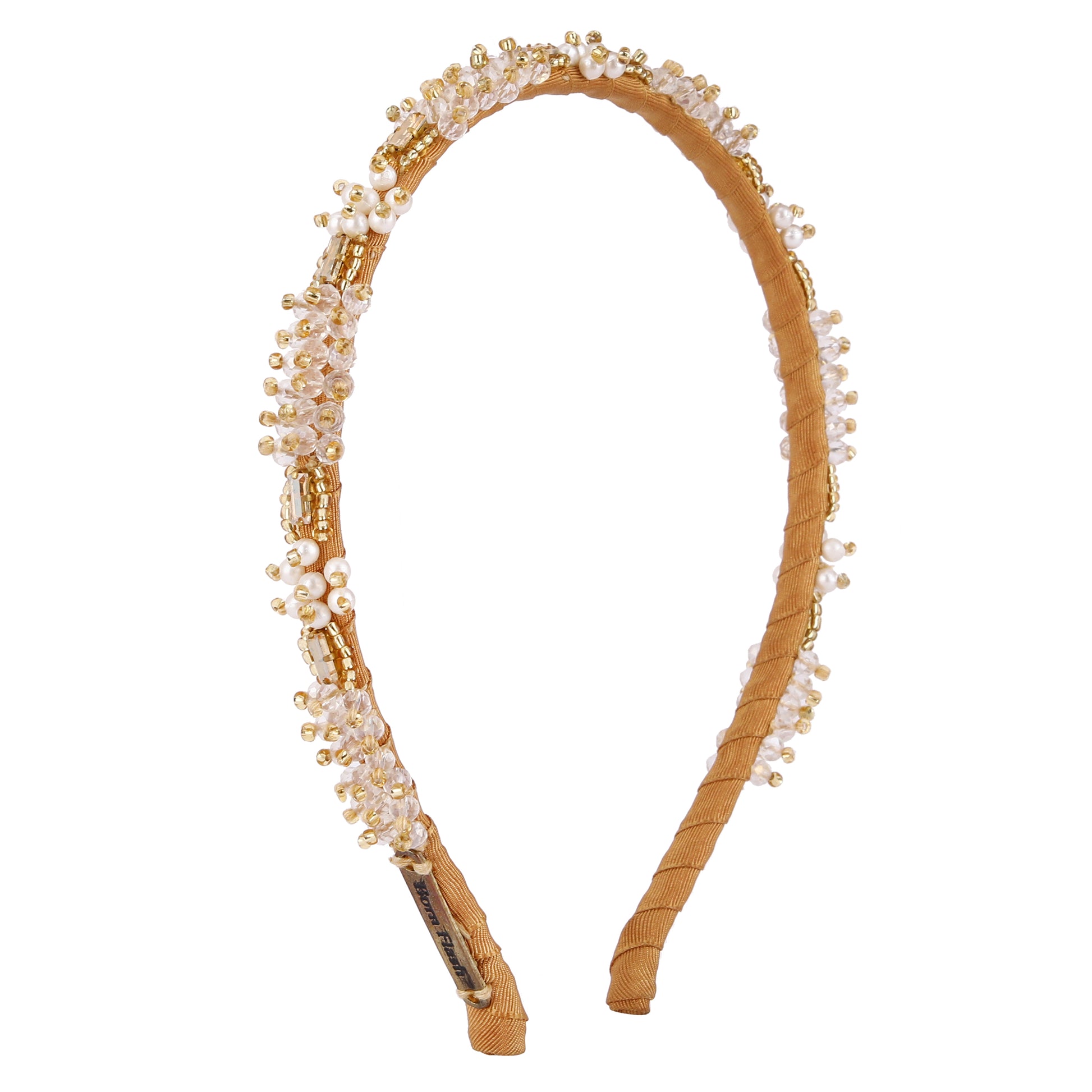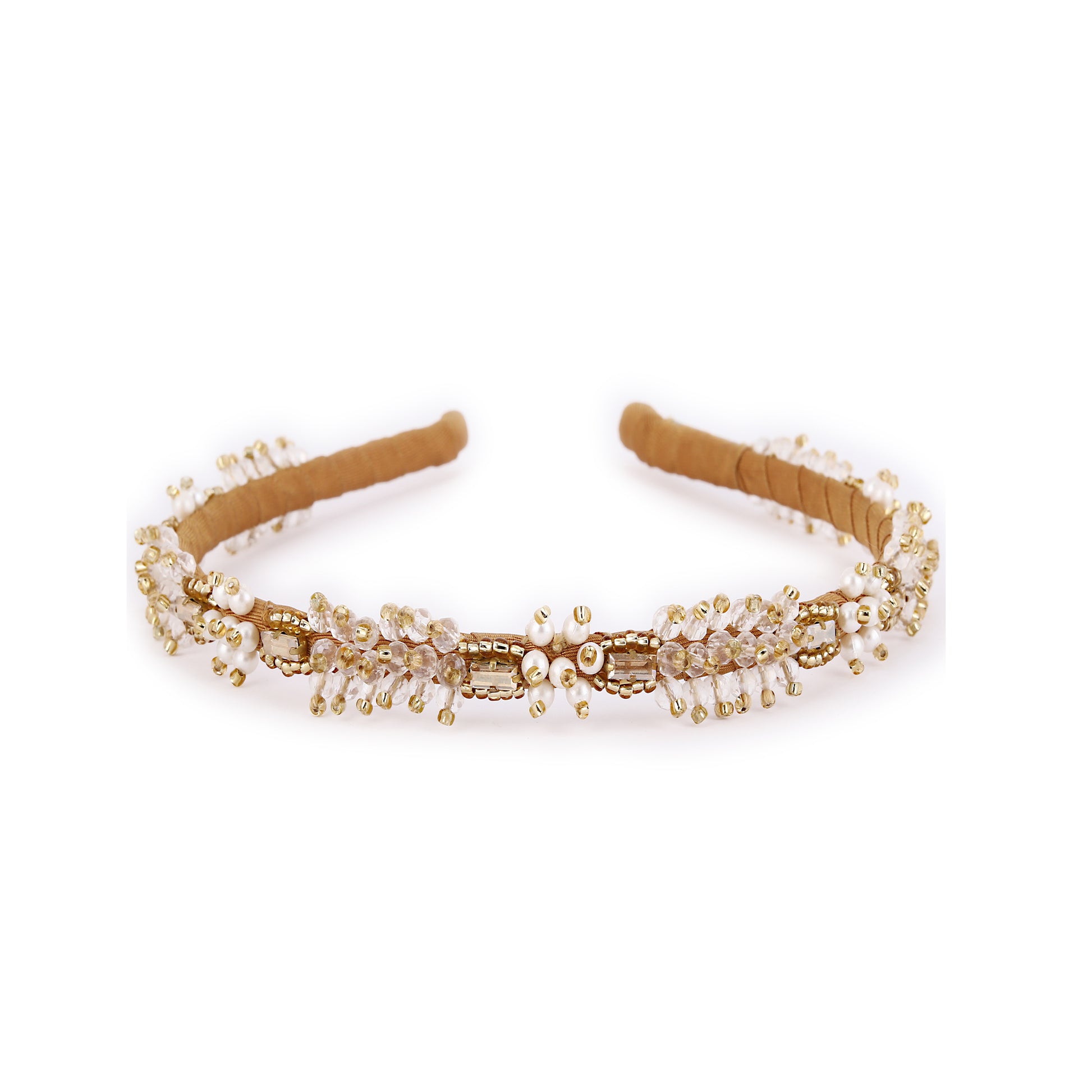 Add a touch of timeless elegance with the Pearl Bloom gold-toned crystal Hairband— a handcrafted piece that radiates femininity and grace. This delicate Hairband showcases a floral-inspired design, adorned with clusters of shimmering clear crystals and soft white pearl-like beads. The intricate gold-toned metalwork enhances the vintage charm, featuring ornate accents that frame each floral cluster with refined detail. Perfect for weddings, festive occasions, or everyday sophistication, this hairband complements both traditional and modern outfits. Lightweight and comfortable, it's a versatile accessory that brings a graceful sparkle. Ideal as a gift for bridesmaids, loved ones, or yourself.