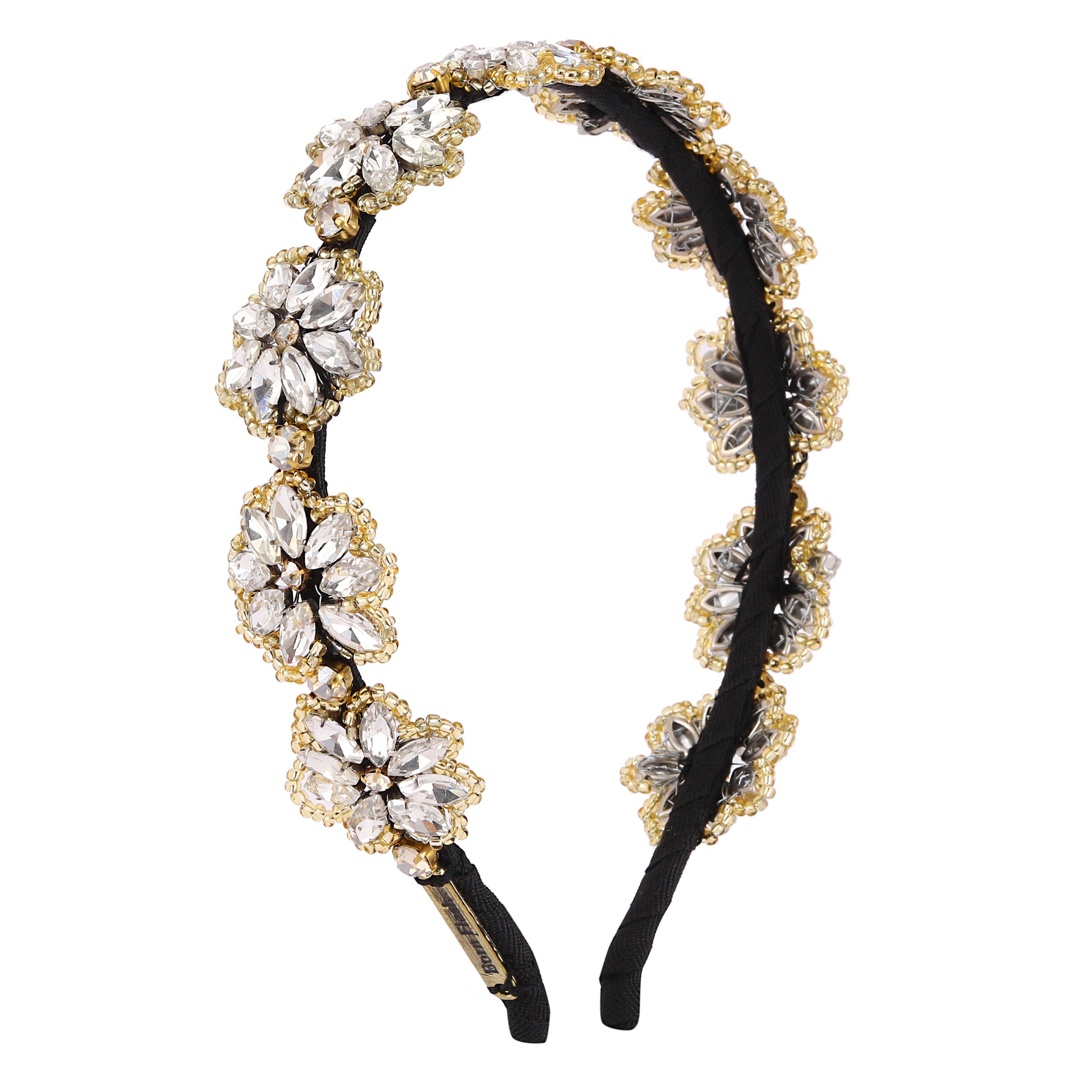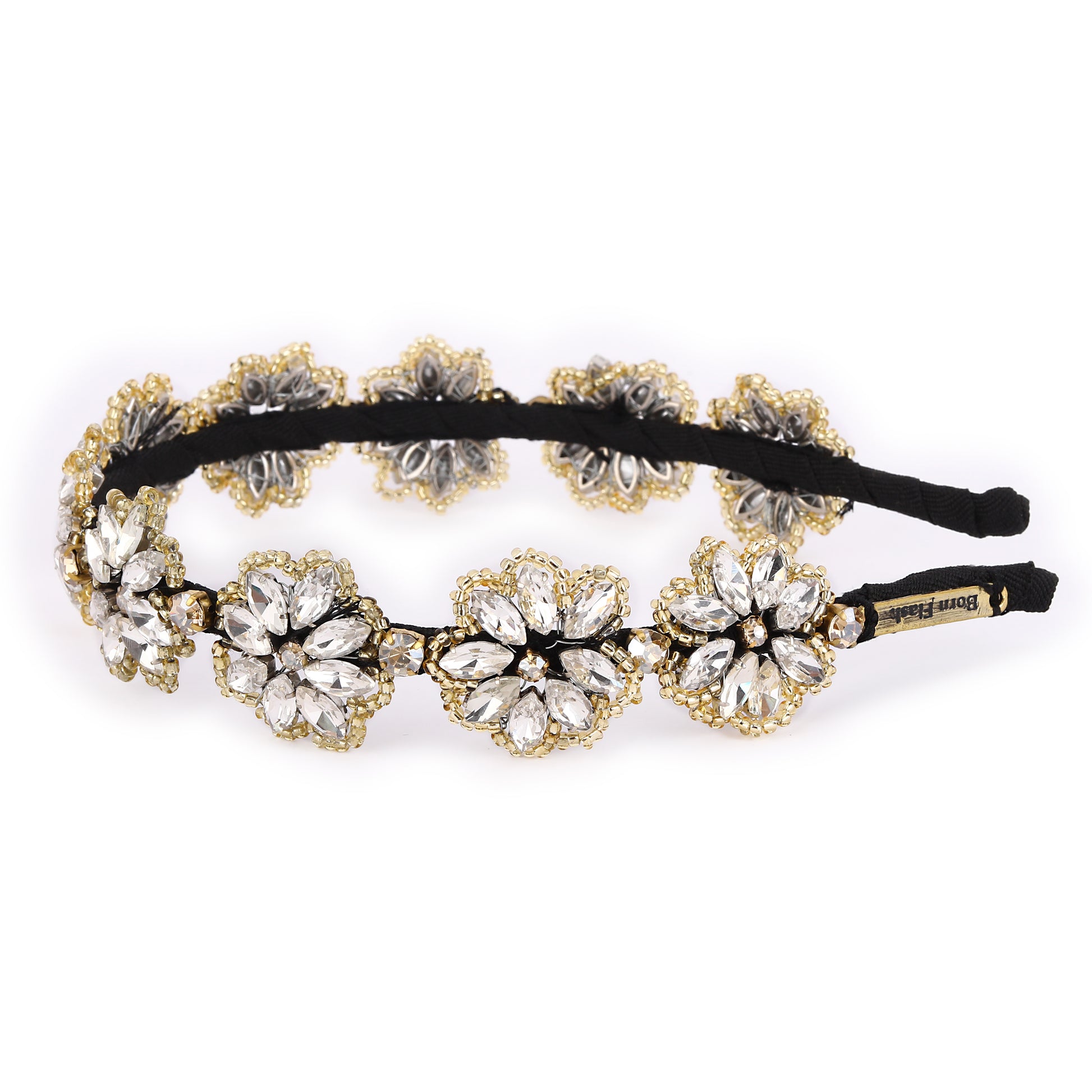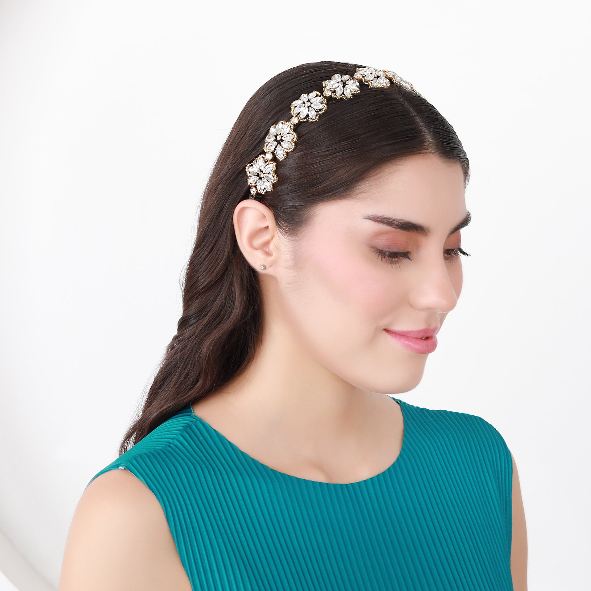 Elevate your style with this luxurious gold-toned crystal headband featuring a stunning floral design. Crafted with clear marquise-cut crystals set in gold-toned metal, each flower cluster shines with elegance and brilliance. The crystals are connected by delicate gold chains, forming a repeating motif that adds vintage charm and refined glamour. This headpiece is perfect for weddings, bridal wear, festivals, or formal occasions.