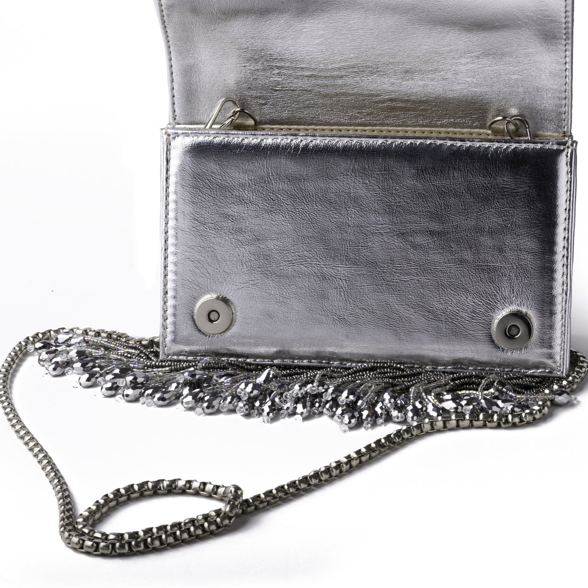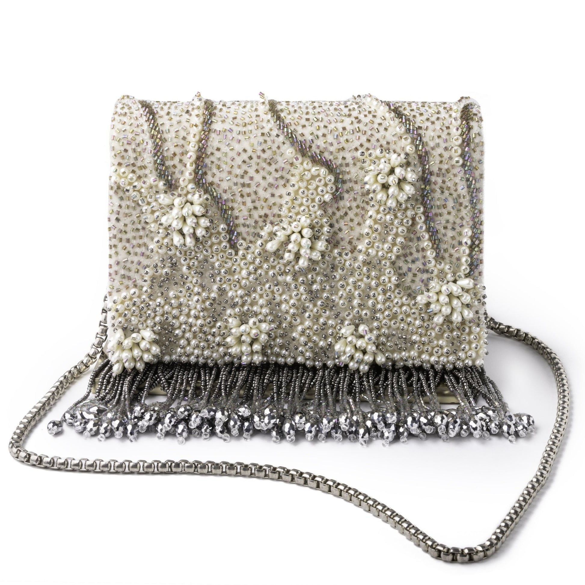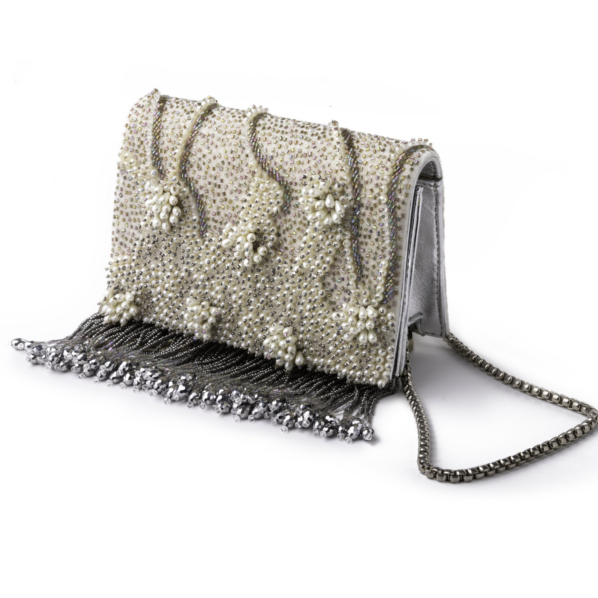 Featuring a Pearls embellished Tassels Leather Clutch bag with beads and chains Tassels.