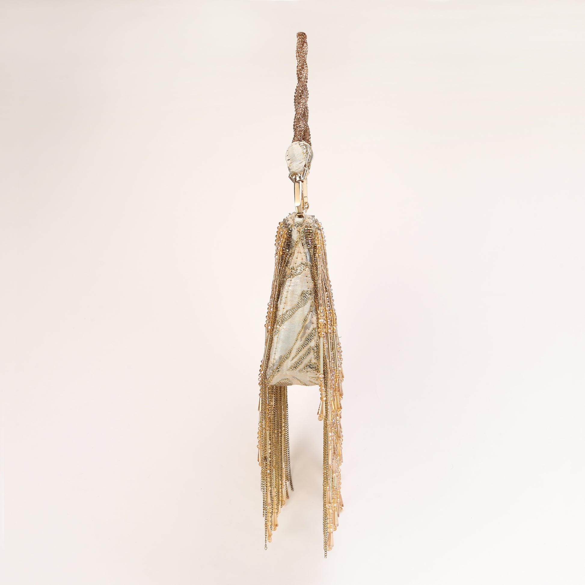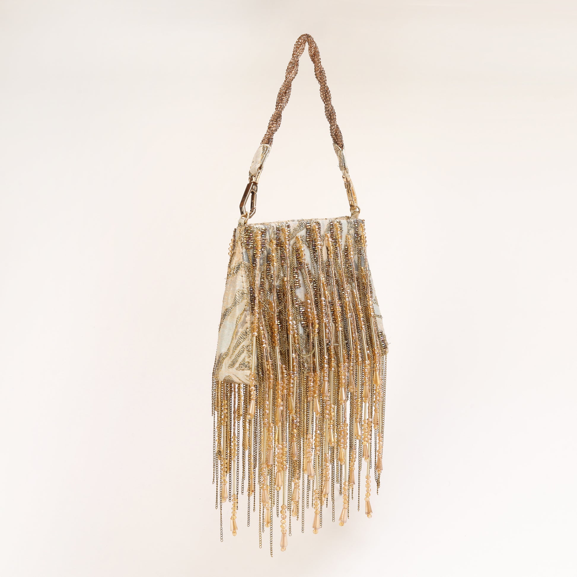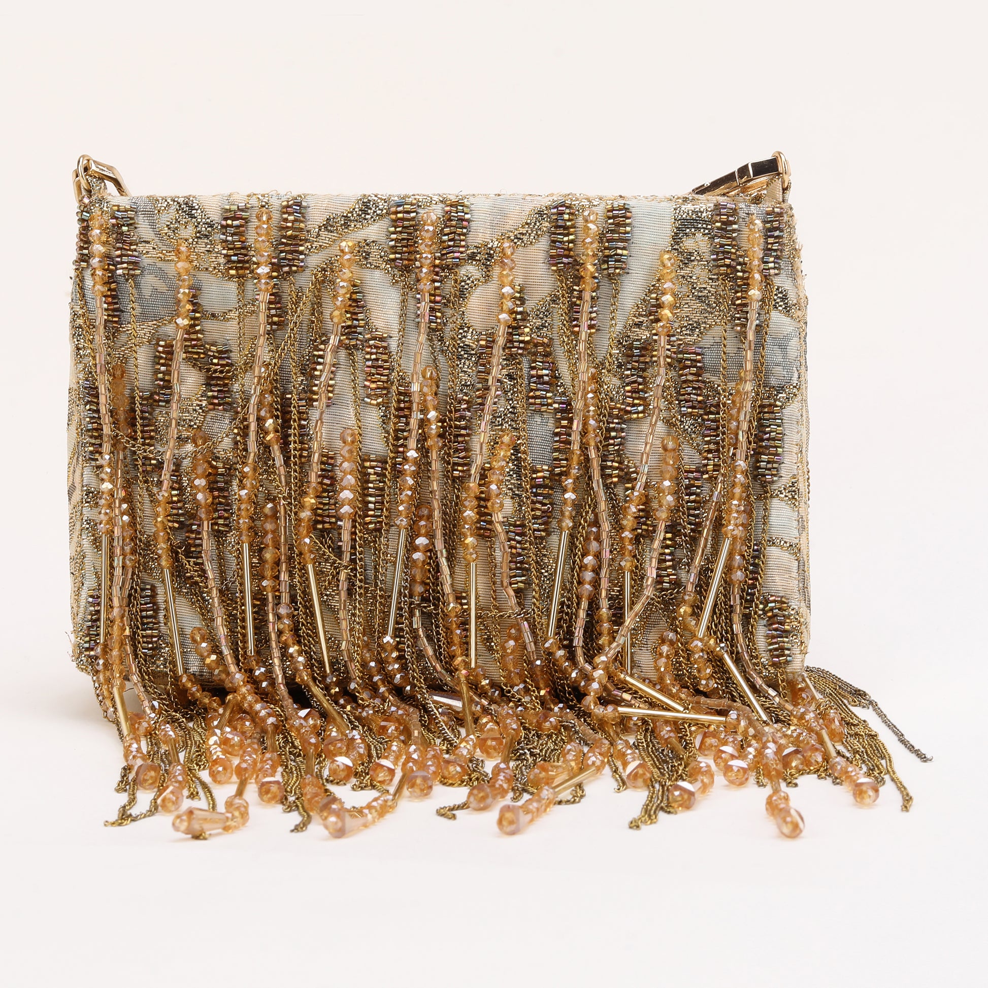 This exquisite hand-beaded Silk Jacquard gold Tassel bag with exudes elegance and sophistication. Adorned with delicate chains and hand beaded tassels, it adds a touch of glamour to any ensemble. this accessory is sure to turn heads and elevate the overall look. Crafted with attention to detail, it effortlessly combines timeless style with modern flair, making it a cherished keepsake for years to come.