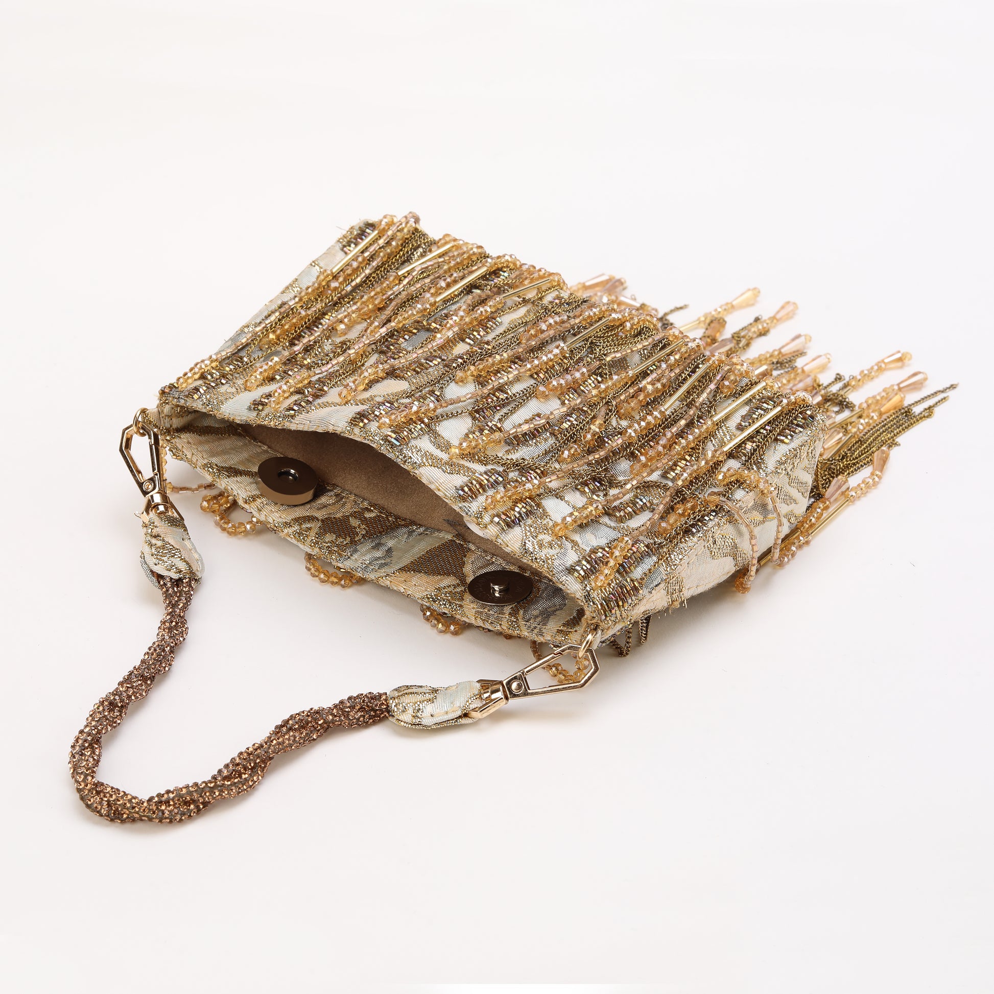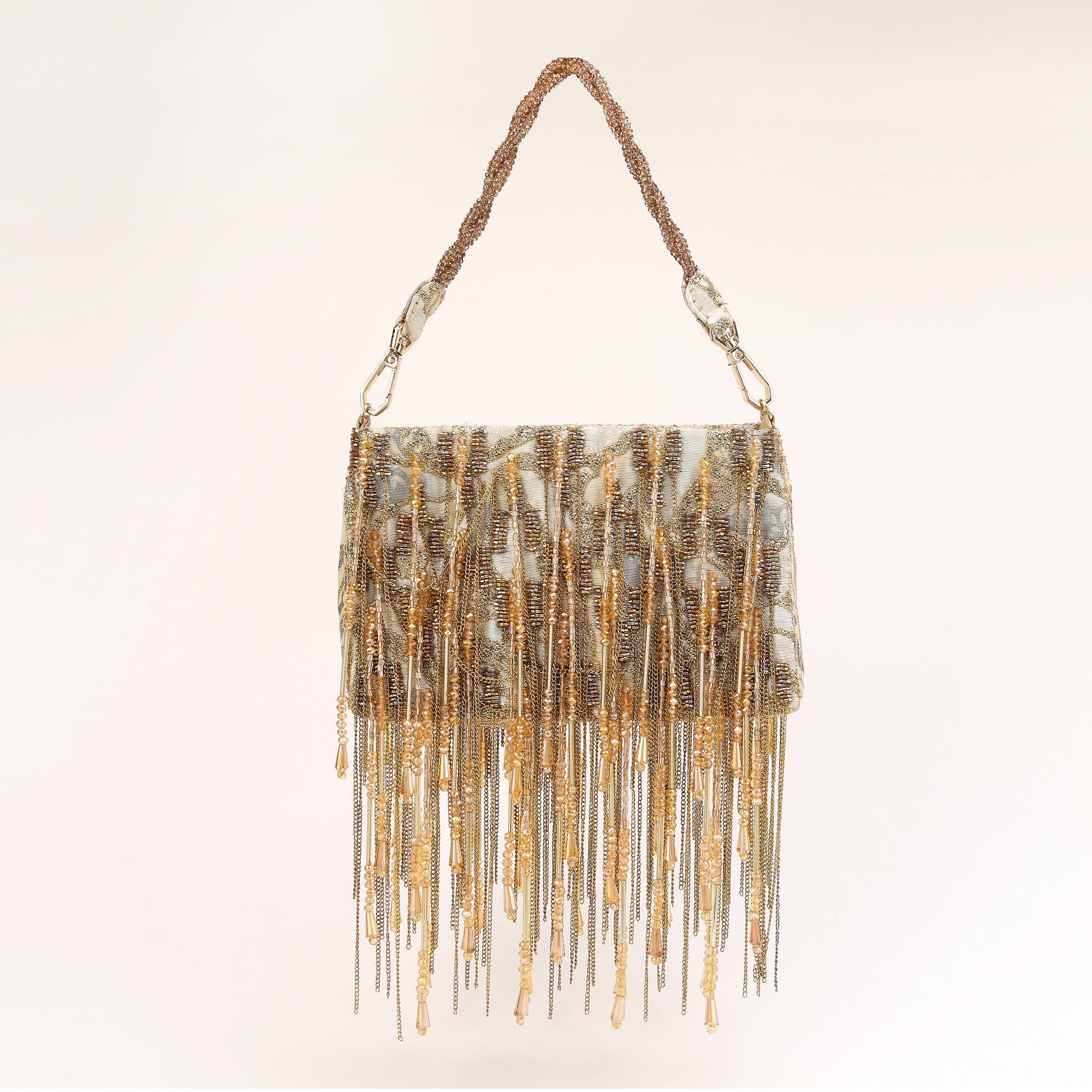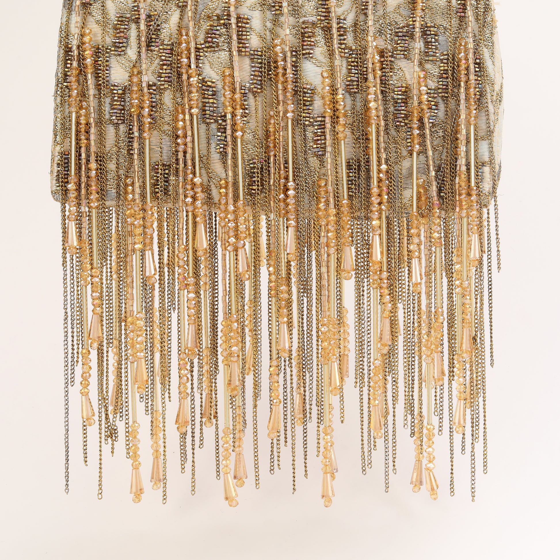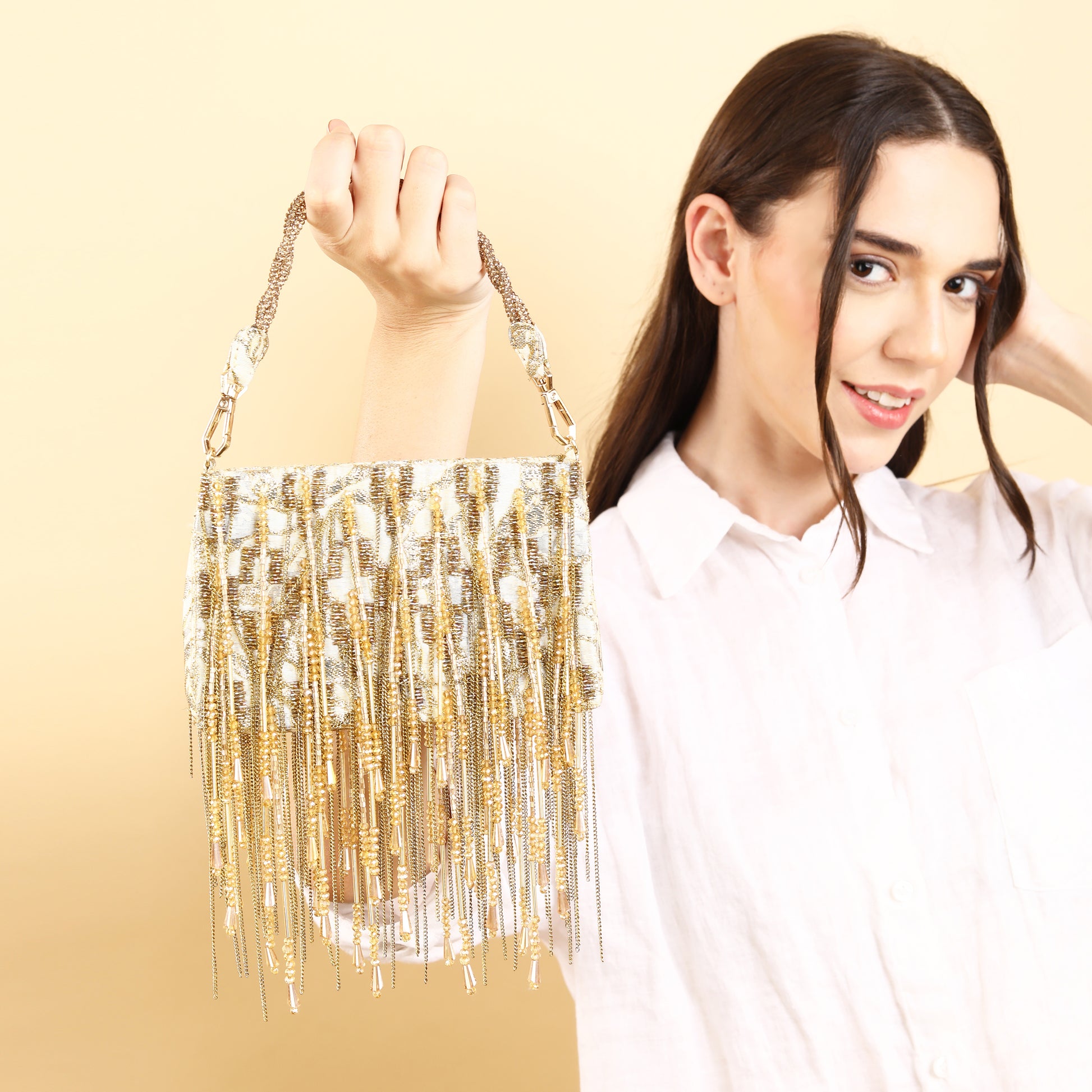 This exquisite hand-beaded Silk Jacquard gold Tassel bag with exudes elegance and sophistication. Adorned with delicate chains and hand beaded tassels, it adds a touch of glamour to any ensemble. this accessory is sure to turn heads and elevate the overall look. Crafted with attention to detail, it effortlessly combines timeless style with modern flair, making it a cherished keepsake for years to come.