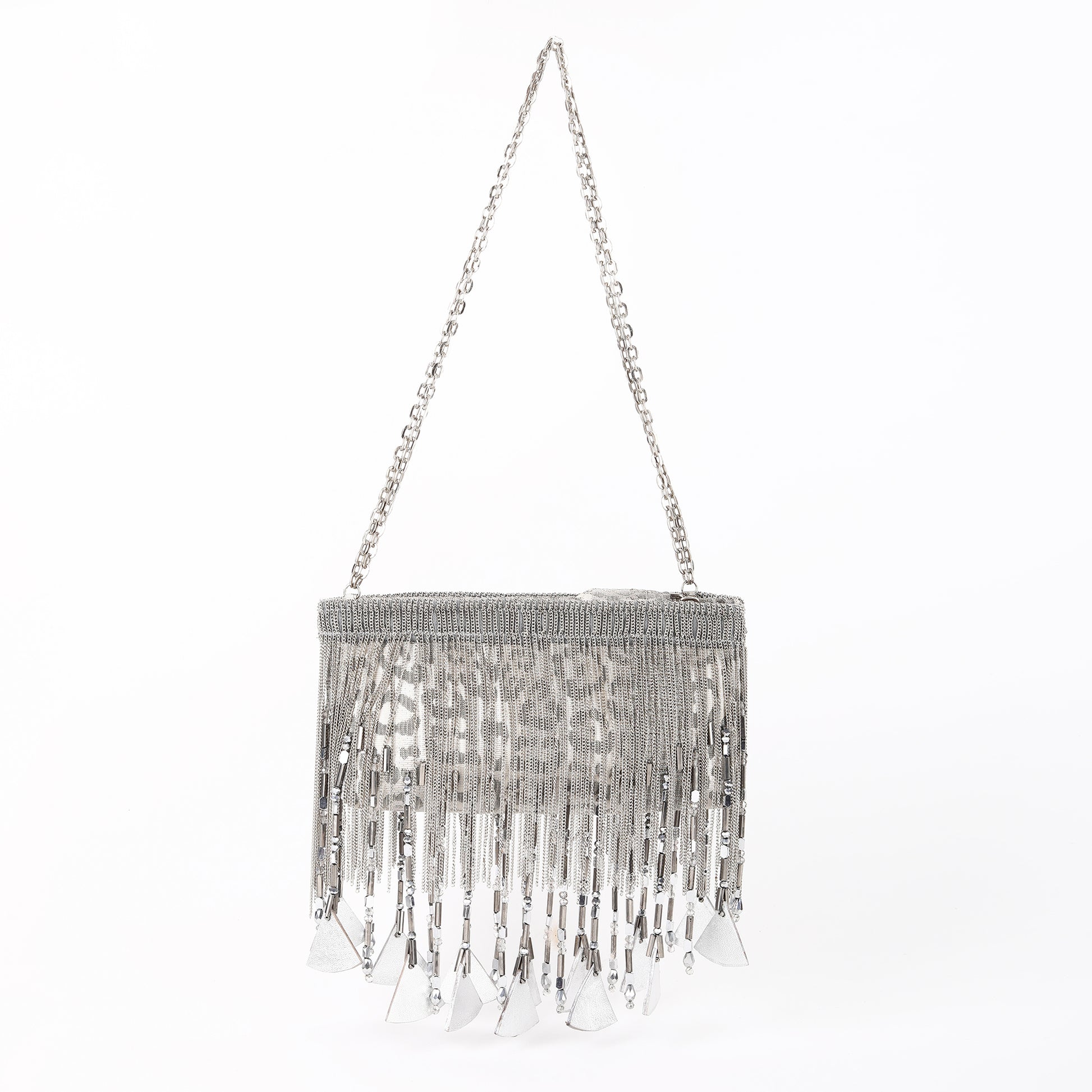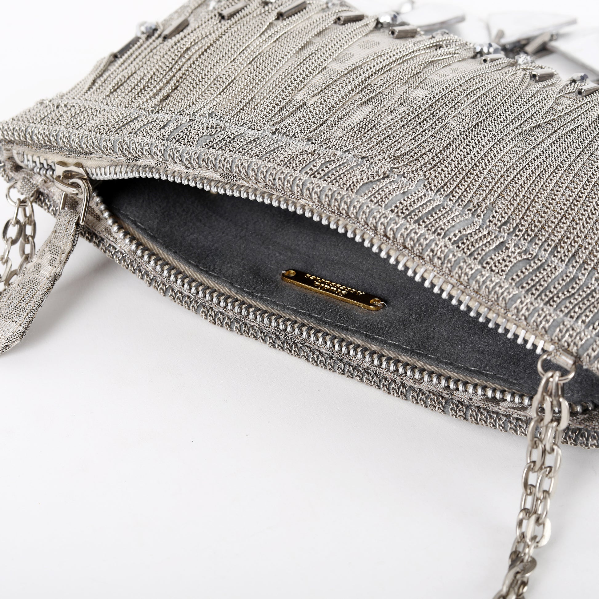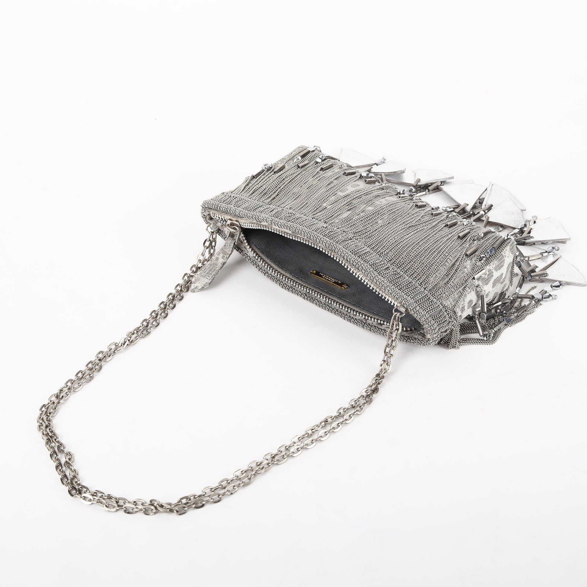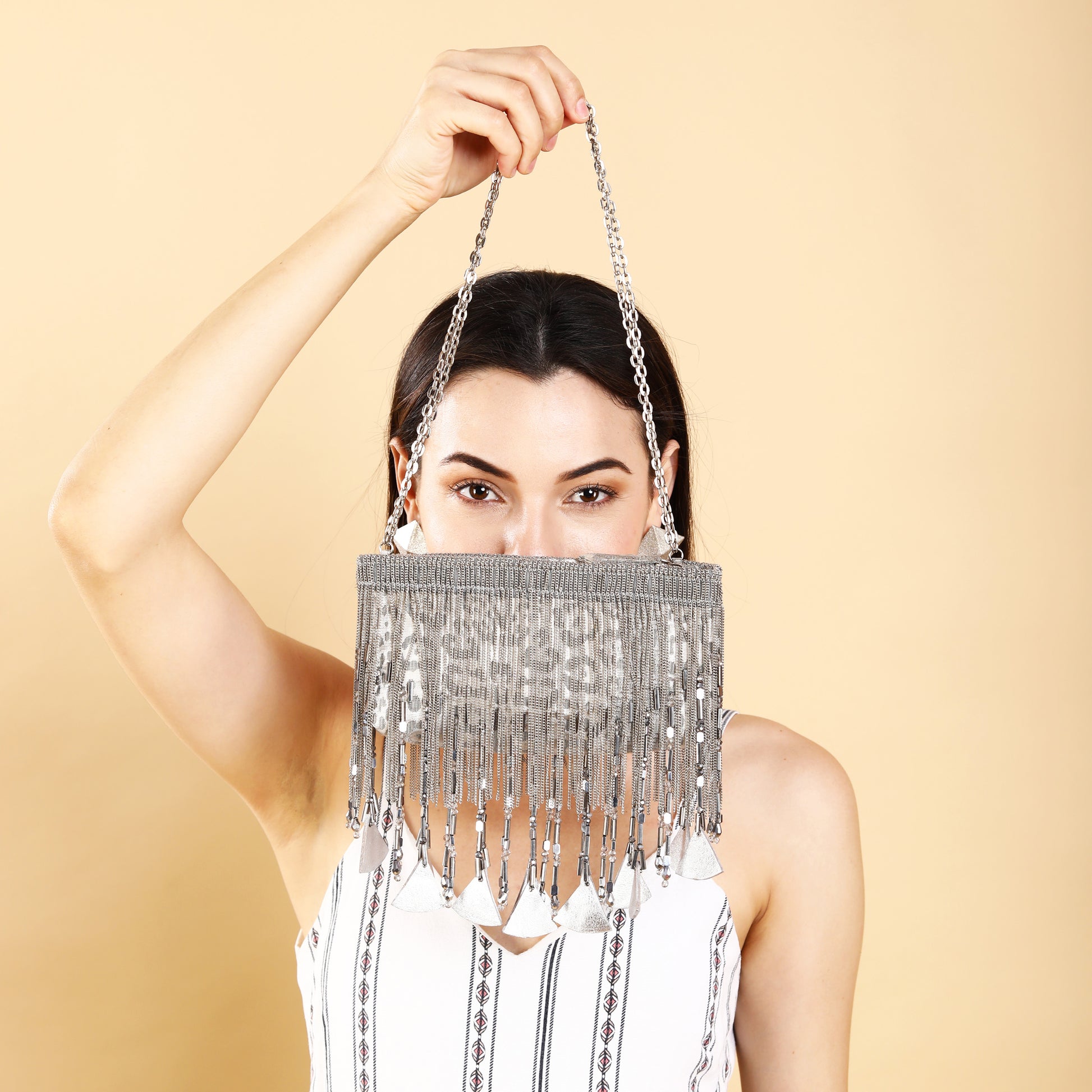 This exquisite hand-beaded Silk Jacquard Silver Leather Tassel bag with exudes elegance and sophistication. Adorned with delicate chains and intricate tassels, it adds a touch of glamour to any ensemble. this accessory is sure to turn heads and elevate the overall look. Crafted with attention to detail, it effortlessly combines timeless style with modern flair, making it a cherished keepsake for years to come.