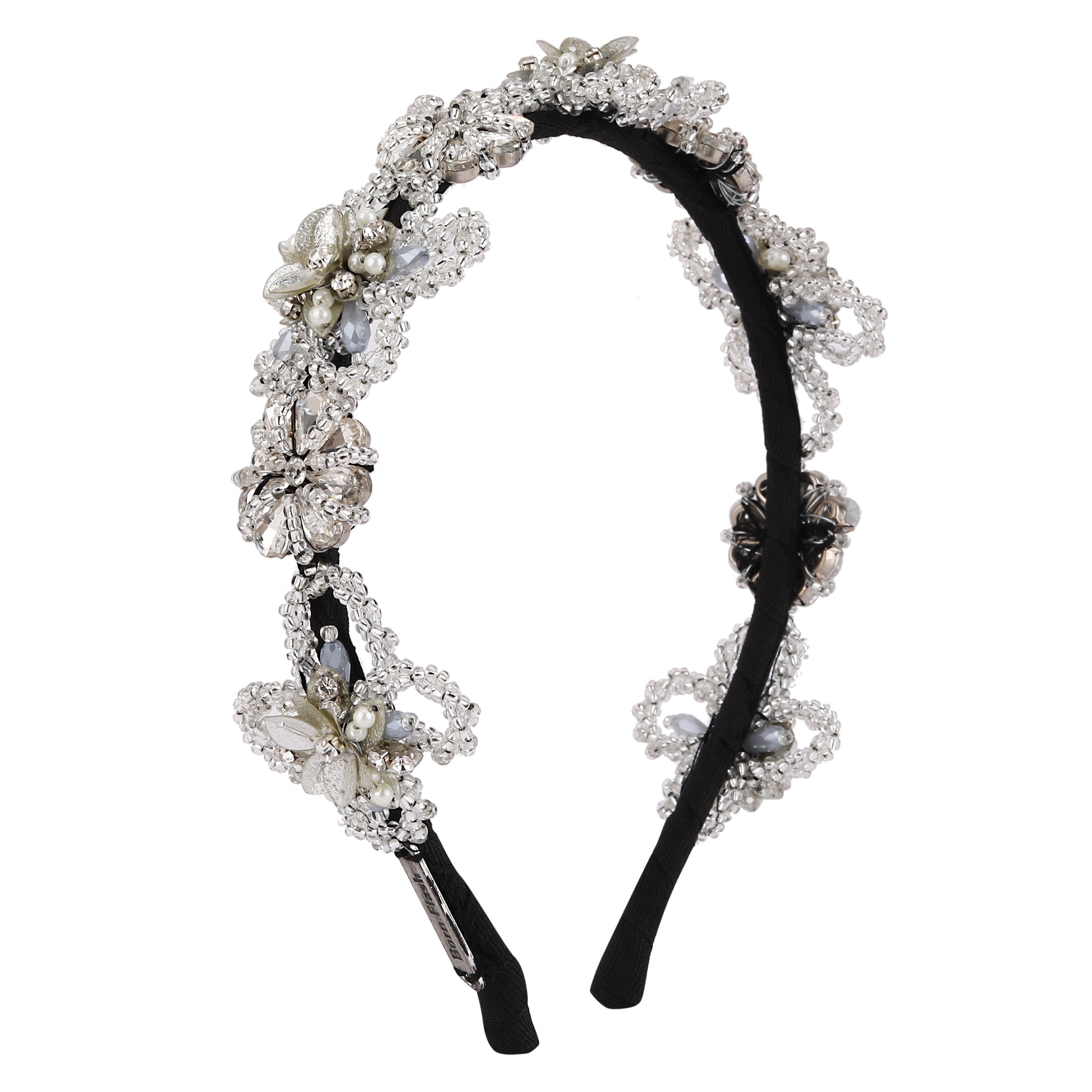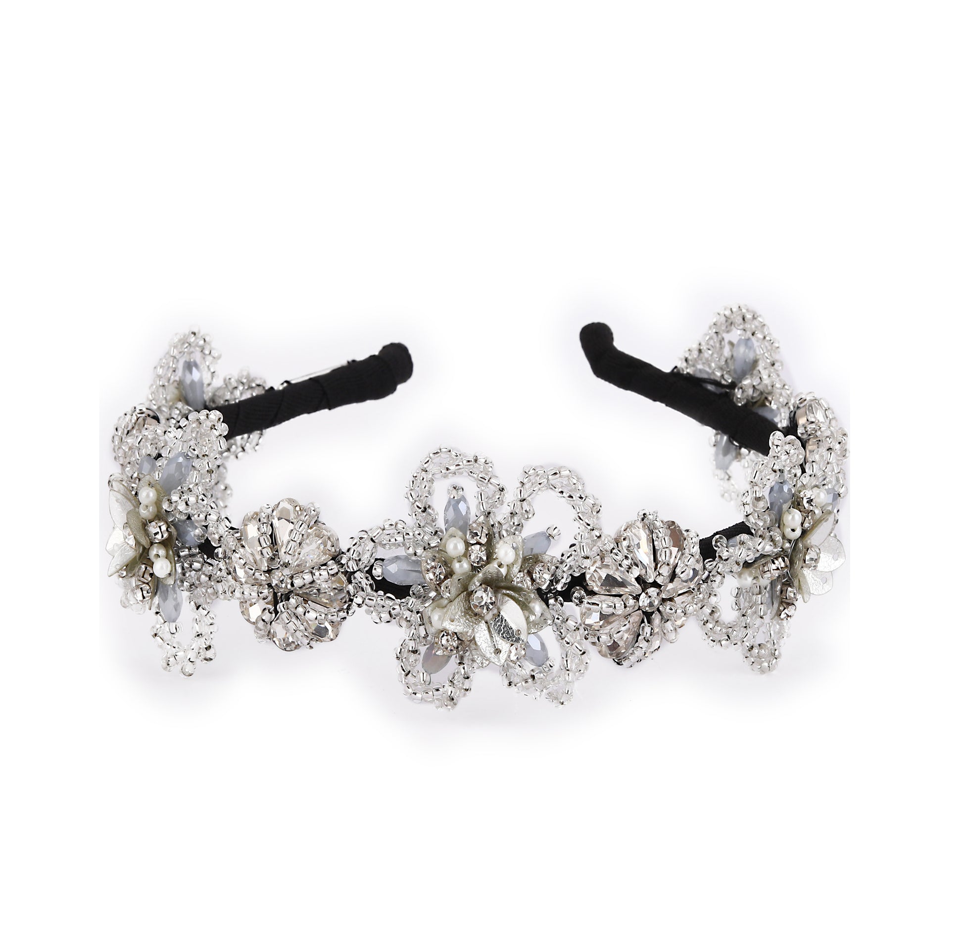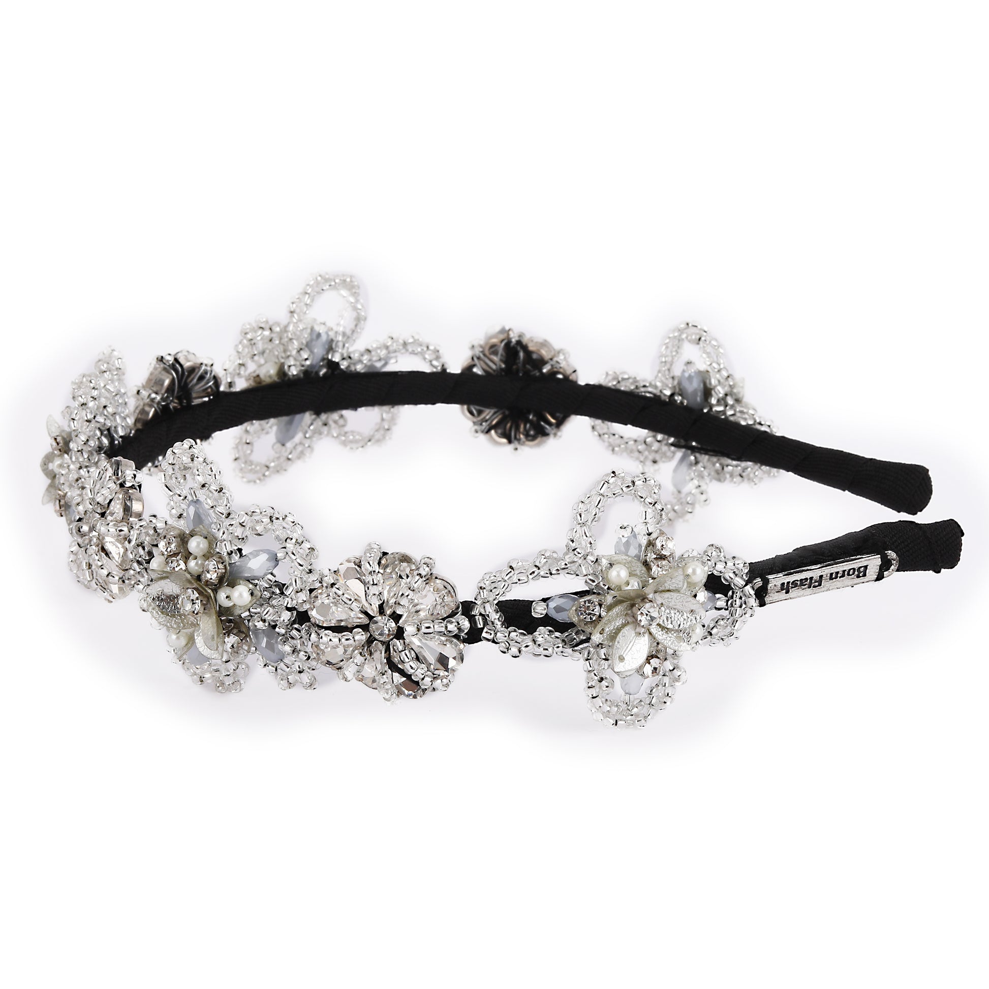Introducing the Silver Whimsy hair accessory — a dazzling statement piece designed to elevate any bridal or festive hairstyle. This handcrafted, filigree-style hairband features an intricate floral motif with delicately curved silver petals, swirling vine-like patterns, and layered dimensional elements. Embellished with shimmering clear crystals and soft blue gemstones, the design captures a perfect balance of elegance and sparkle. this ornate piece adds a touch of sophistication to updos, buns, or flowing hair. Ideal for weddings, receptions, sangeet nights, or evening events, this lightweight and secure accessory is a must-have for special occasions.