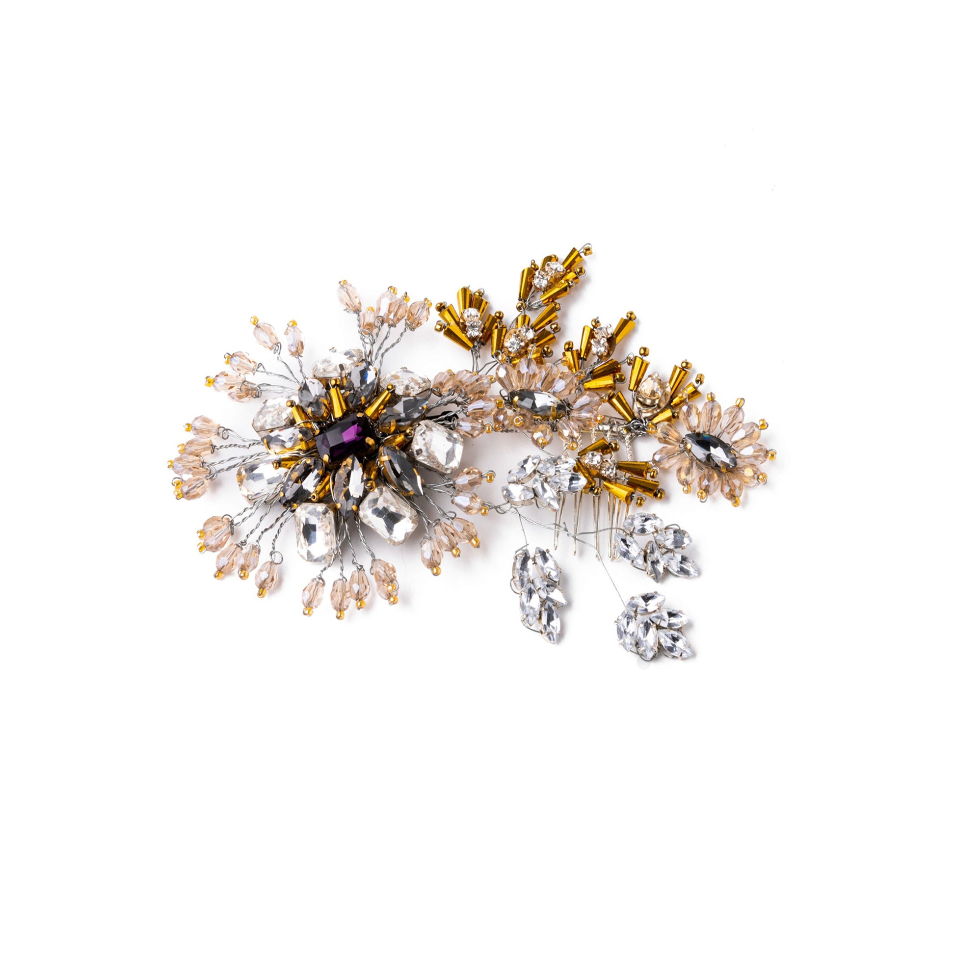 Gold and silver bead work around a purple crystal stone giving it a dash of colour to enhance your party look..