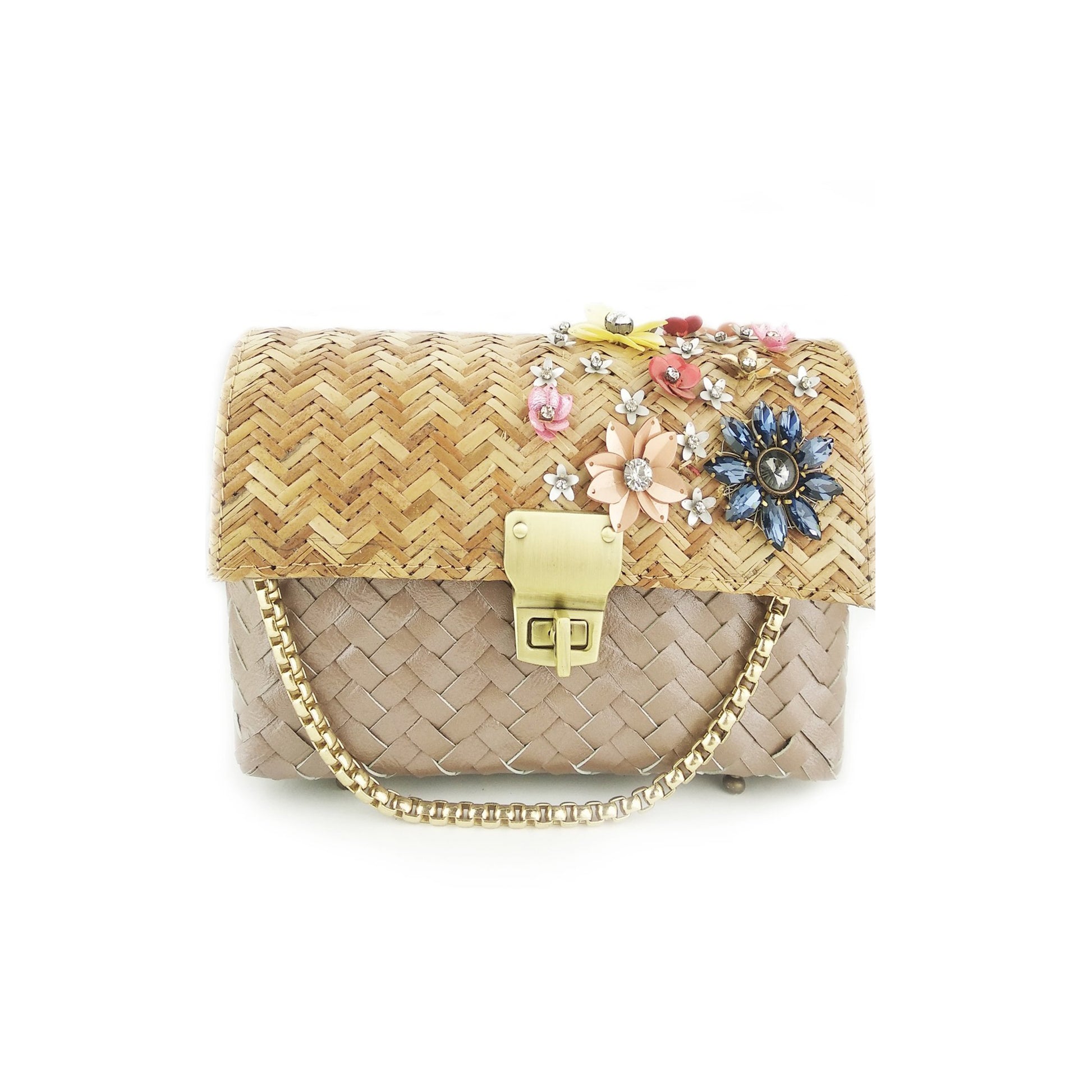 Featuring a Beige & Gold color cane bag embellished with crystals, sequins, beads, metal, leather and cane and multicolor floral design in front of the bag. It comes with a gold sling chain gives it a classy look.
