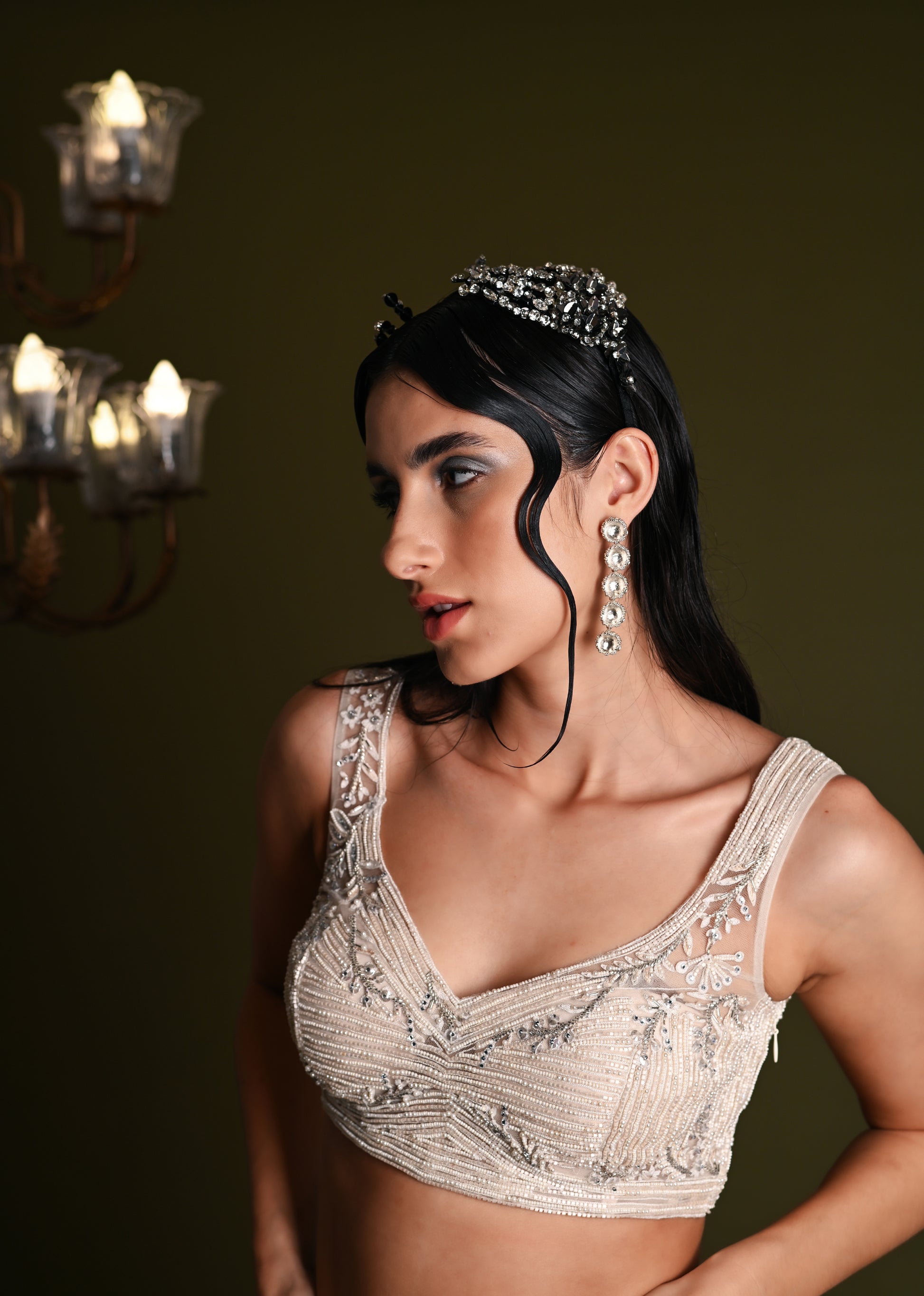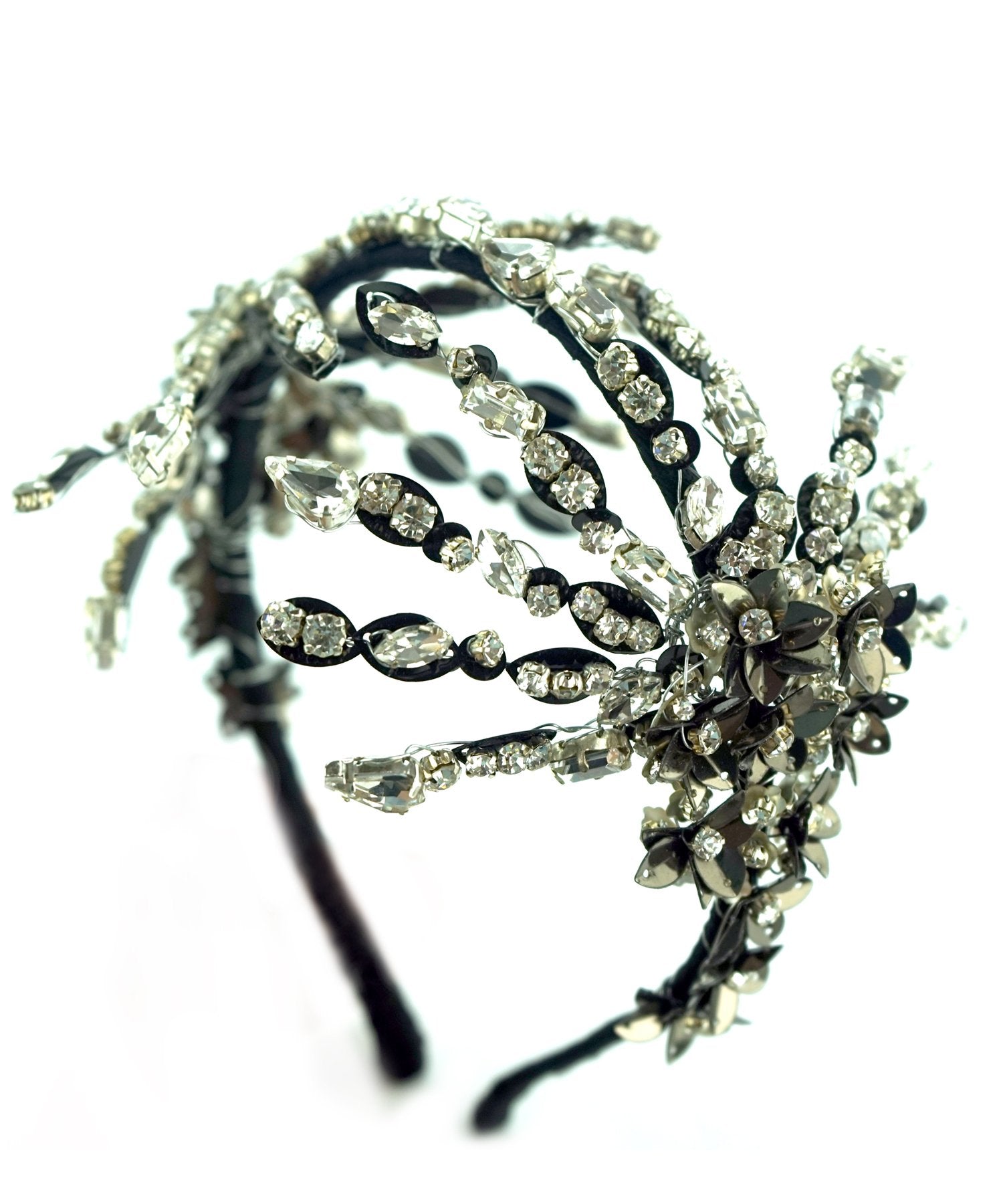 Featuring a woven hairband with Black and Silver Sequins and Crystal beads floral work embellishment..