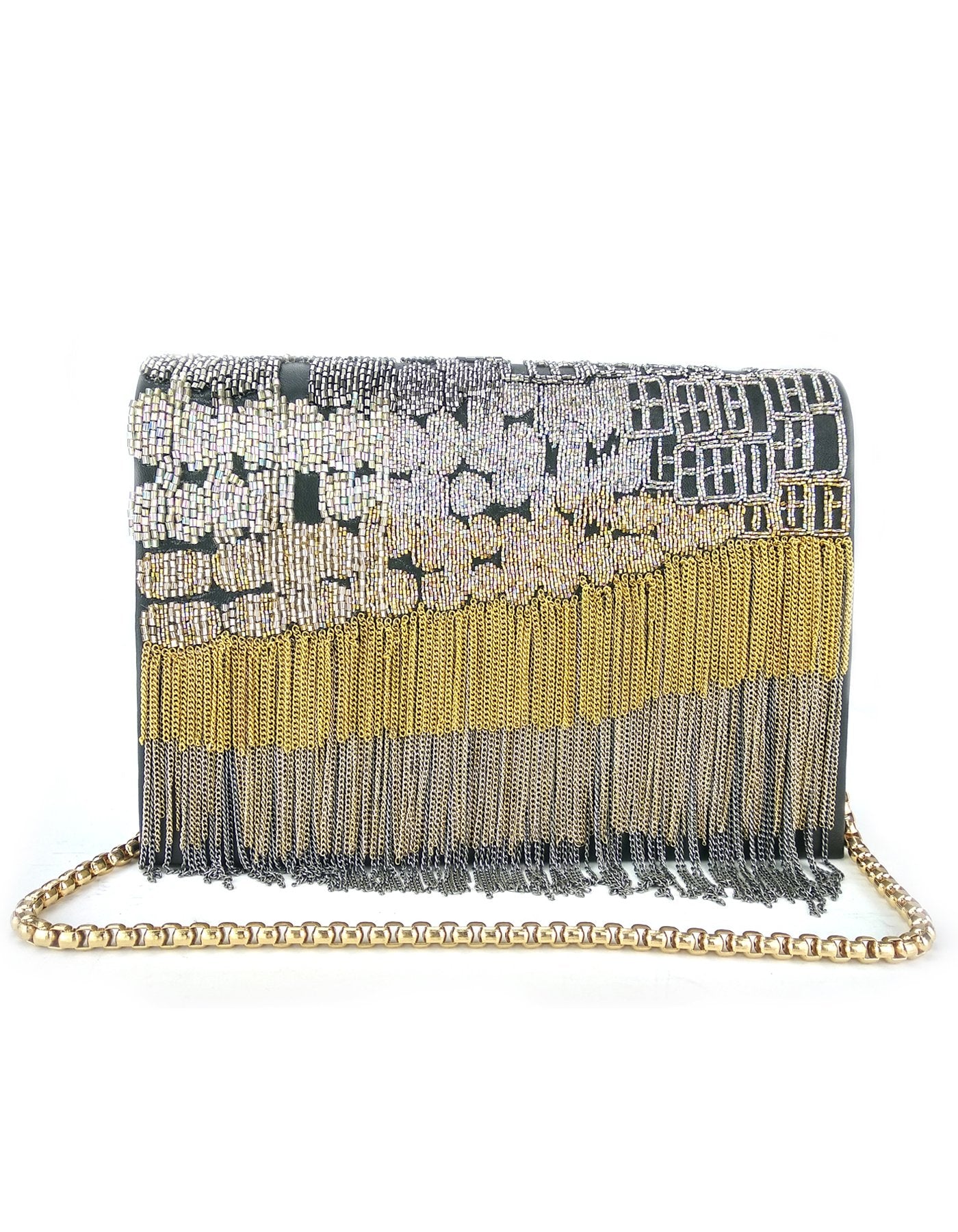 Featuring a Stunning Leather bag in Black color base embellished with Beads & gold silver hanging chains in front of the bag.