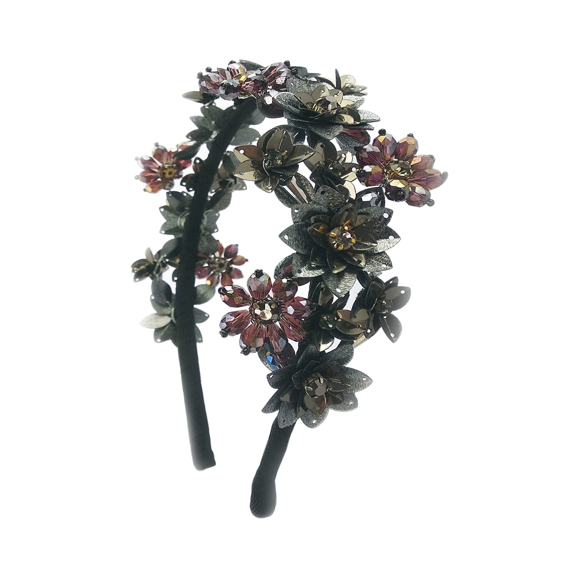 Featuring a Stunning woven hairband with Black metal sequins, crystals and Beads floral work embellishment..