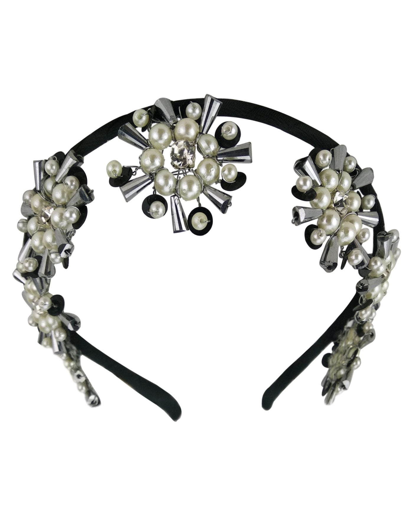 Featuring a Stunning woven hairband with Black & White metal sequins, crystals and Pearls floral work embellishment...