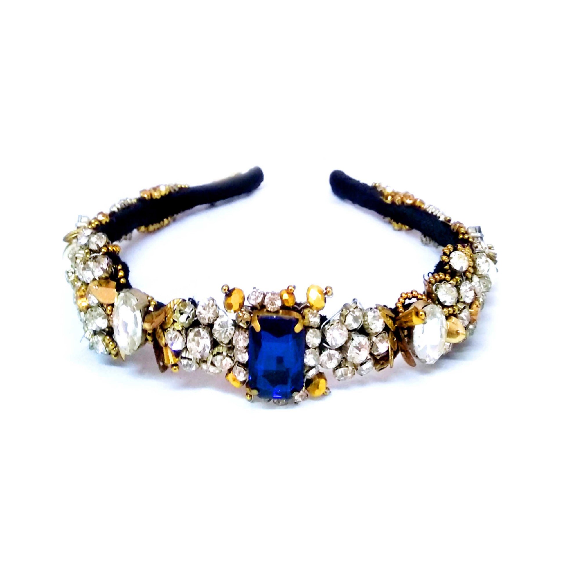 Featuring a hand beaded woven hair band with Blue Gold and Silver crystal stones embellishment.