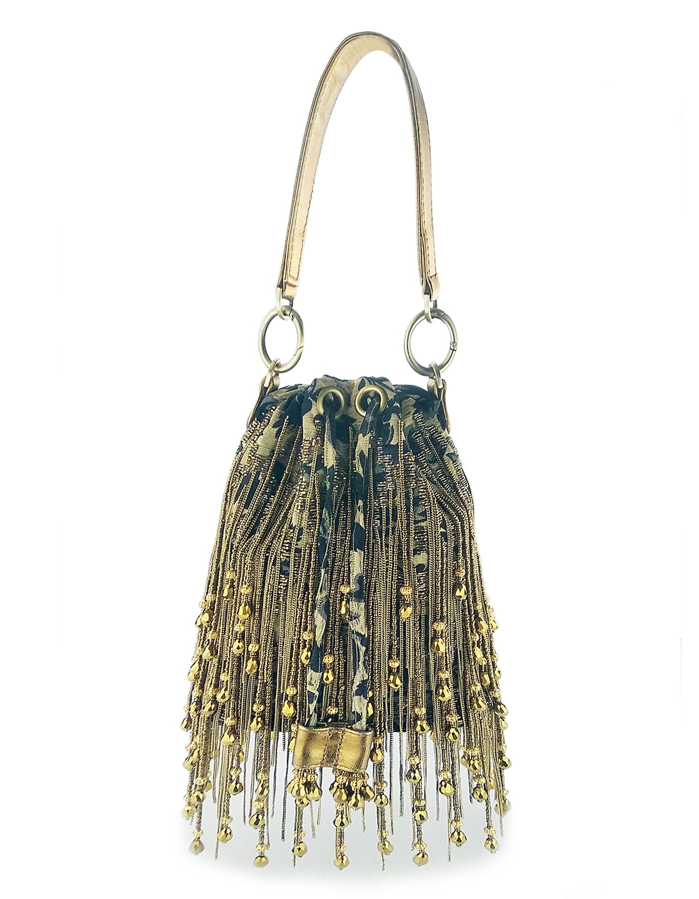 Featuring a Blue & Gold color fabric chain tassels potli bag embellished with beads and chains hanging all over.