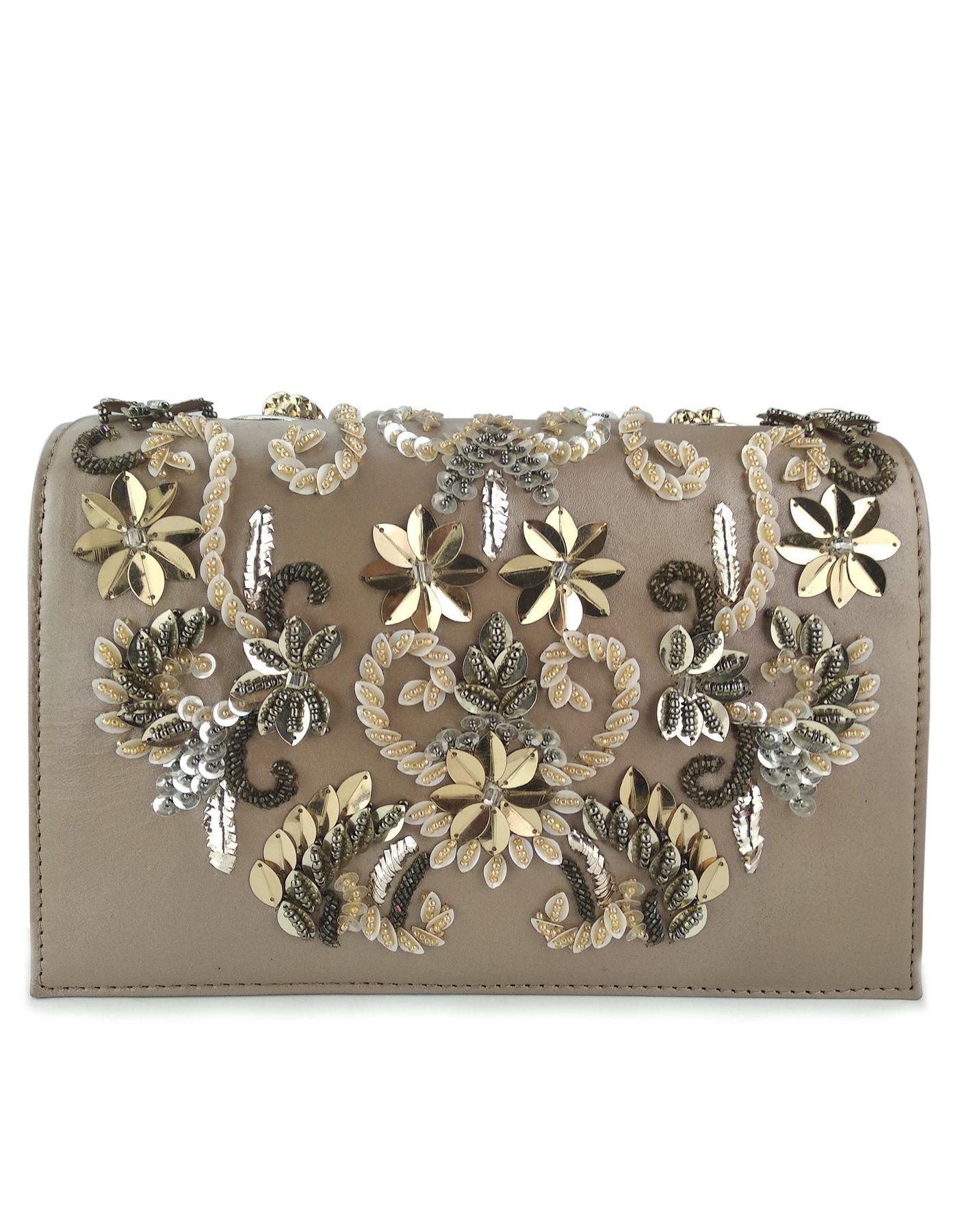 Featuring a Leather Clutch bag in Brown color base embellished with golden metal sequins and beads floral work in front of the bag..
