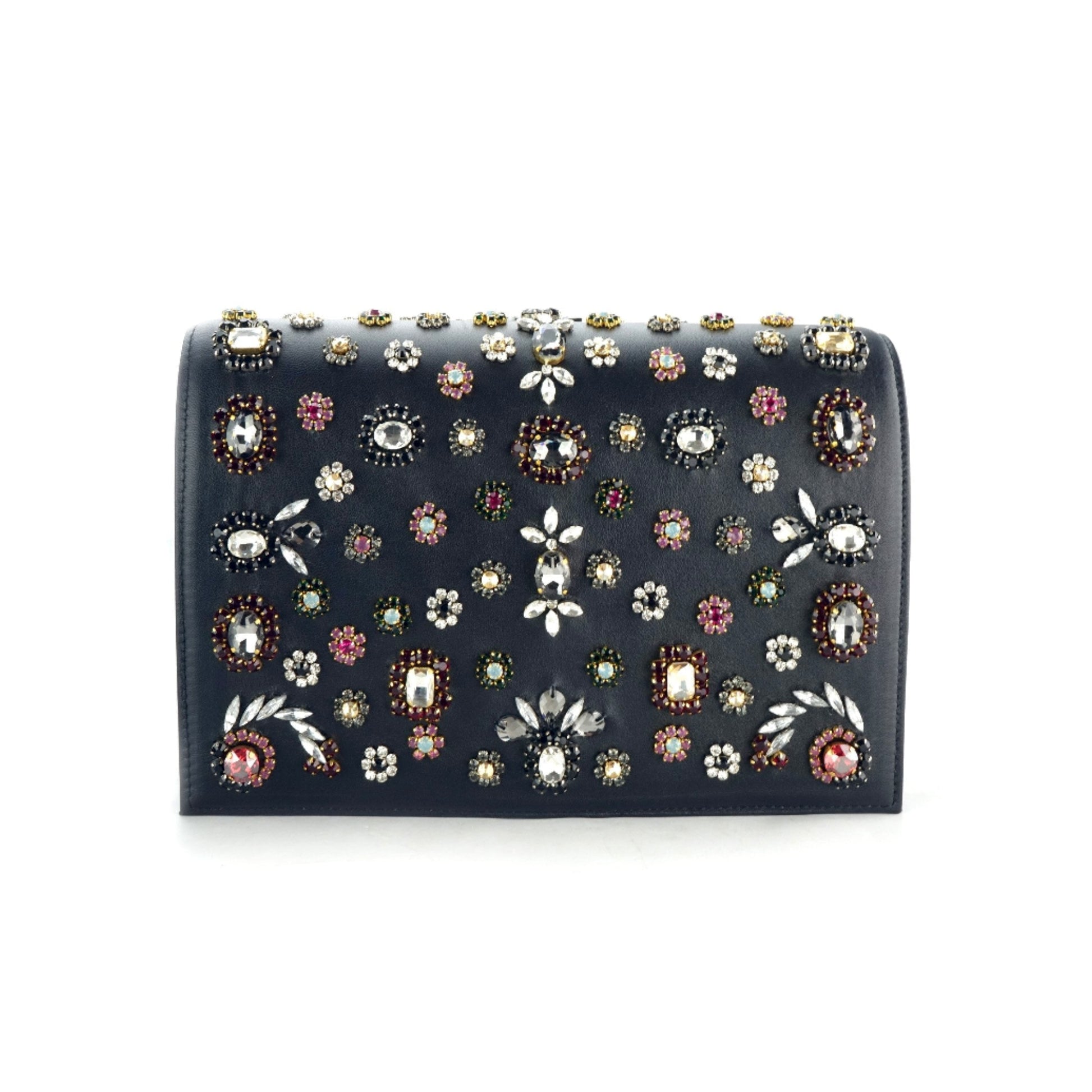 Featuring a Black leather clutch bag. This bag is embellished with crystals on front of the bag, suspended with a adjustable silver sling chain..