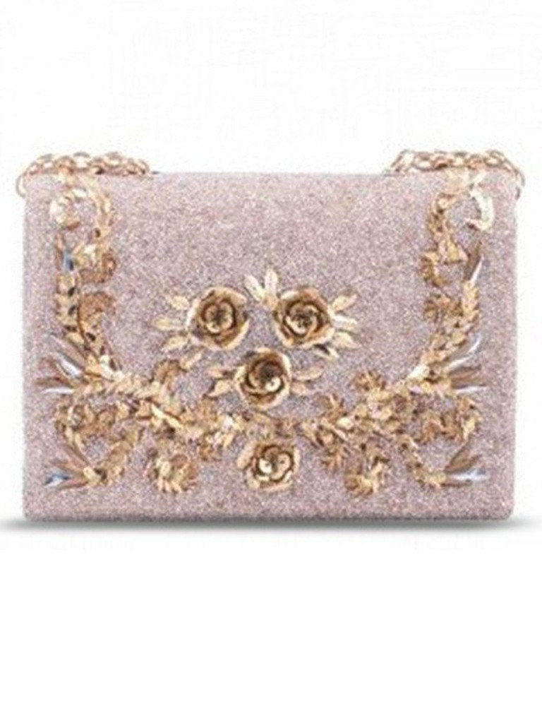 Featuring a hand beaded clutch bag with a gold flowery wreath designed in a trendy way. It comes with a gold adjustable chain and gives a classy look to your ensemble.
