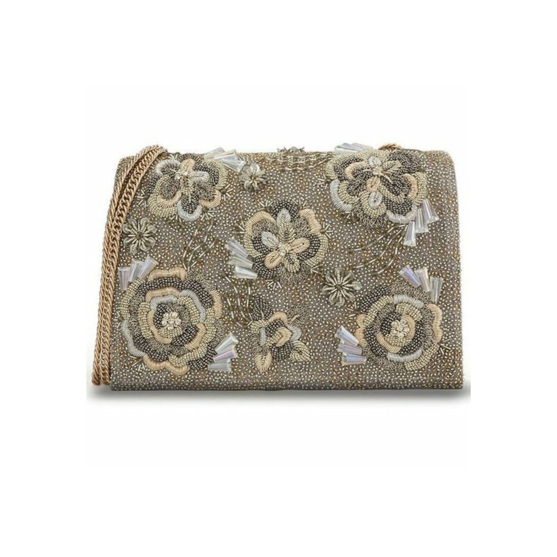 Featuring a grey colored hand beaded clutch bag. This is embellished with gold flower motifs and tiny sequence all over the bag, suspended with a sling chain..