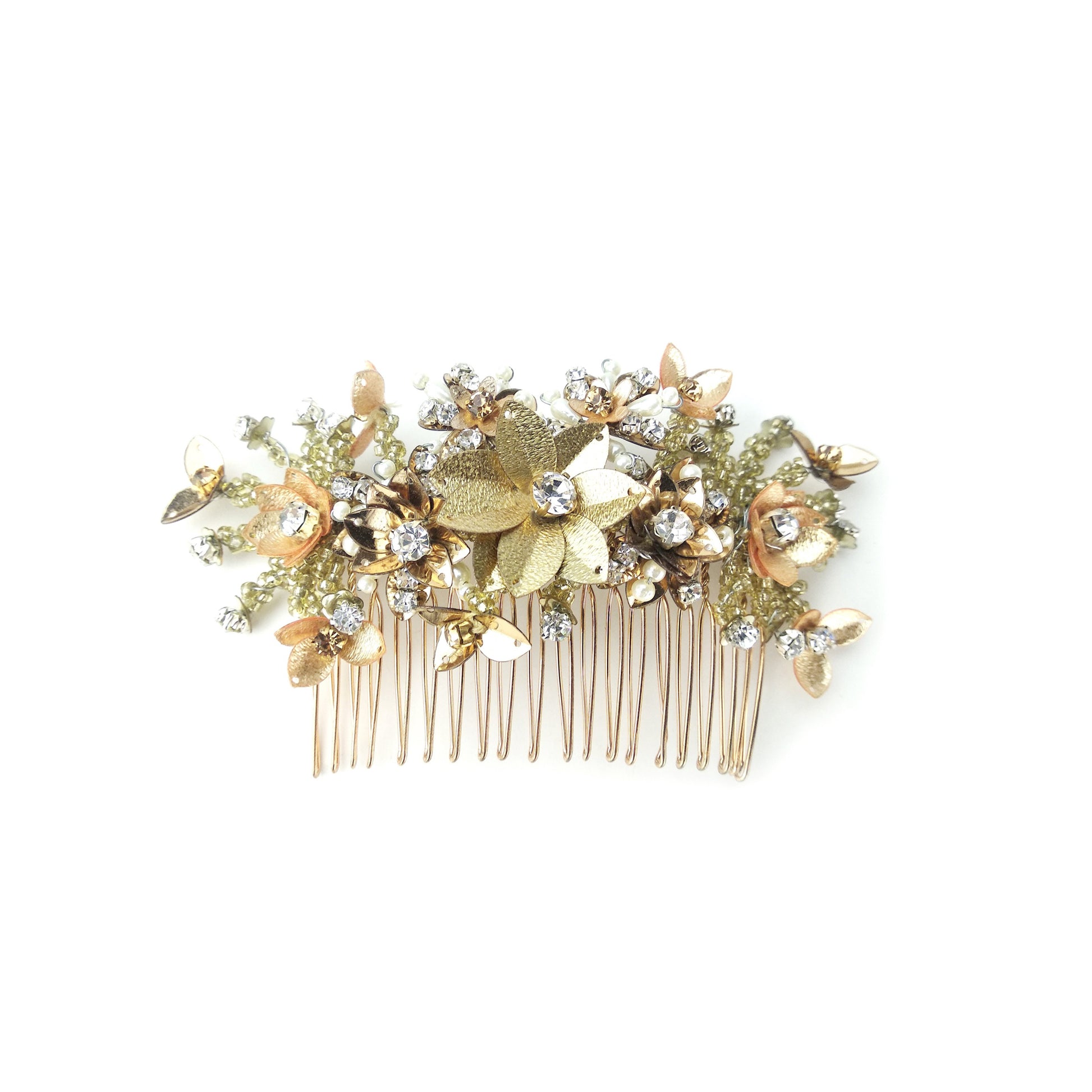 Featuring a Gold Hair Comb hairclip with crystal stones, metal sequins, pearl and beads embellishment, set in steel..