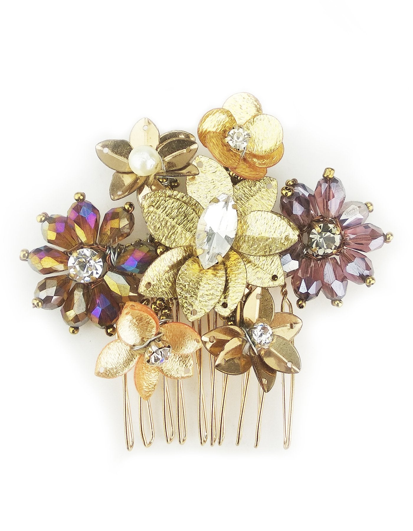 Featuring a Gold floral Hair comb with crystals, metal sequins and beads embellishment set in steel.