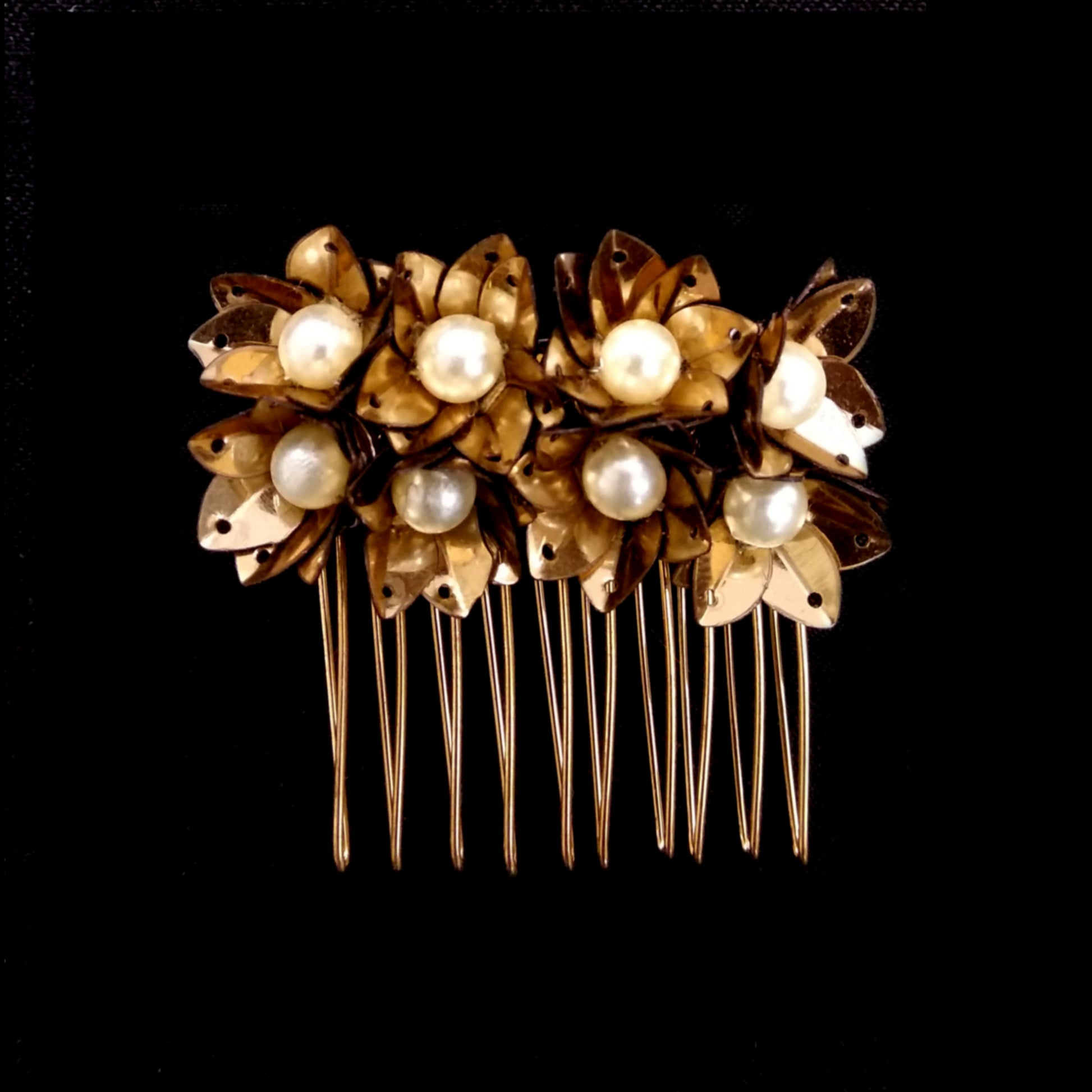Featuring a Gold color Hair Comb with Pearls and metal sequins embellishment, set in steel.