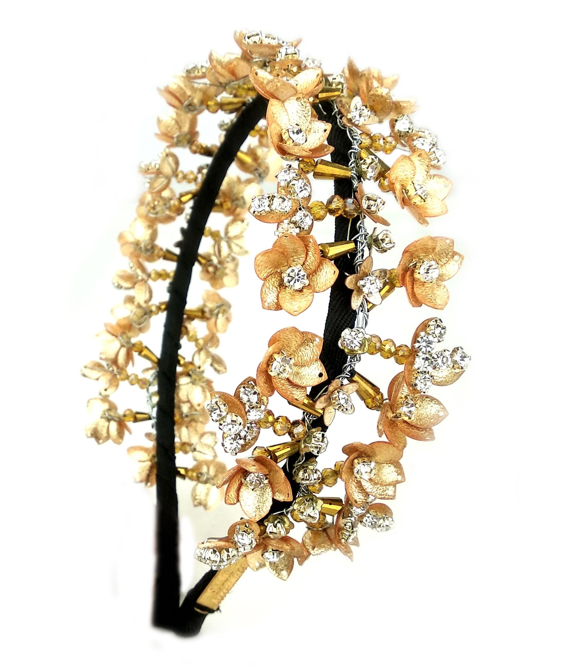 Featuring a woven hairband with Gold metal sequins, crystals and beads floral work embellishment.